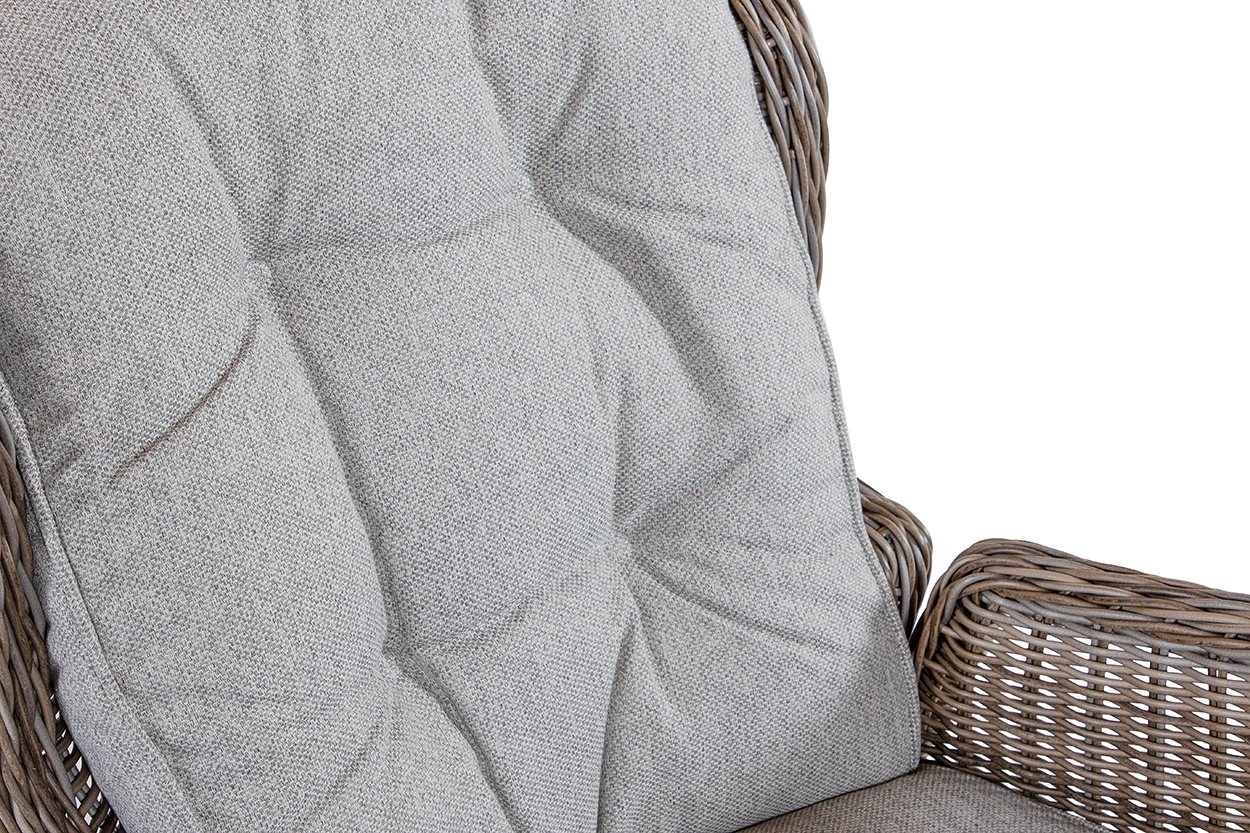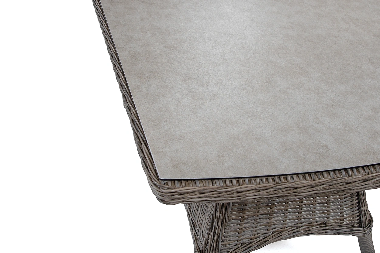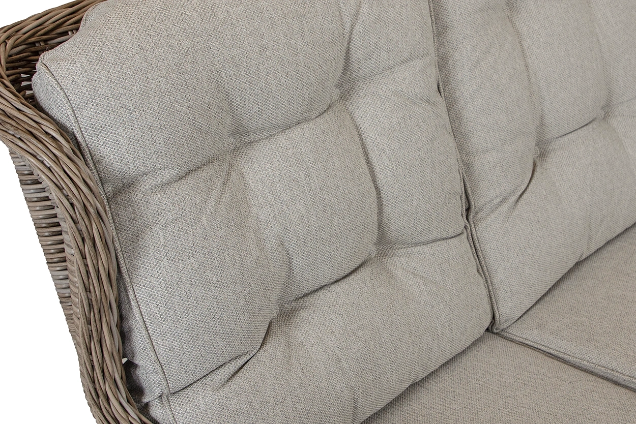 Gruppen är tillverkad i tålig drivvedsfärgad konstrotting med aluminiumstomme. Hög rygg på soffan samt lite högre soffbord gör gruppen bekväm både för att äta vid och slappa i. Linfärgade polyesterdynor ingår. Bordet har en 3D-tryckt bordsskiva av glas.