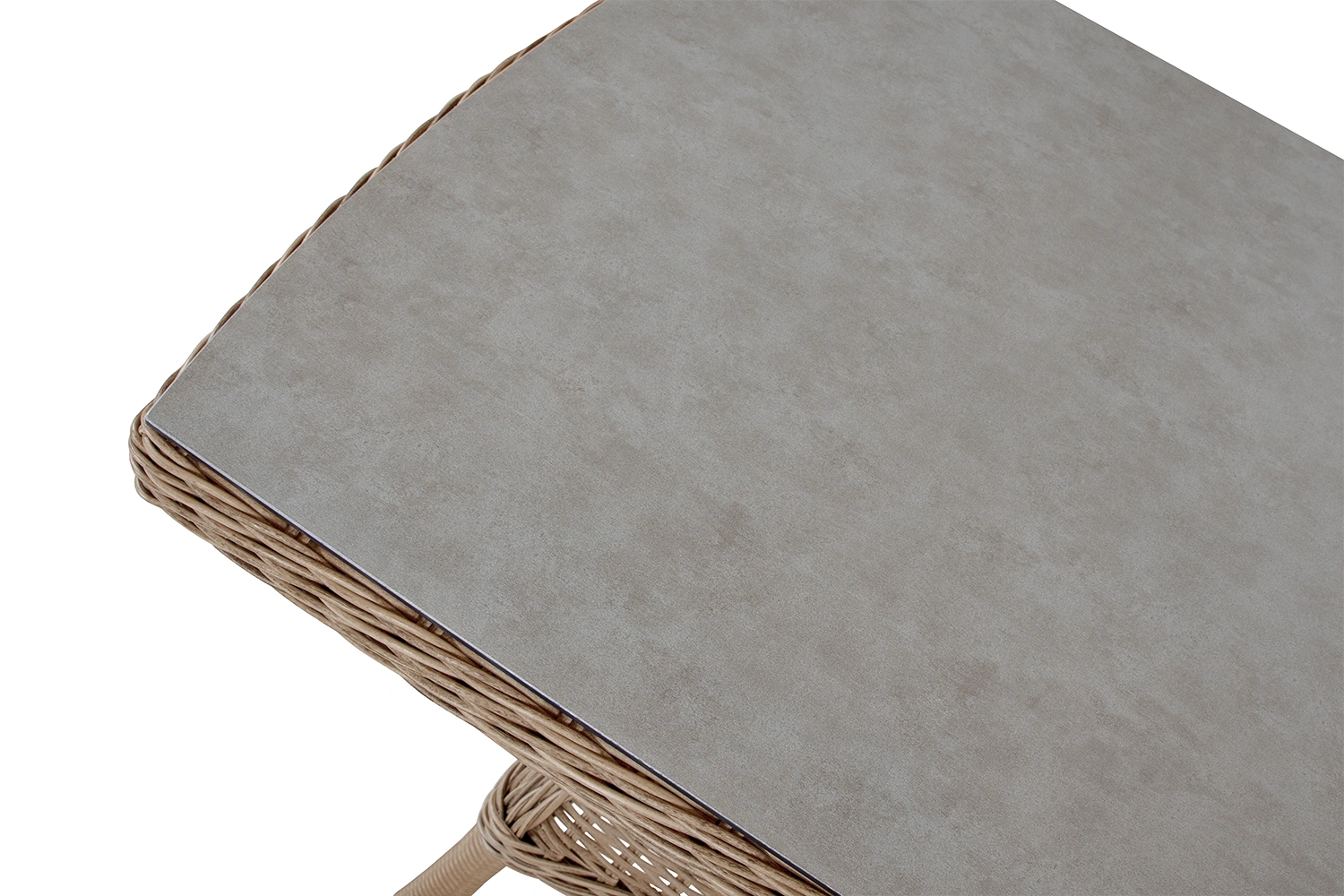 Gruppen är tillverkad i tålig naturfärgad konstrotting med aluminiumstomme. Hög rygg på soffan samt lite högre soffbord gör gruppen bekväm både för att äta vid och slappa i. Beige allvädersdynor ingår. 3D-tryckt bordsskiva av glas.