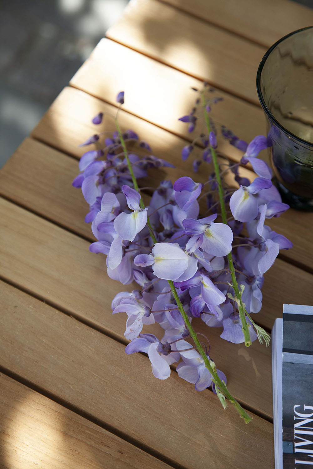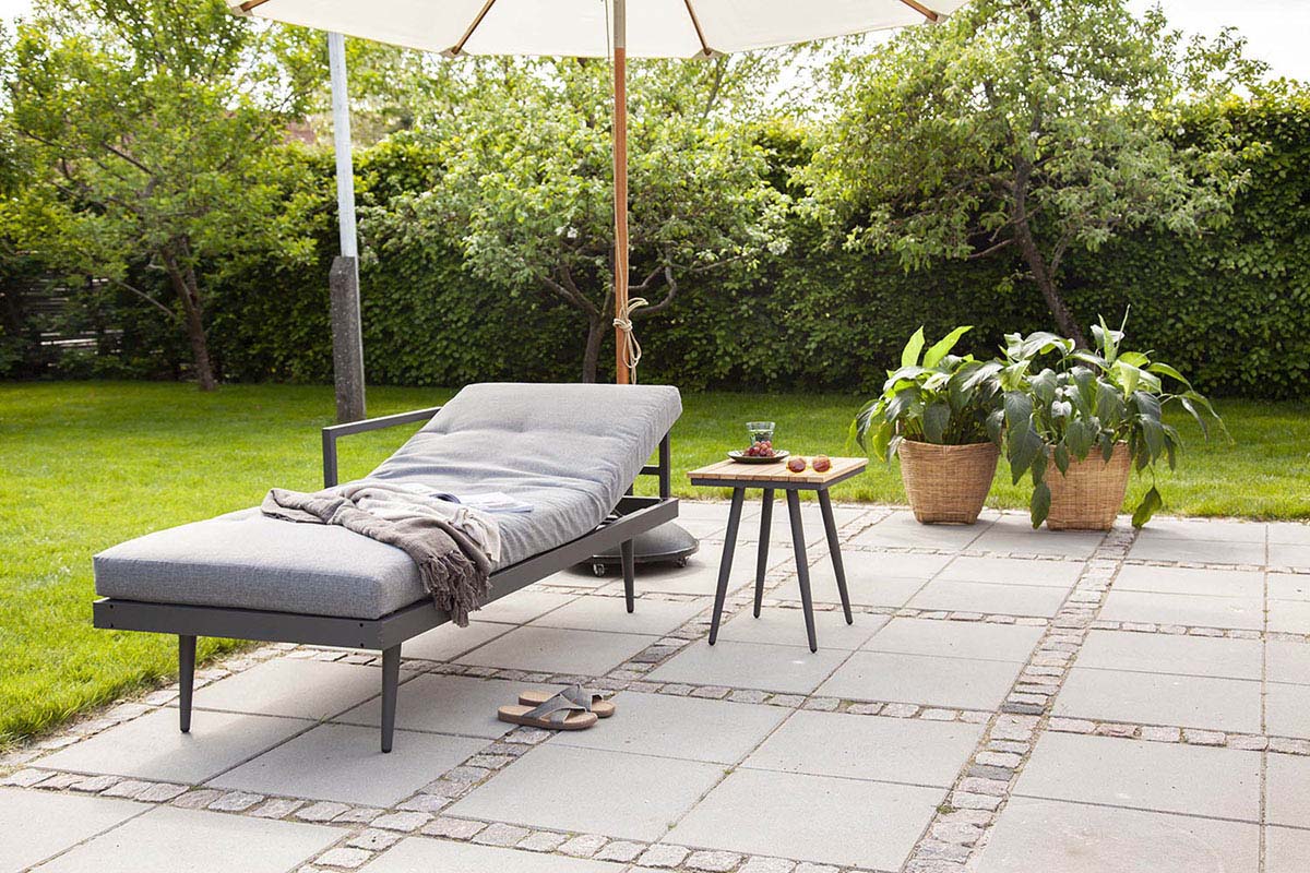 Rio är ett stilrent sidobord med en vacker bordsskiva i teak och stomme i antracitgrå aluminium.