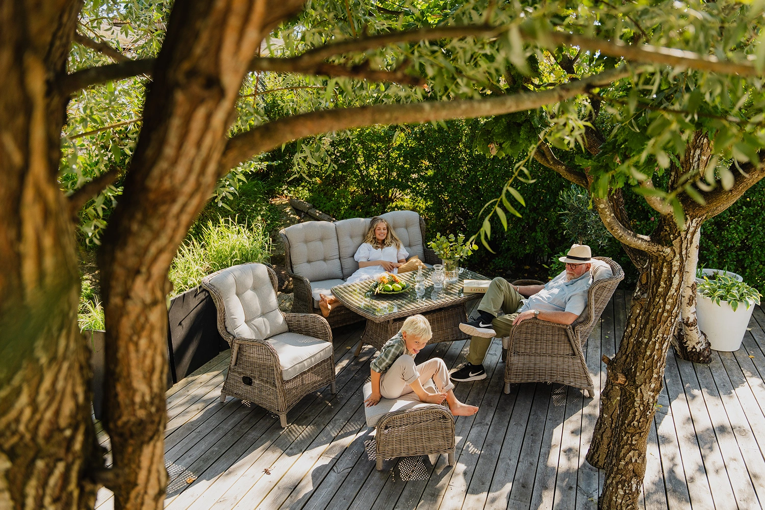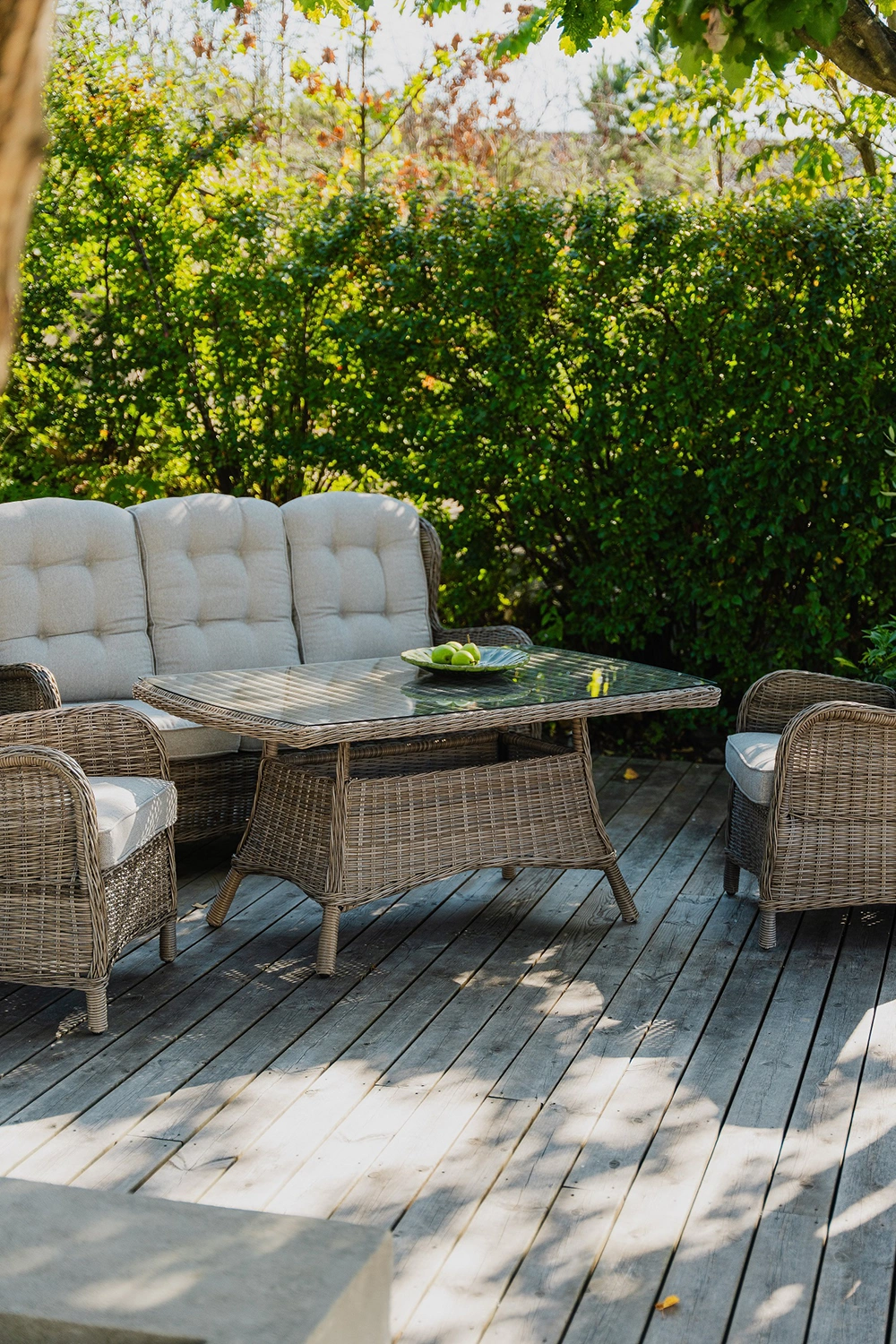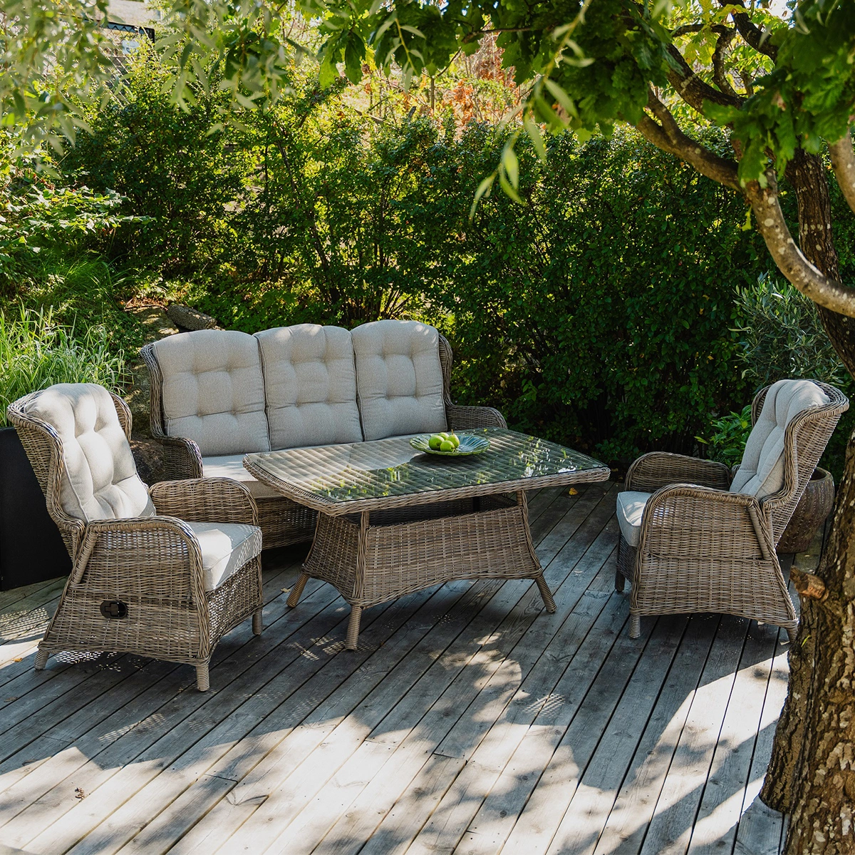 Atleves populära Rio soffgrupp med ställbara fåtöljer, soffa och soffbord. En bekväm och prisvärd grupp tillverkad i tålig drivvedsfärgad konstrotting med aluminiumstomme. Hög rygg på fåtöljer och soffa samt lite högre soffbord gör gruppen bekväm både för att äta vid och slappa i.