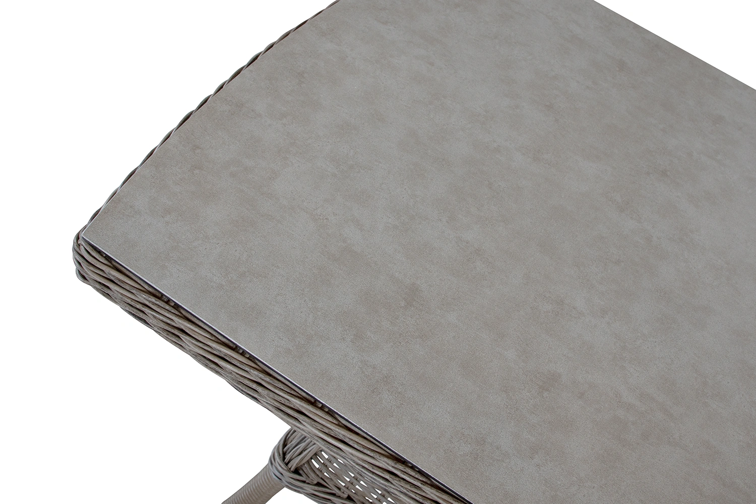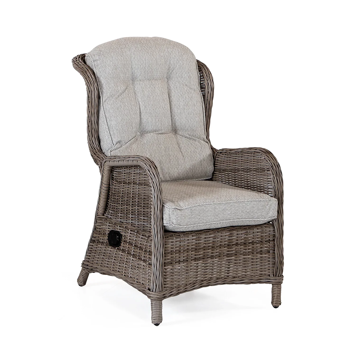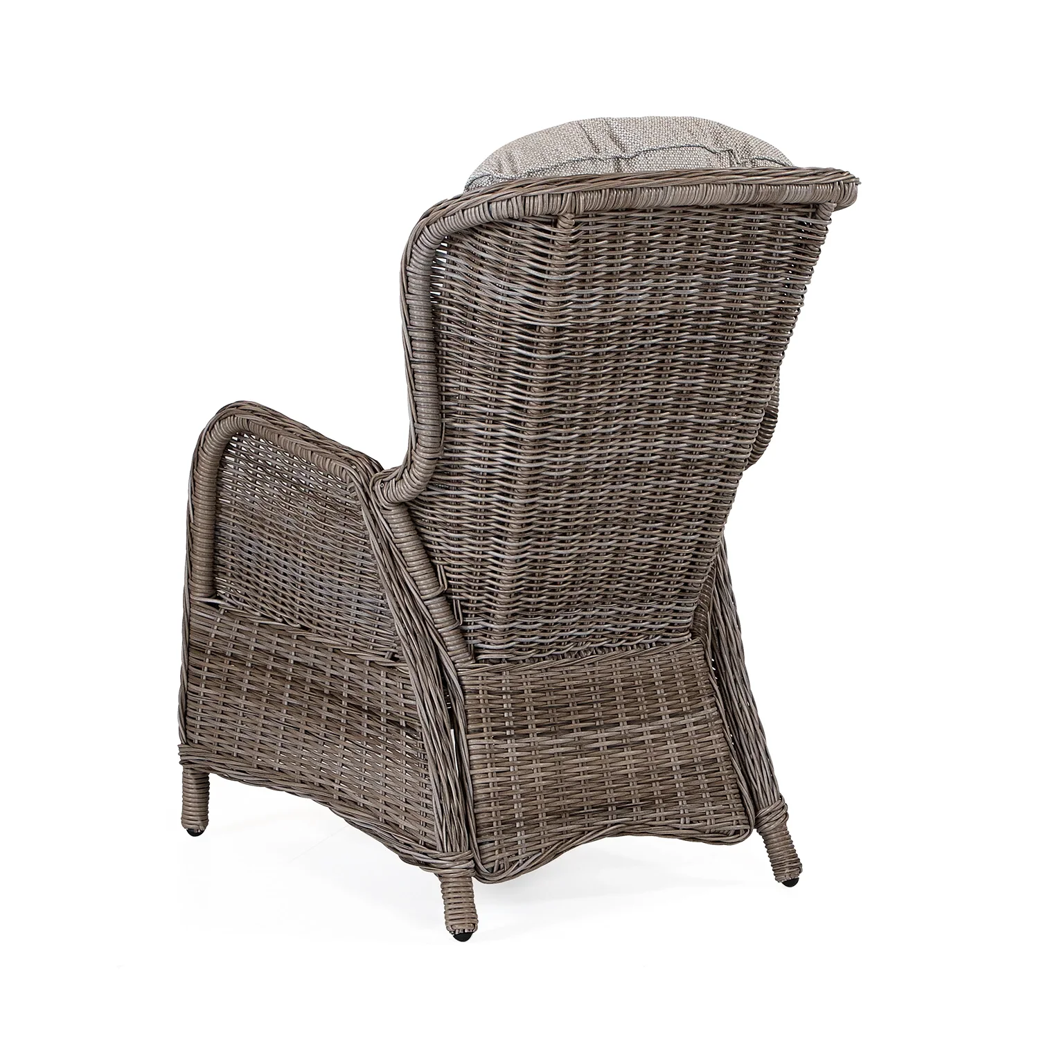Atleves populära Rio soffgrupp med ställbara fåtöljer, soffa och soffbord. En bekväm och prisvärd grupp tillverkad i tålig drivvedsfärgad konstrotting med aluminiumstomme. Hög rygg på fåtöljer och soffa samt lite högre soffbord gör gruppen bekväm både för att äta vid och slappa i.