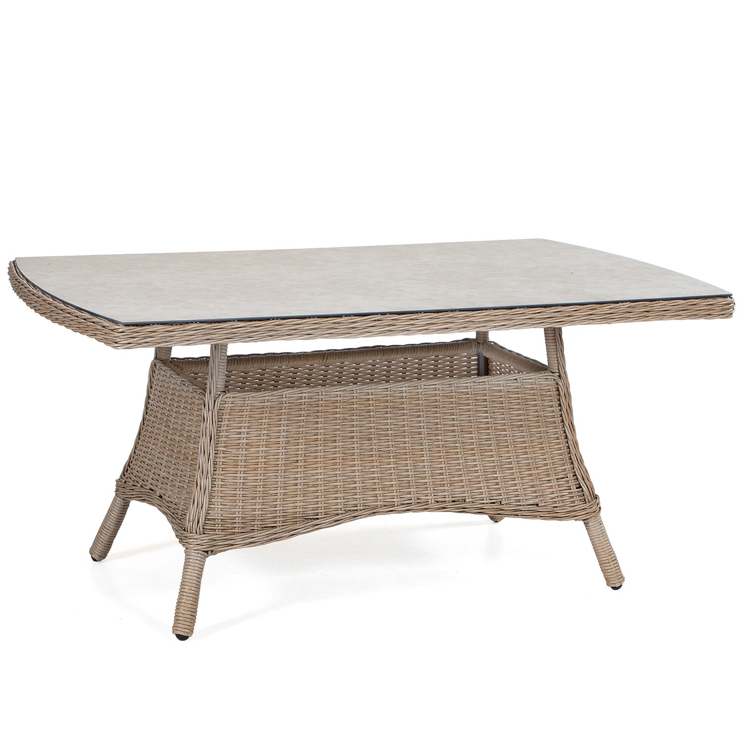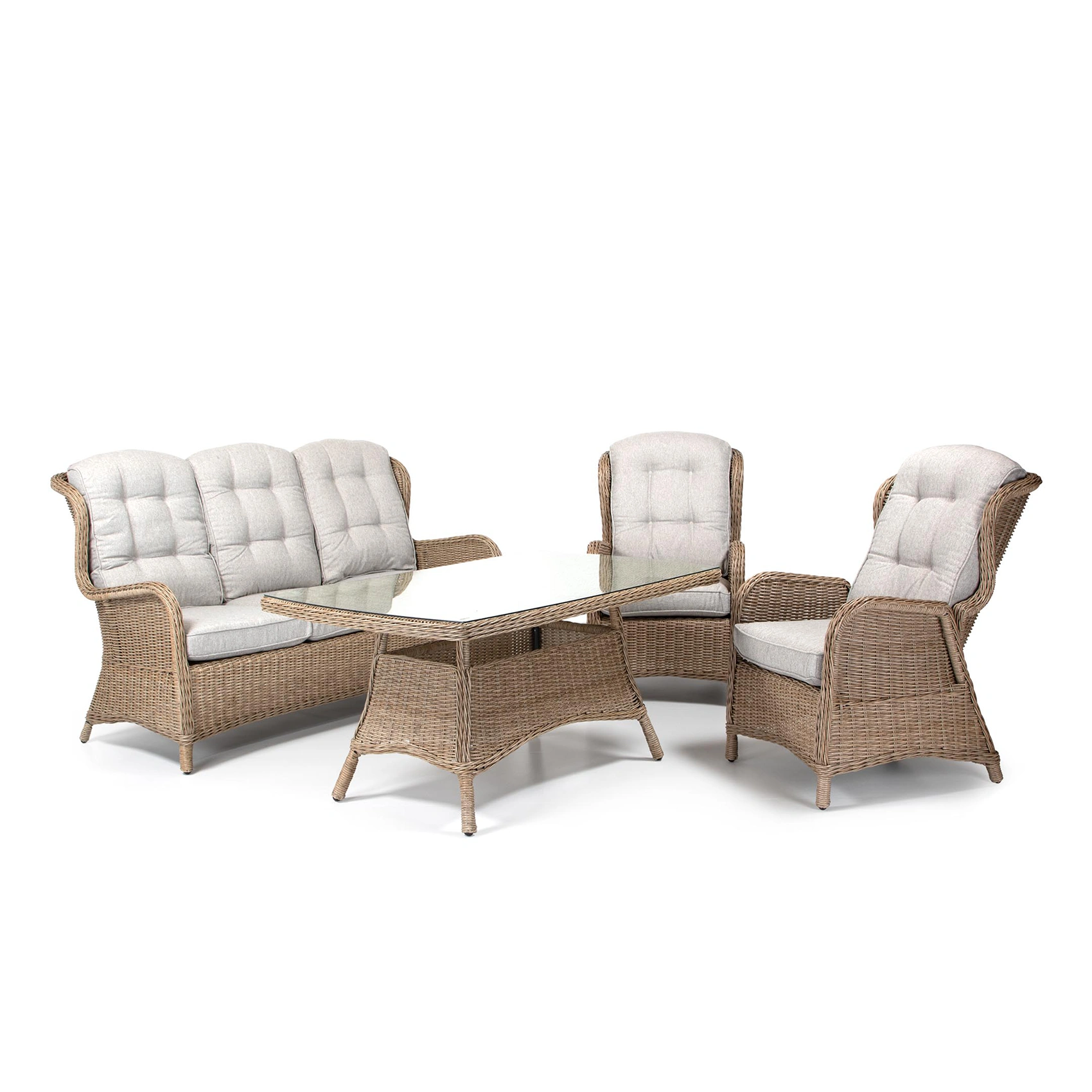 Rio soffgrupp i naturfärgad konstrotting med beige allvädersdynor är en bekväm och stilren möbelgrupp för uteplatsen. Gruppen består av två ställbara fåtöljer, en 3-sitssoffa och ett högre soffbord – allt designat för att ge både avslappning och funktion. Den naturinspirerade färgskalan skapar en varm och inbjudande atmosfär som passar i både moderna och klassiska trädgårdsmiljöer.