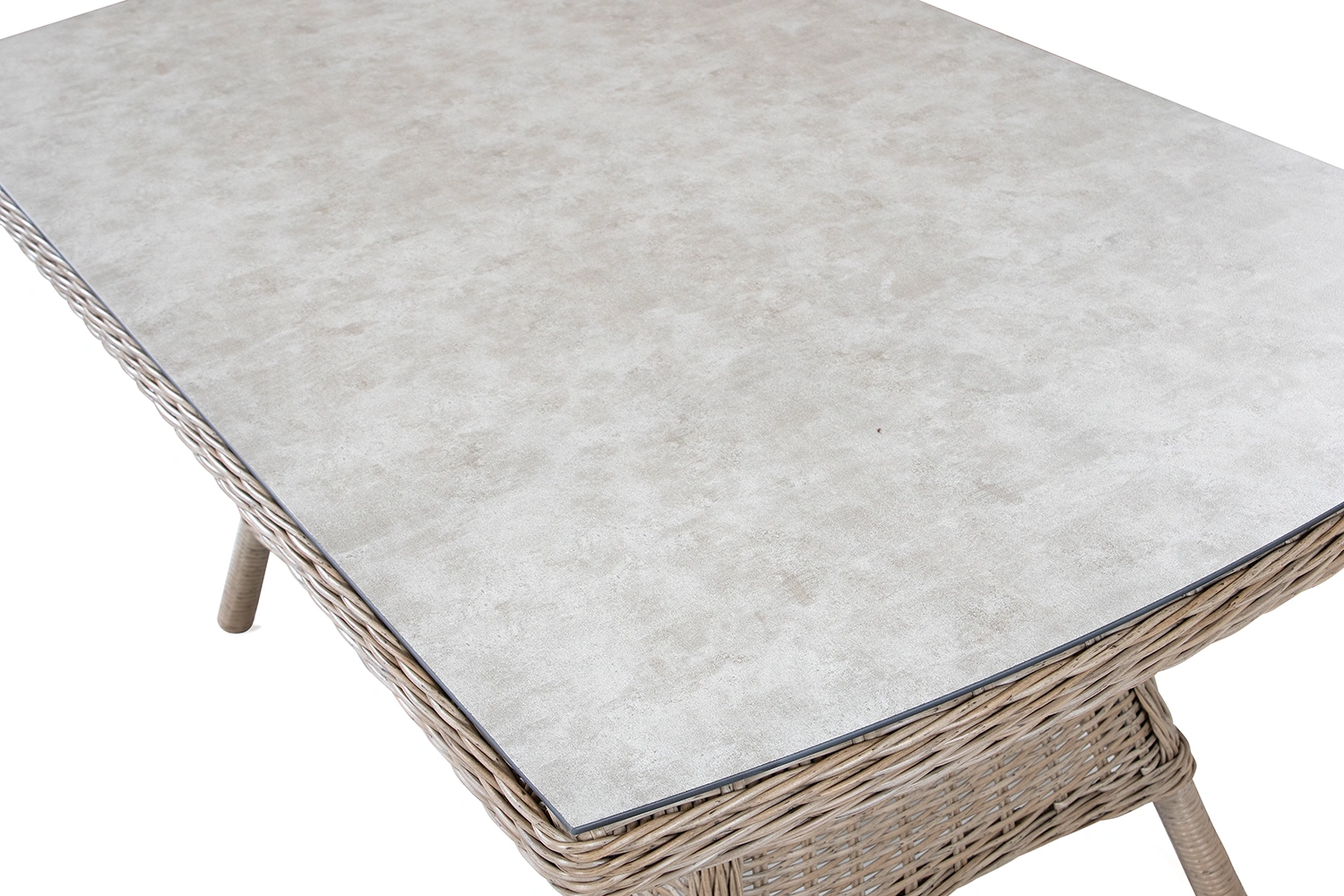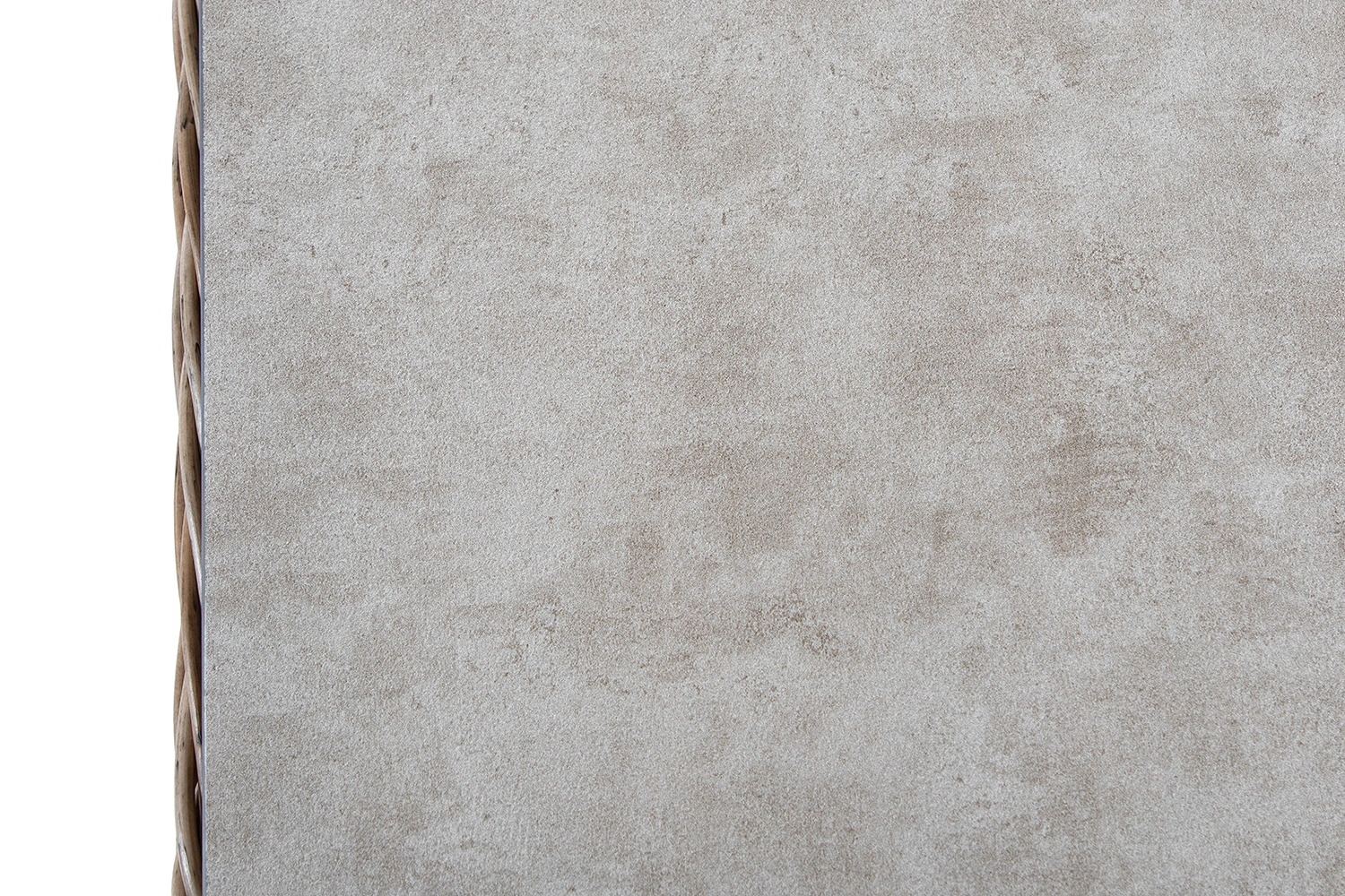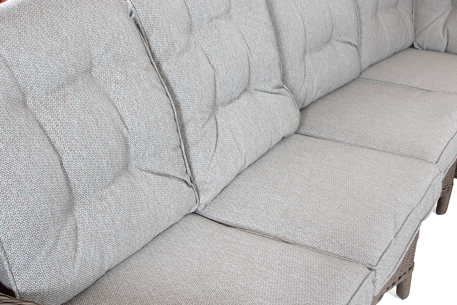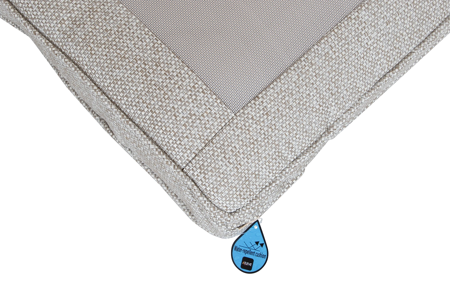 Stommen är tillverkad i lätt och rostfri aluminium, klädd med slitstark konstrotting som tål väder och vind. Dynorna är beige allvädersdynor med liner – ett innerhölje som skyddar stoppningen mot fukt och smuts. Allvädersdynor är utvecklade för att tåla regn och sol, och torkar snabbt efter väta.