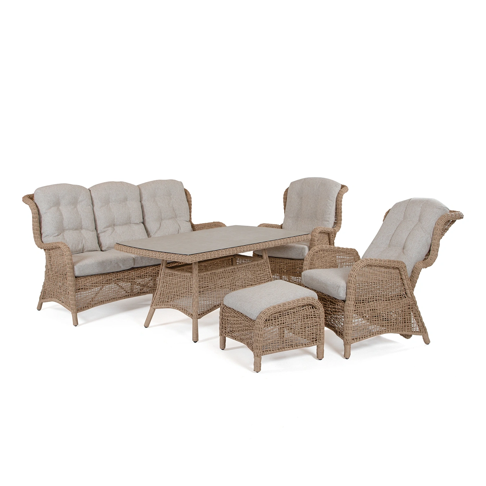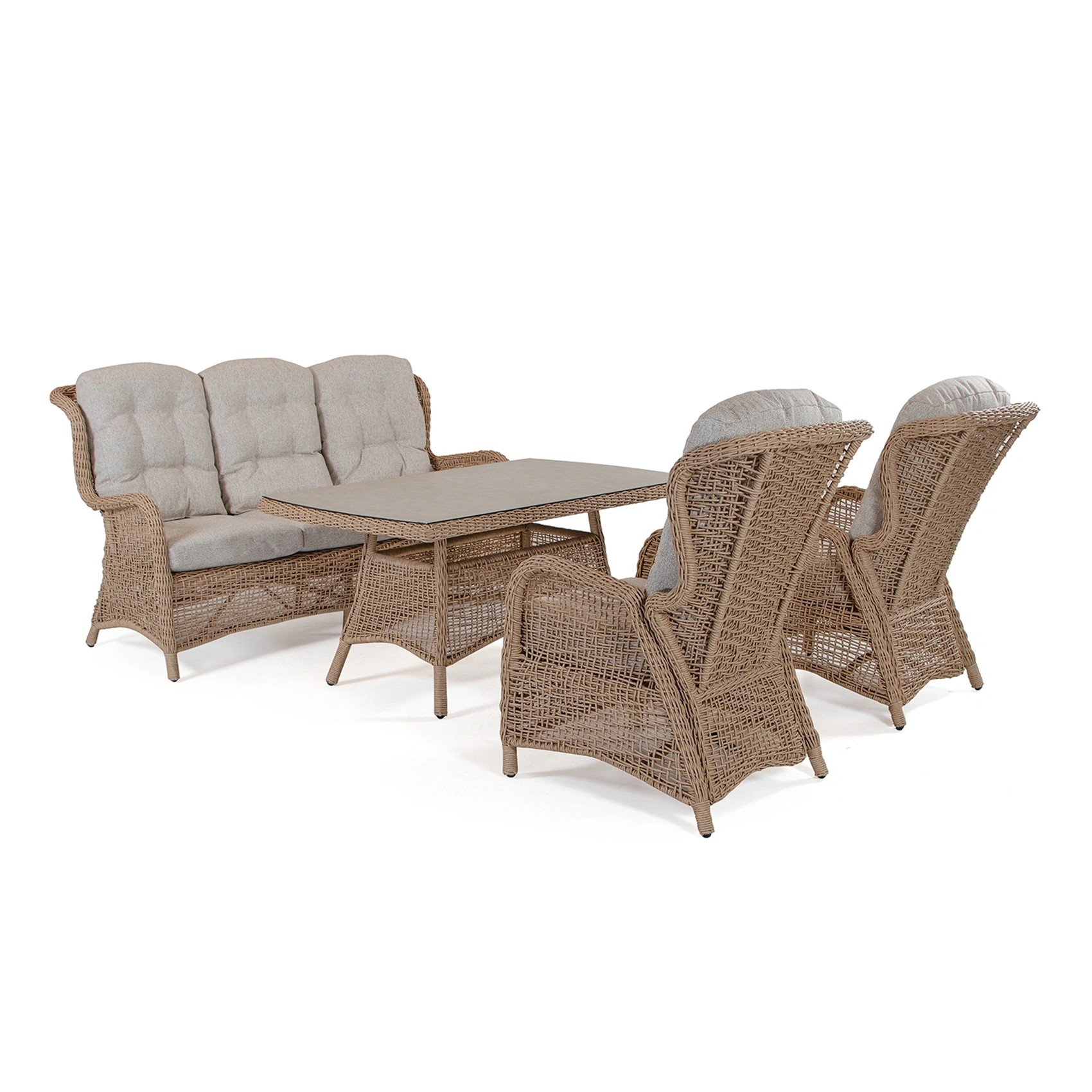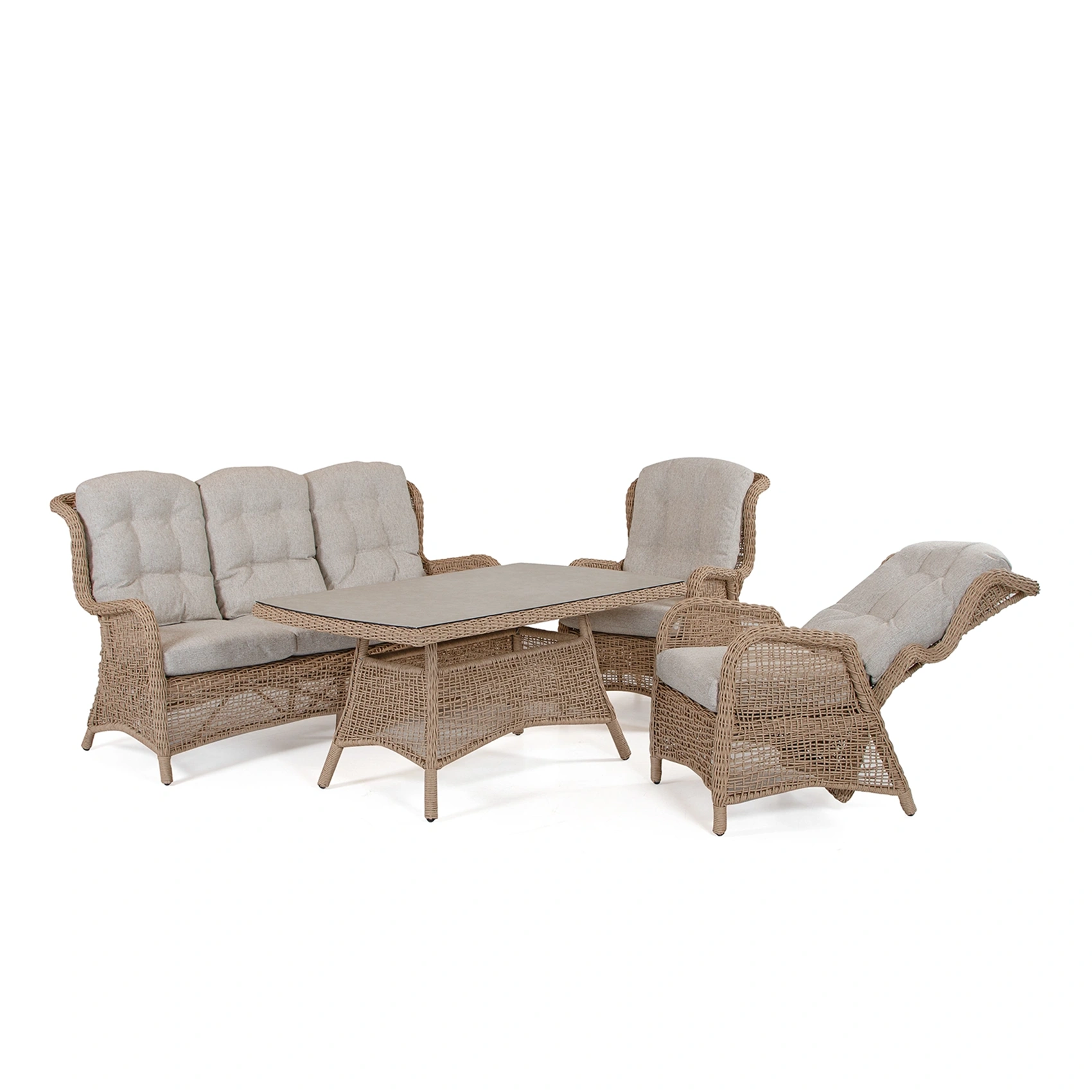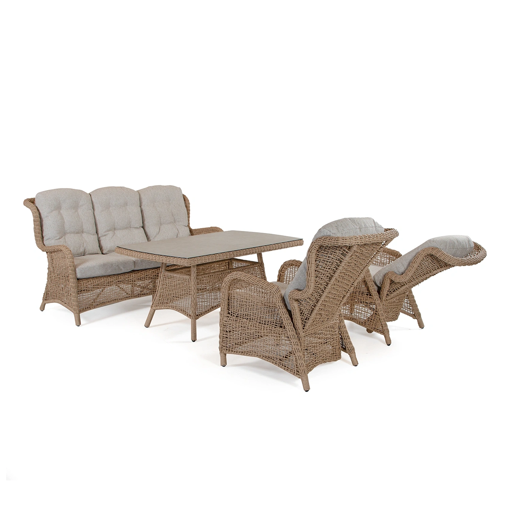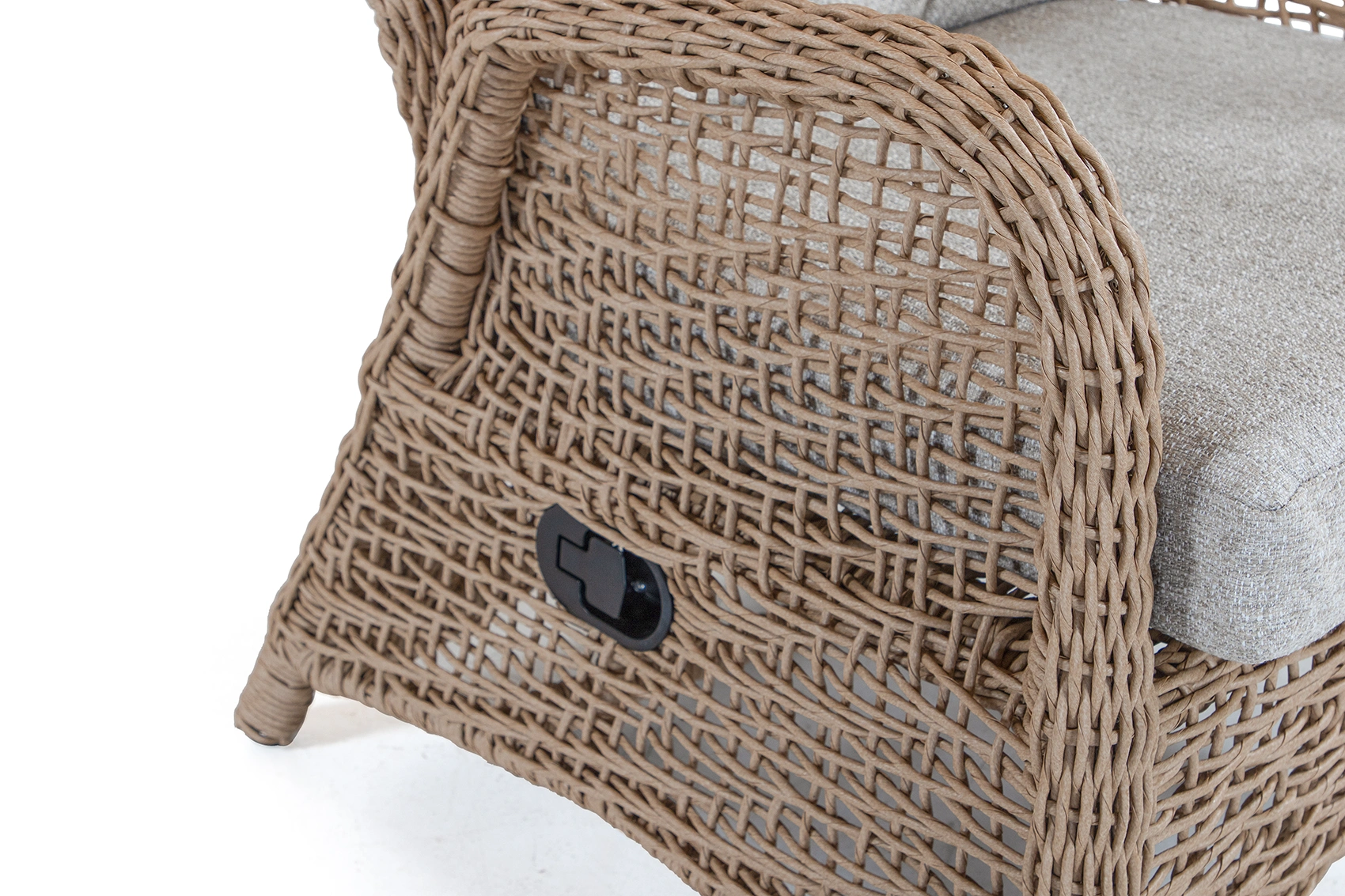 Atleves populära Rio soffgrupp med ställbara fåtöljer, soffa och soffbord. Gruppen är tillverkad i naturfärgad twist-flätad konstrotting som ger möbeln en levande struktur med variation i både riktning och täthet. Flätningen skapar ett luftigt uttryck samtidigt som den behåller en stabil form. Hög rygg på fåtöljer och soffa samt lite högre soffbord gör gruppen bekväm både för att äta vid och slappa i.