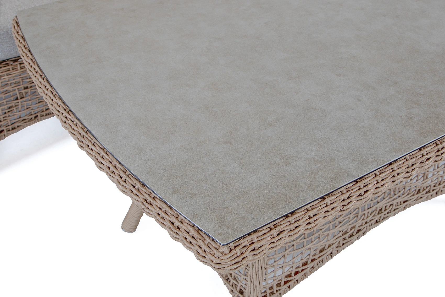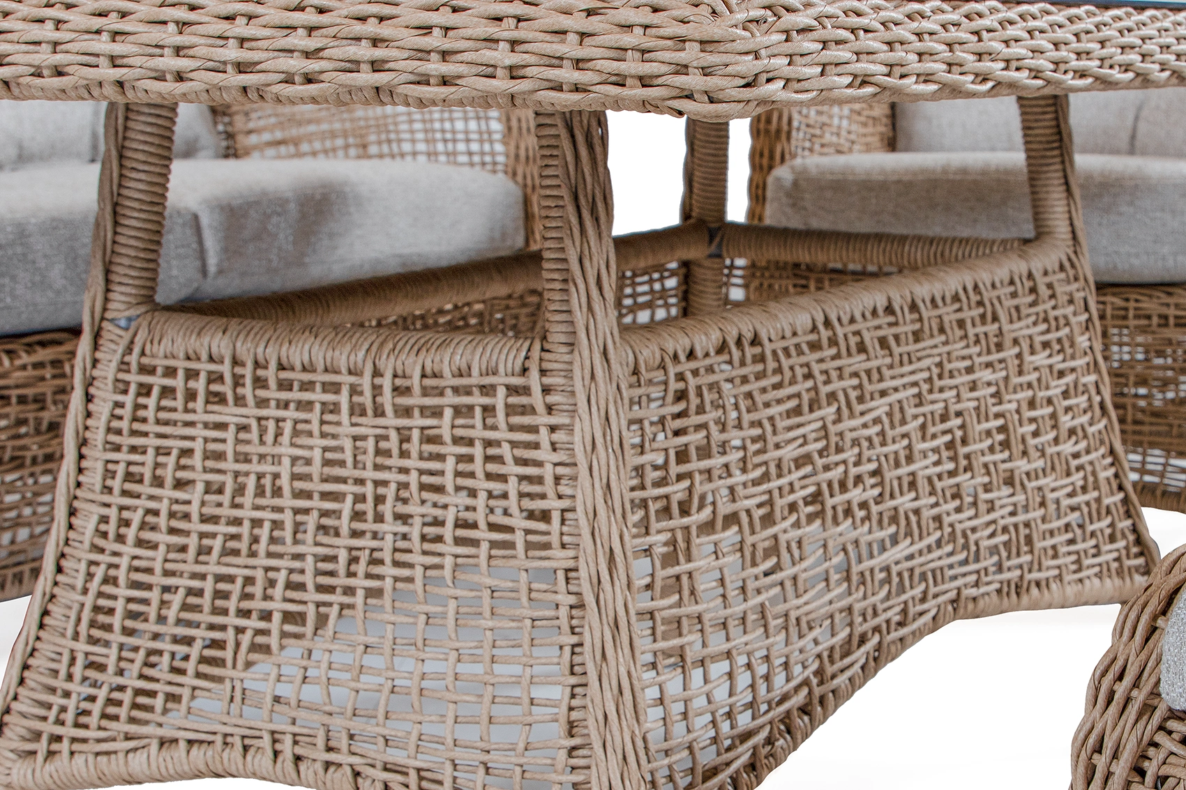 Rio-gruppen är lika funktionell som estetisk. Den naturfärgade konstrottingen ger ett varmt och organiskt uttryck, medan de beiga bouclé-dynorna tillför en mjuk kontrast. Gruppen passar utmärkt i gröna trädgårdar, på trädeck eller i uterum med ljusa textilier. Tack vare de ställbara ryggarna på fåtöljerna kan du enkelt skapa en personlig sittställning.