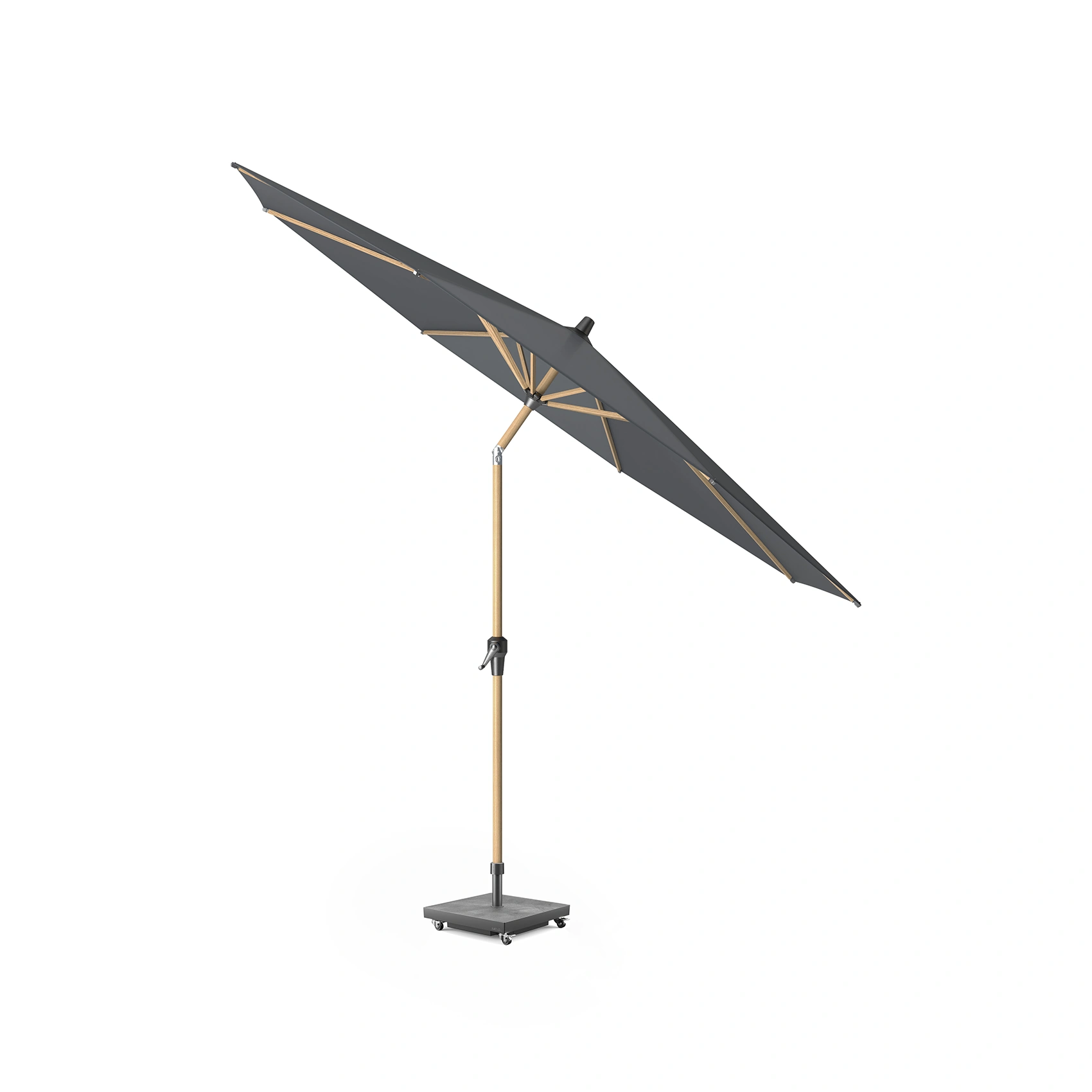 Parasollet levereras utan parasollfot. Vi rekommenderar en parasollfot på minst 40 kg. Vi rekommenderar en parasollfot Platinum Sun & Shade. Många av dessa är försedda med hjul och har en design som matchar parasollet. Du hittar matchande parasollfötter längre ner på sidan.