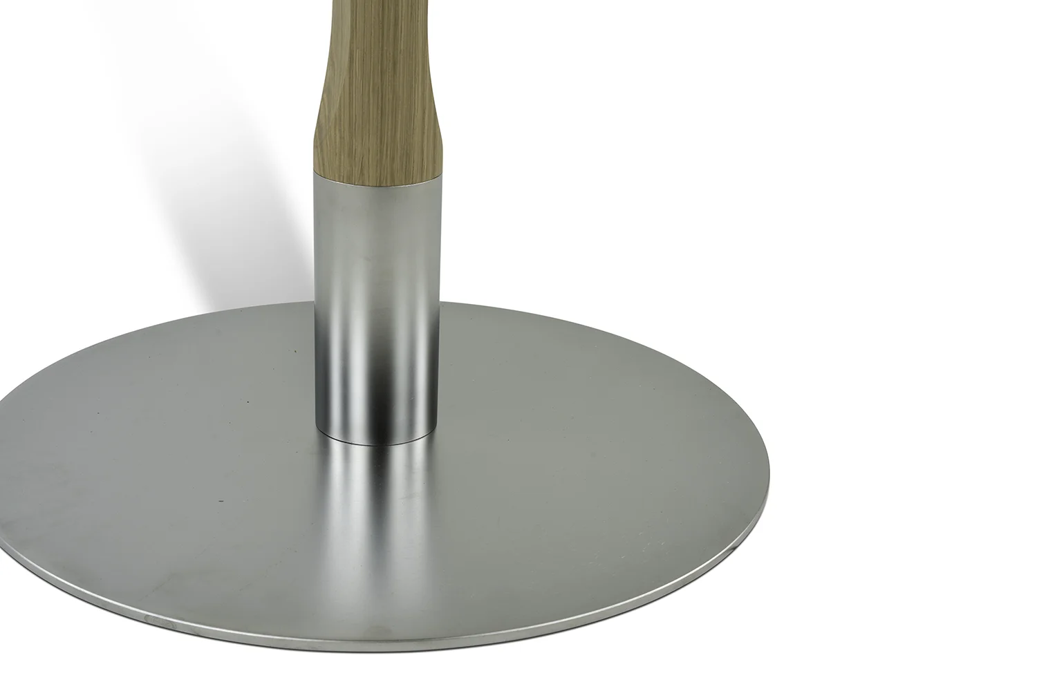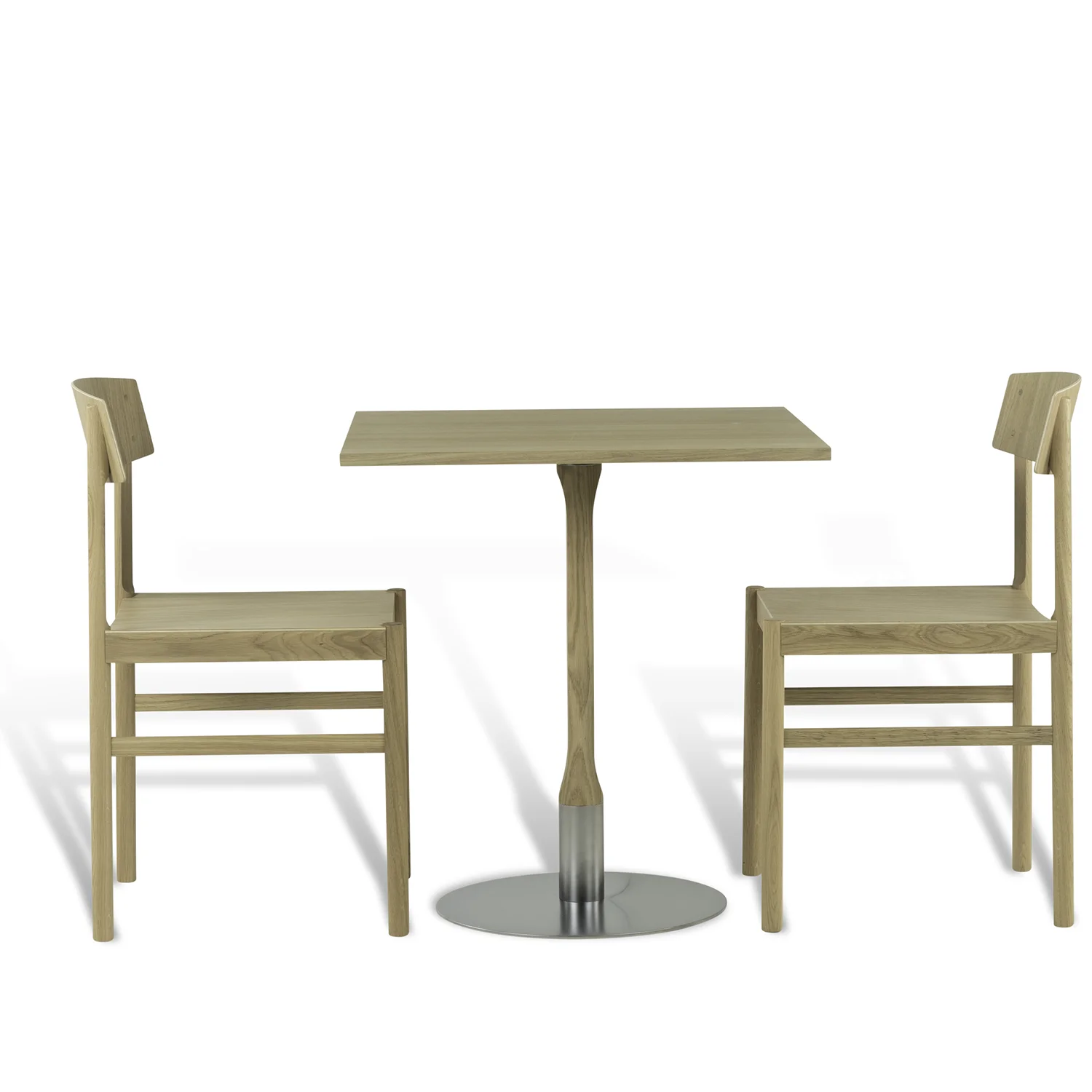 Rod cafébord med samma vackra detaljer som hos stolen med infräsning i det massiva benet. Metallbas som blir en vacker övergång och ger trygg stabilitet och tyngd i bordet. Till det lilla kökshörnet eller stora restaurangen.