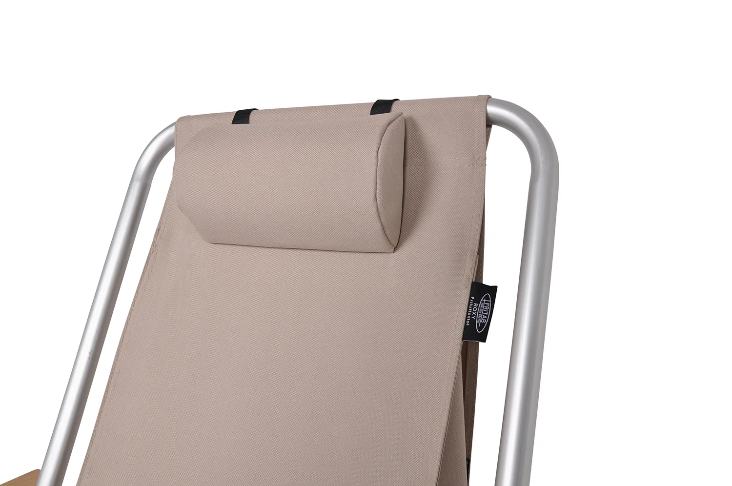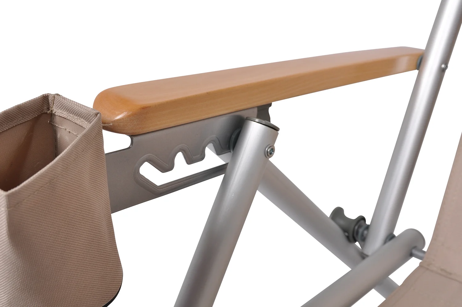 Tillverkad i aluminium med kraftigt polyestertyg och handtag i trä. Finns i flera färger.