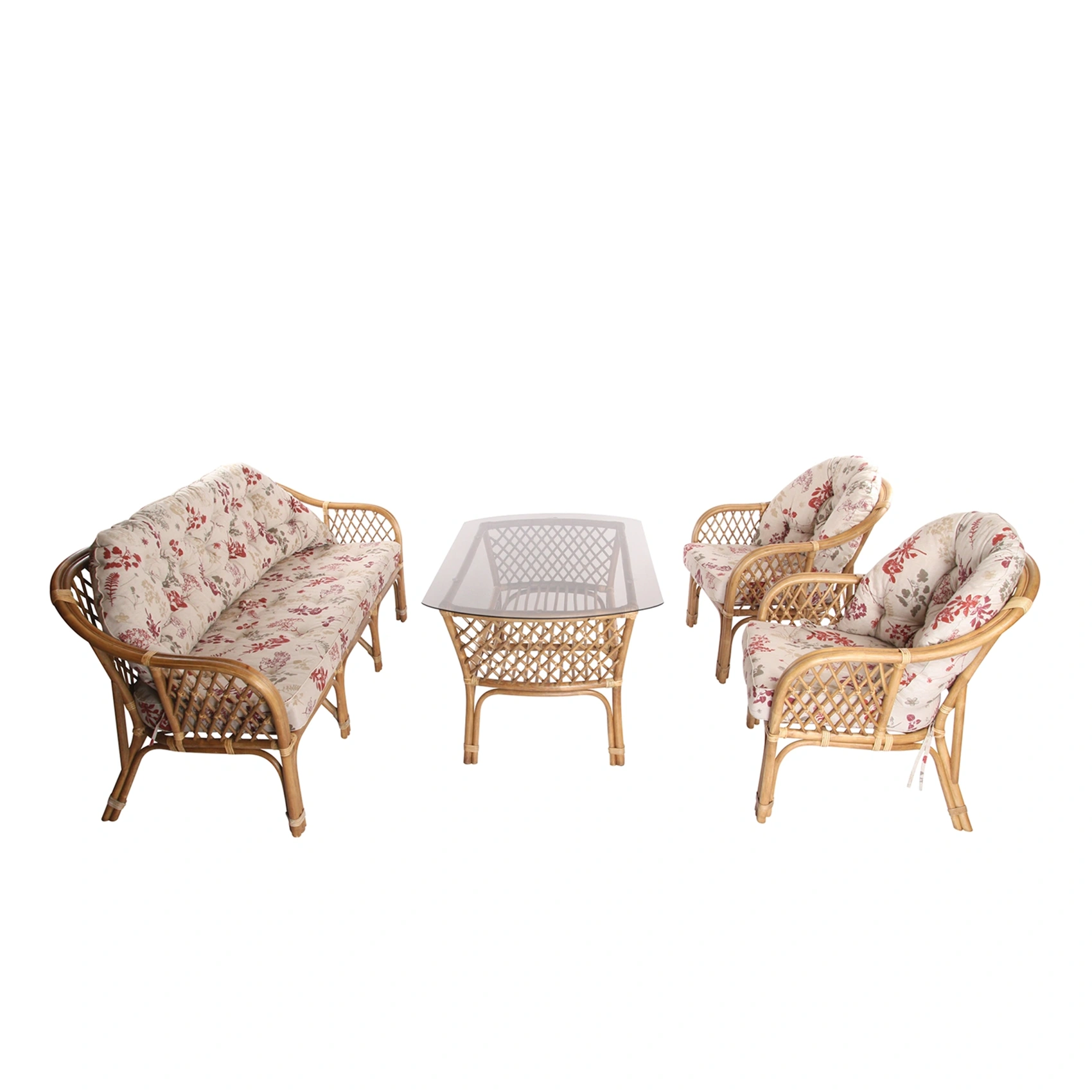 Rottingen är brunlaserad. Dynorna finns i flera olika färger och material och visas här med mönstrade nature dynor i bomullstyg. Den förvalda gruppen består av 2 st fåtöljer samt 1 st 3-sitssoffa och 1 st bord, vill du beställa en annan sammansättning kan du göra det under ”Fler produkter i samma kollektion”.