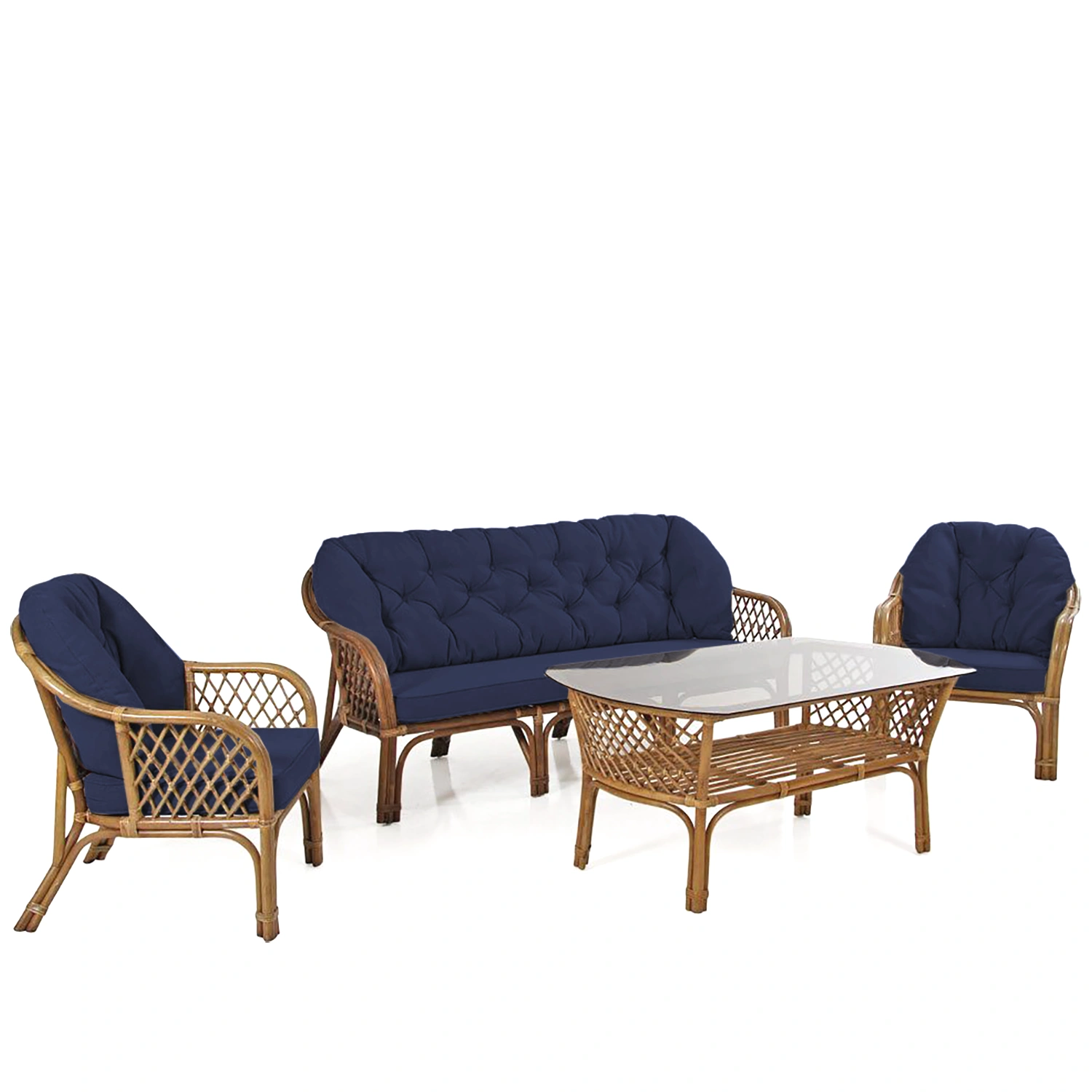 Fåtöljen är tillverkad i äkta rotting, ett naturmaterial som ger en varm och levande känsla. Rottingen är brunlaserad för ett enhetligt och elegant uttryck. Dynorna visas här i mörkblått dralontyg – ett slitstarkt syntetmaterial som är vattenavvisande, färgbeständigt och lätt att hålla rent.