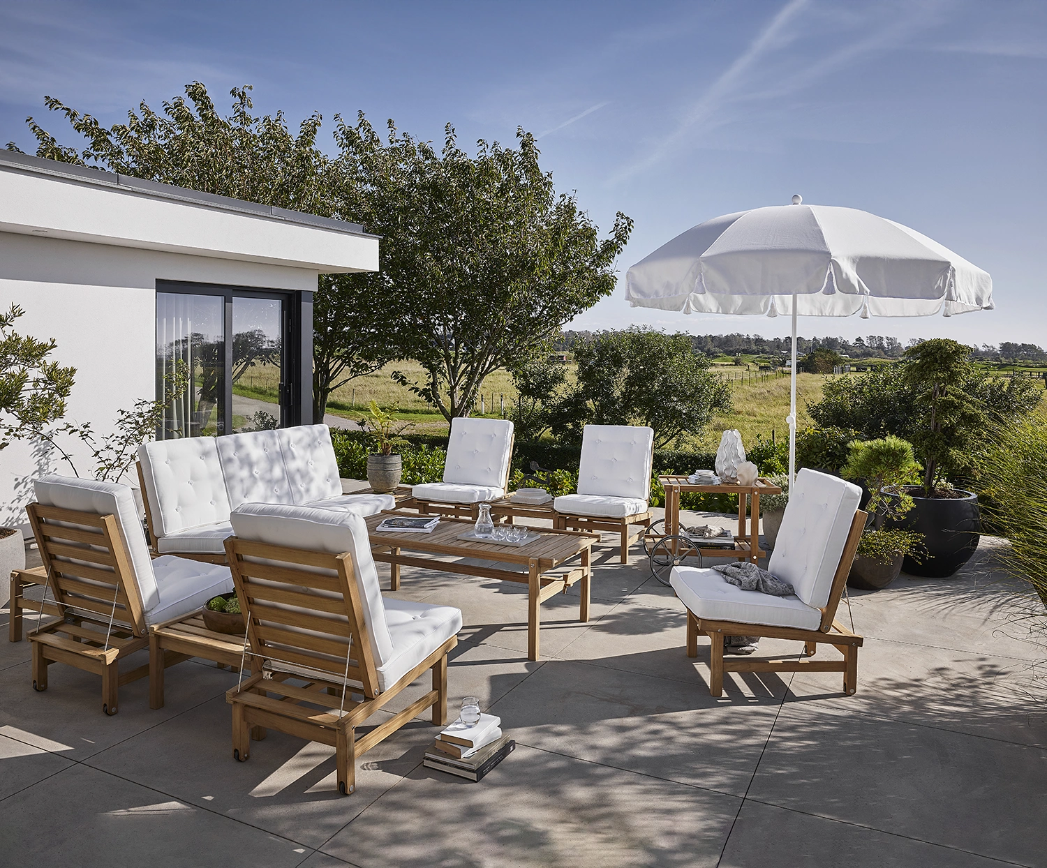 Möbeln är tillverkad i massiv teak, ett slitstarkt och väderbeständigt träslag som kräver minimalt underhåll. Rengör med mild tvållösning och mjuk borste. För att bevara träets ursprungliga färg kan teakolja appliceras vid behov. Vi rekommenderar möbelskydd vid längre perioder utan användning för bästa livslängd.