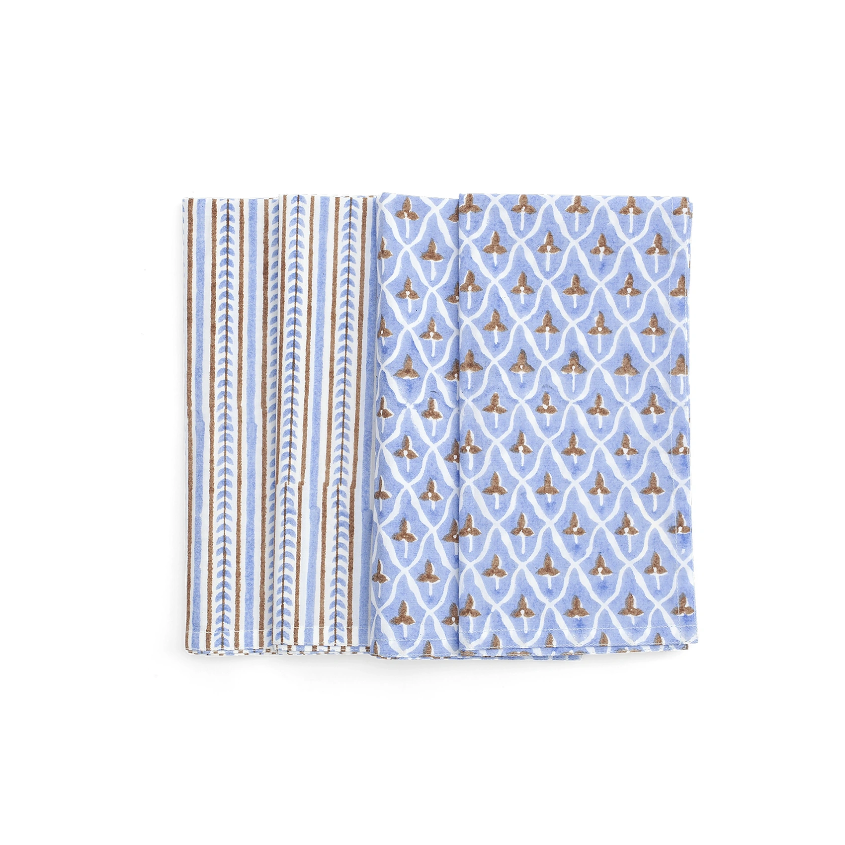 Eleganta servetter med trycket Tulpan & Leaf i lugnande brunt och blått. Handtryckta på ekologisk bomull med traditionella träsnittstekniker, ger de en förfinad hantverksmässig skönhet till ditt bord.