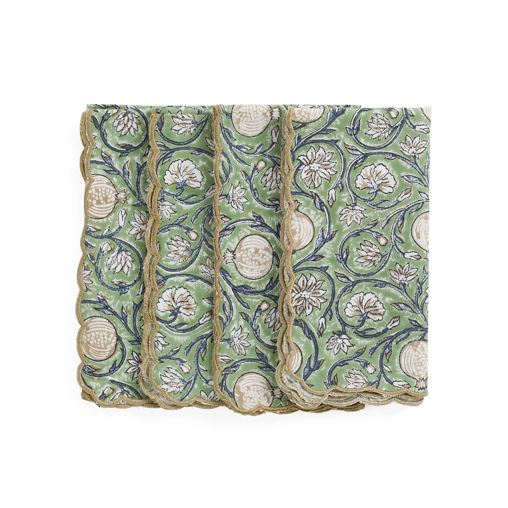 Set med fyra stycken servetter med mönstret Tangier Pomegranate i grönt. Mönstret är tryckt på bomull och servetterna matchar bordsdukarna i samma färger perfekt. Servetterna är dekorerade med en vågig, sydd kant runtom.