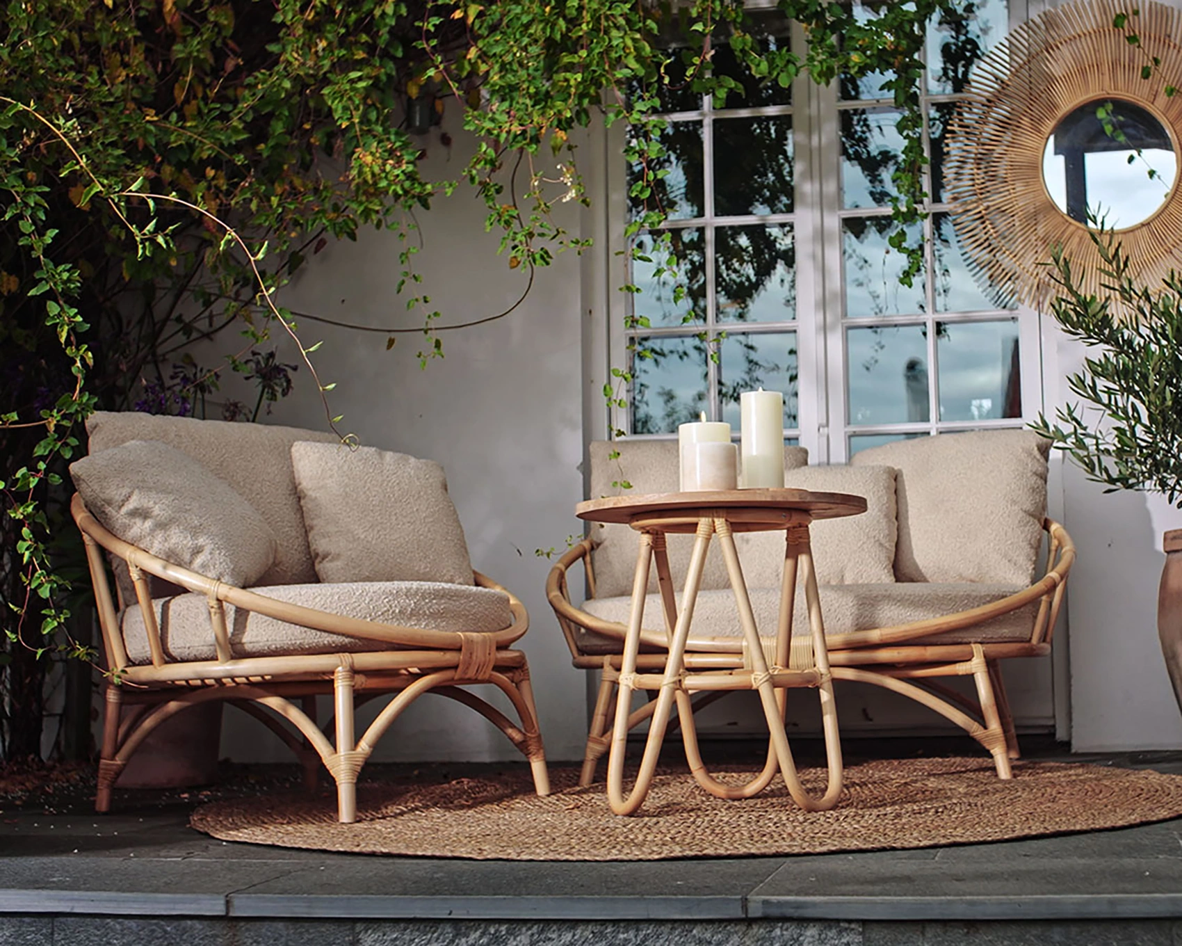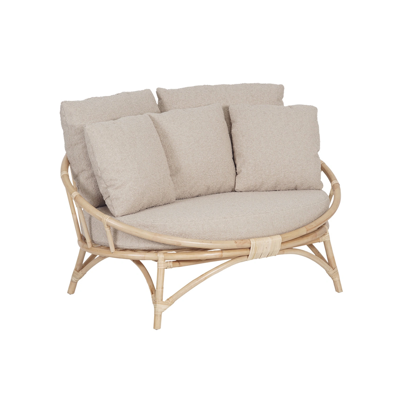 Soffan i denna serie kombinerar naturmaterial och modern design i ett stilfullt uttryck. Med ljus naturrotting och ett rundat formspråk skapar soffan en elegant och ombonad känsla. De sandbruna bouclé-dynorna i polyester erbjuder hög komfort och gör soffan till ett tidlöst val för både moderna miljöer och frodiga uterum. Varje soffa är unik eftersom naturrottingmaterialet ger den individuella karaktär.