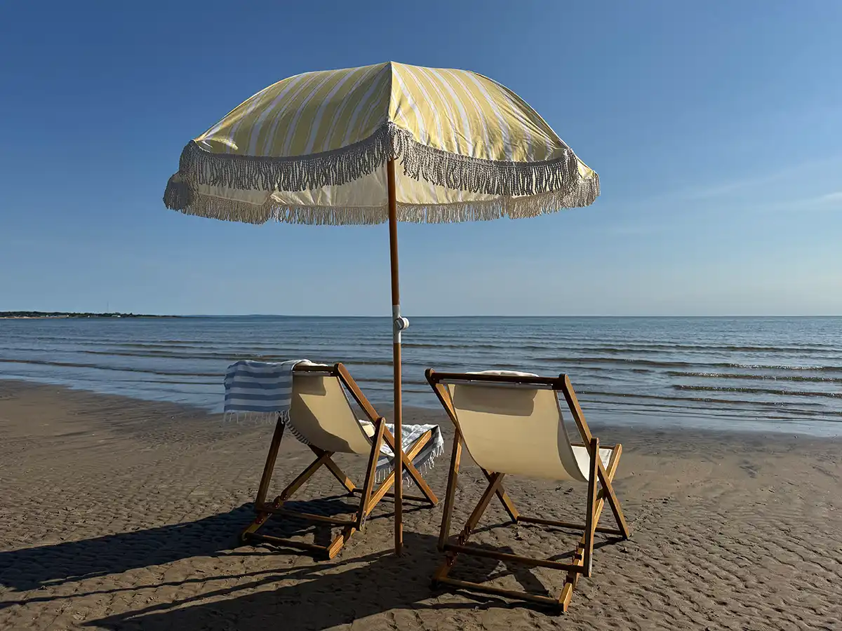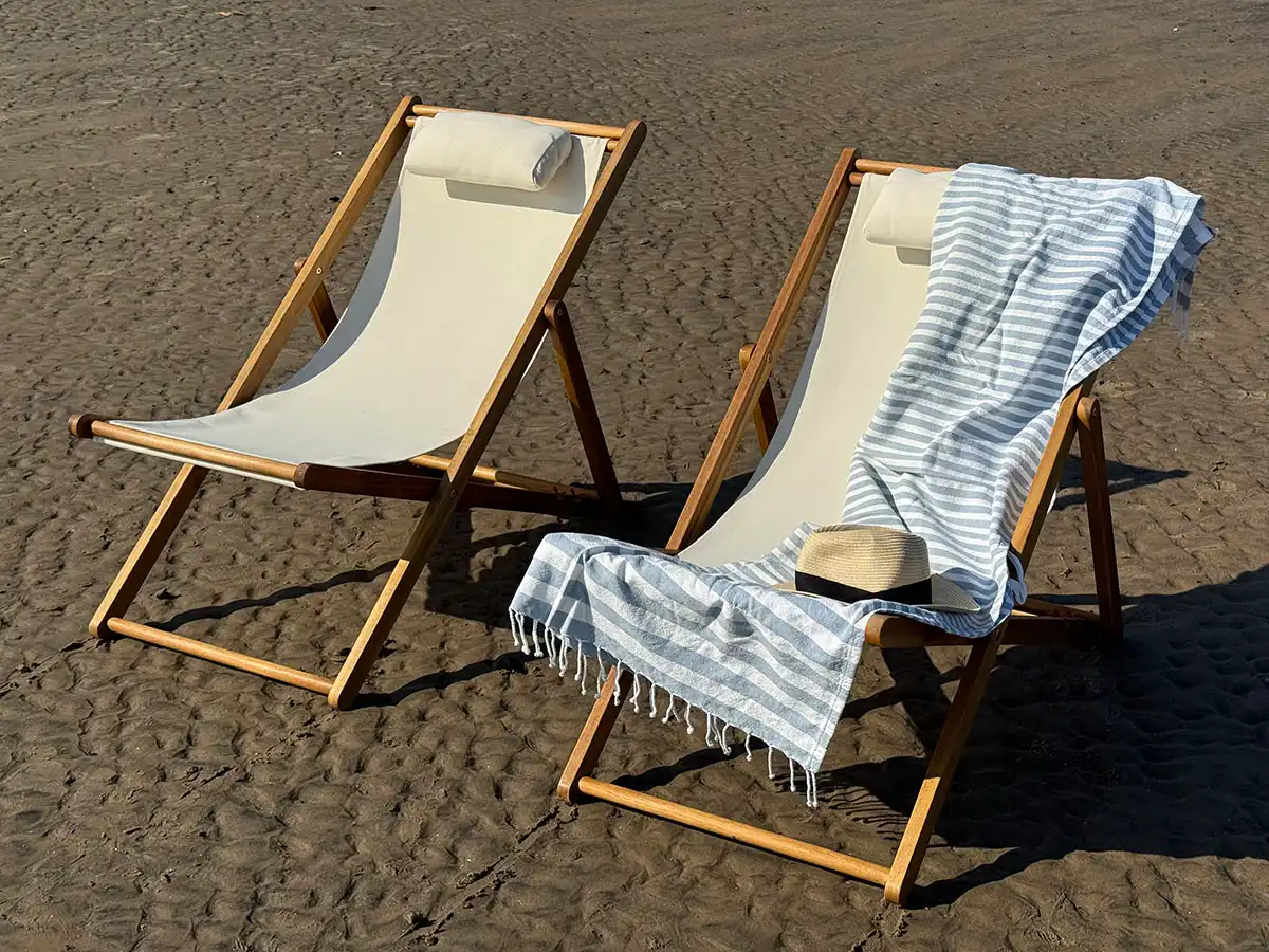 Skara solstol i klassisk strandstolsmodell med vitt polyestertyg med nackkudde.