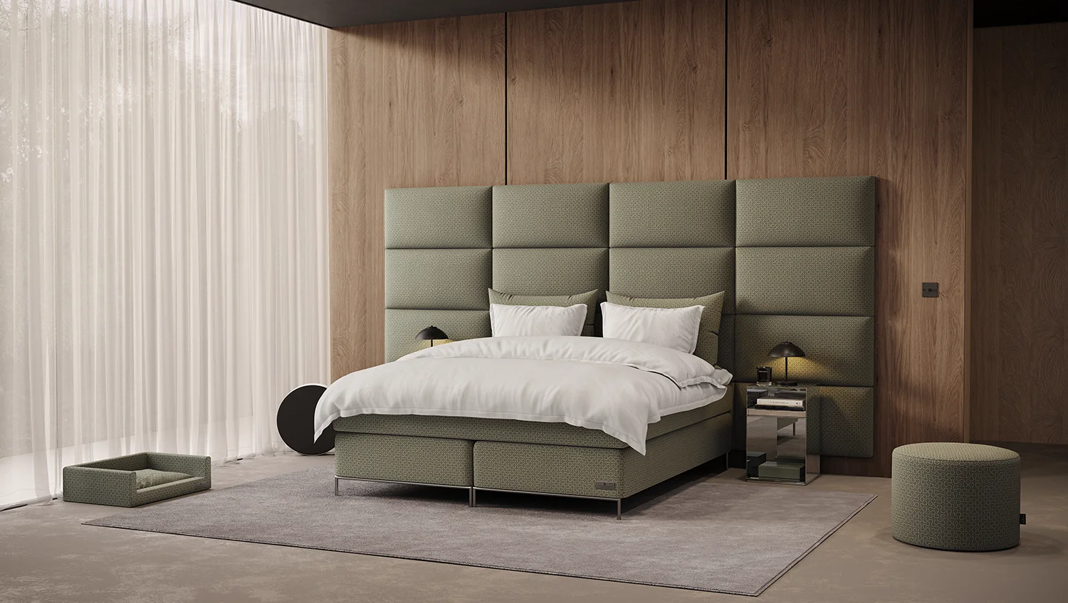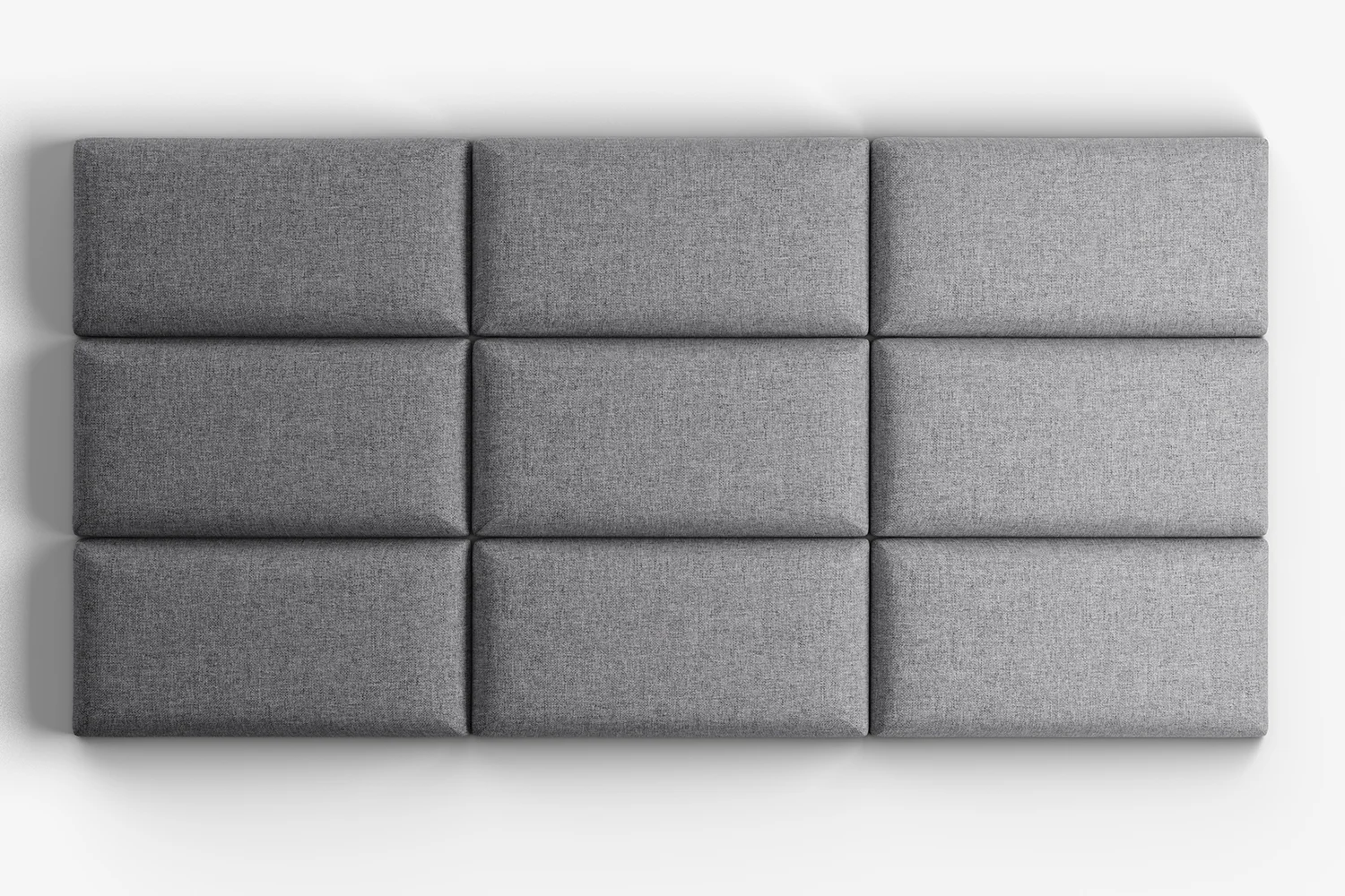 Elegant väggmonterad sänggavel bestående av moduler i storleken 90×45 cm. Välj mellan noggrant utvalda tyger i olika färger. Modulerna till sänggaveln är handgjorda i Sverige.