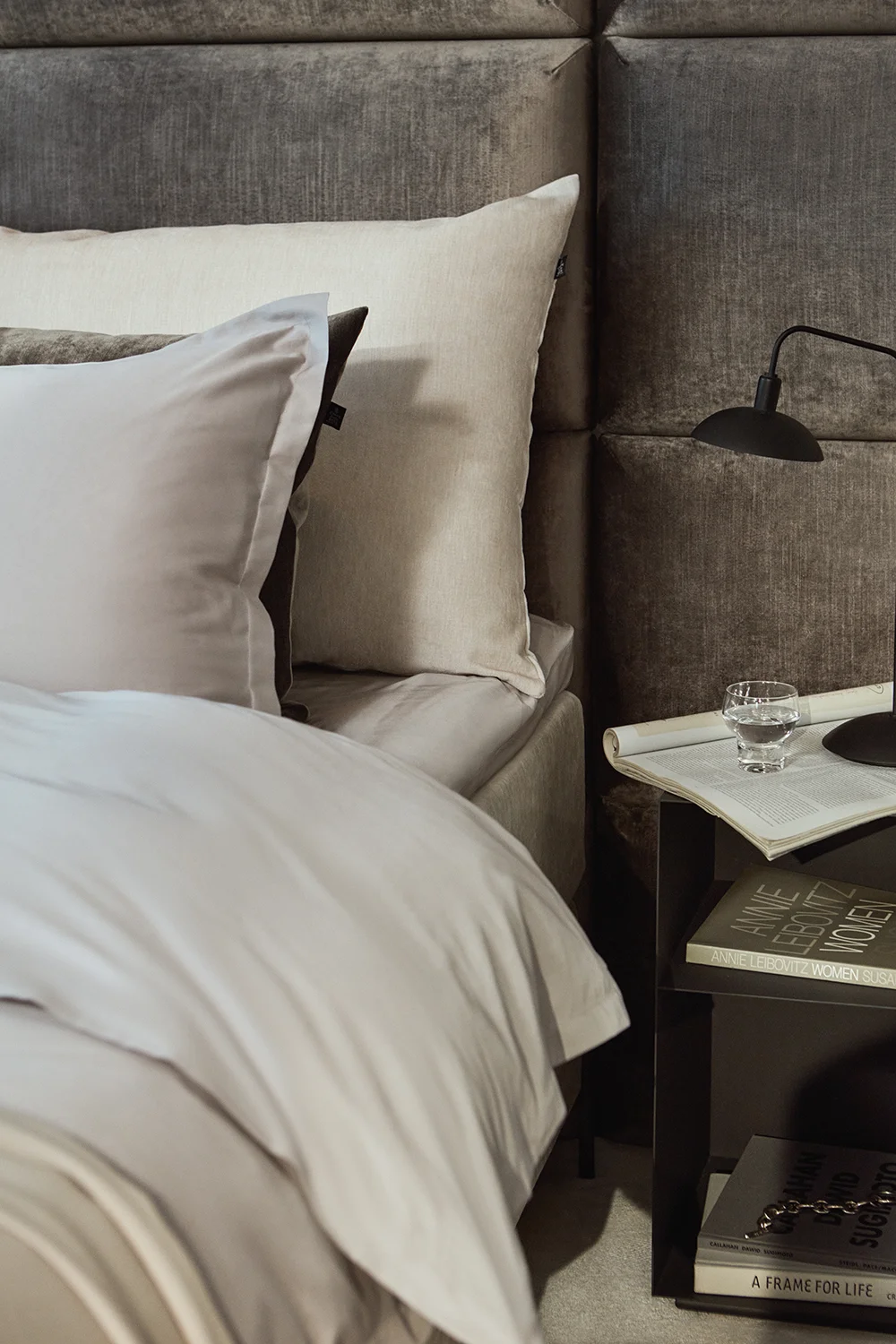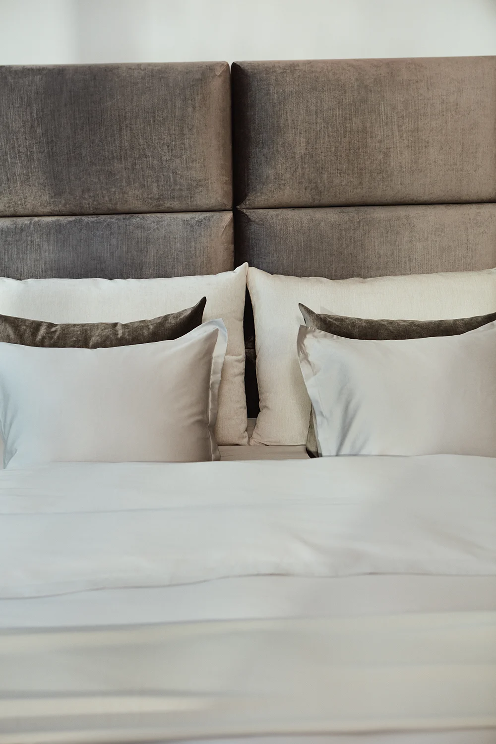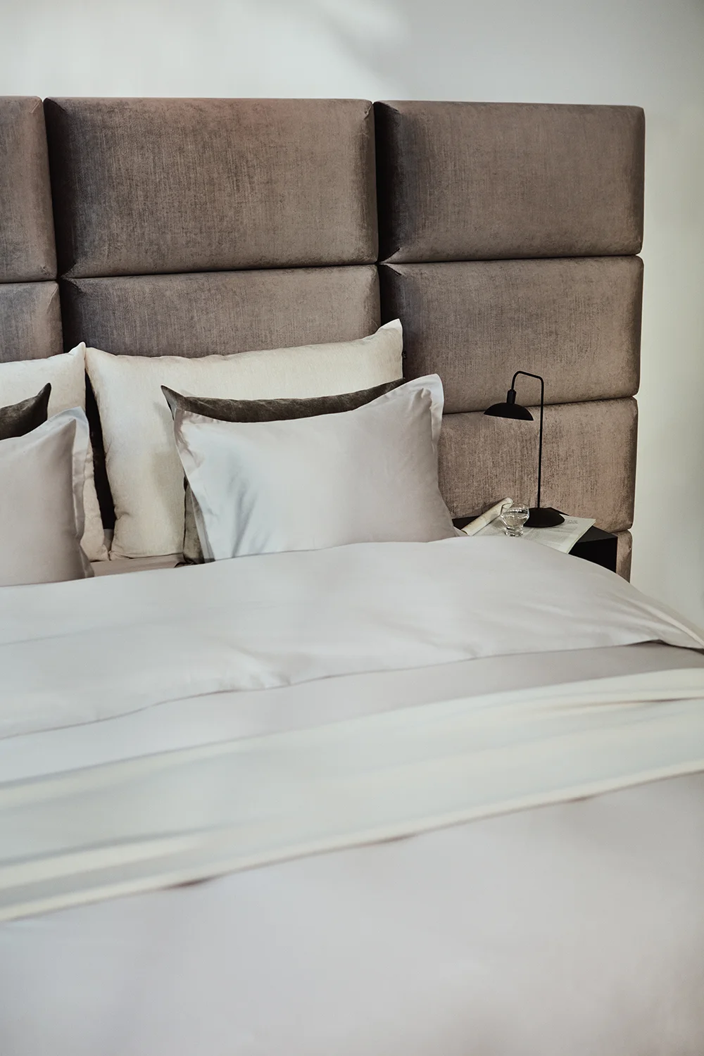 Elegant väggmonterad sänggavel bestående av moduler i storleken 90×45 cm. Välj mellan noggrant utvalda tyger i olika färger. Modulerna till sänggaveln är handgjorda i Sverige.