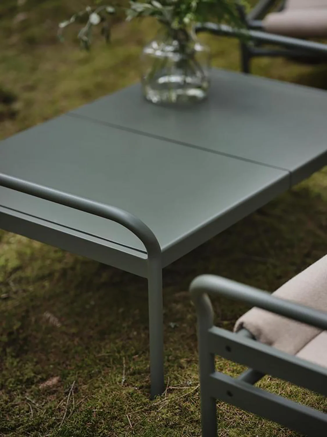 De lekfulla formerna i Sling-serien känns igen i soffbordet. Stabilt i pulverlackerad aluminium och generöst i storlek (85 x 136 centimeter). Stativet är format så att stommen även blir till handtag, vilket gör bordet enkelt att flytta.