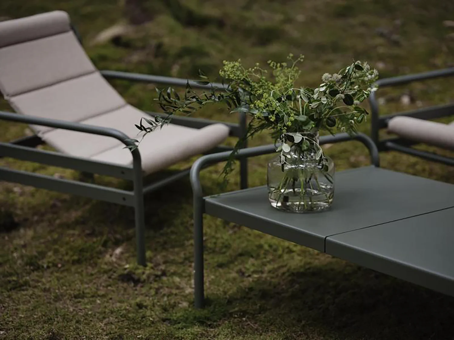 Sling-serien har formen som blir sommarens snackis. En mjuk, rund och böljande design som lekfullt fångar sommarens väsen. Dynornas hängande böj blir inte bara en stilig fortsättning av stommen – de är dessutom otroligt sköna att sitta i. Serien innehåller fåtölj, soffa och soffbord.