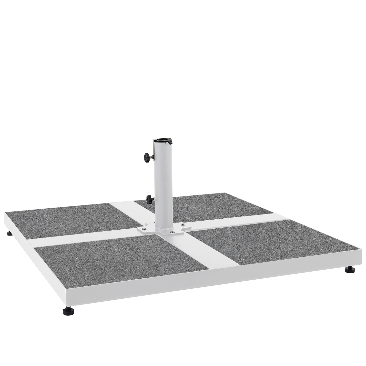 Foten säljs som standard inklusive 4 stycken vikter. Vikterna går att välja bort ifall du vill lägga andra vikter i eller redan har vikterna sedan innan. Vikterna till foten har måtten 40×40 cm och väger 20 kg/st. Tillsammans med ställningen kommer parasollfoten väga närmare 100 kg.