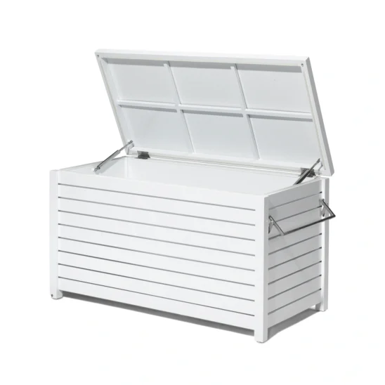 Soffan är tillverkad i aluminium med epoxylackerad yta som skyddar mot rost och slitage. Rengör enkelt med mild tvållösning och mjuk trasa. Undvik starka kemikalier och slipande material för att bevara den eleganta finishen. Möbeln kräver ingen ytterligare behandling och kan stå ute året runt, men vi rekommenderar möbelskydd vid längre perioder utan användning för bästa livslängd.