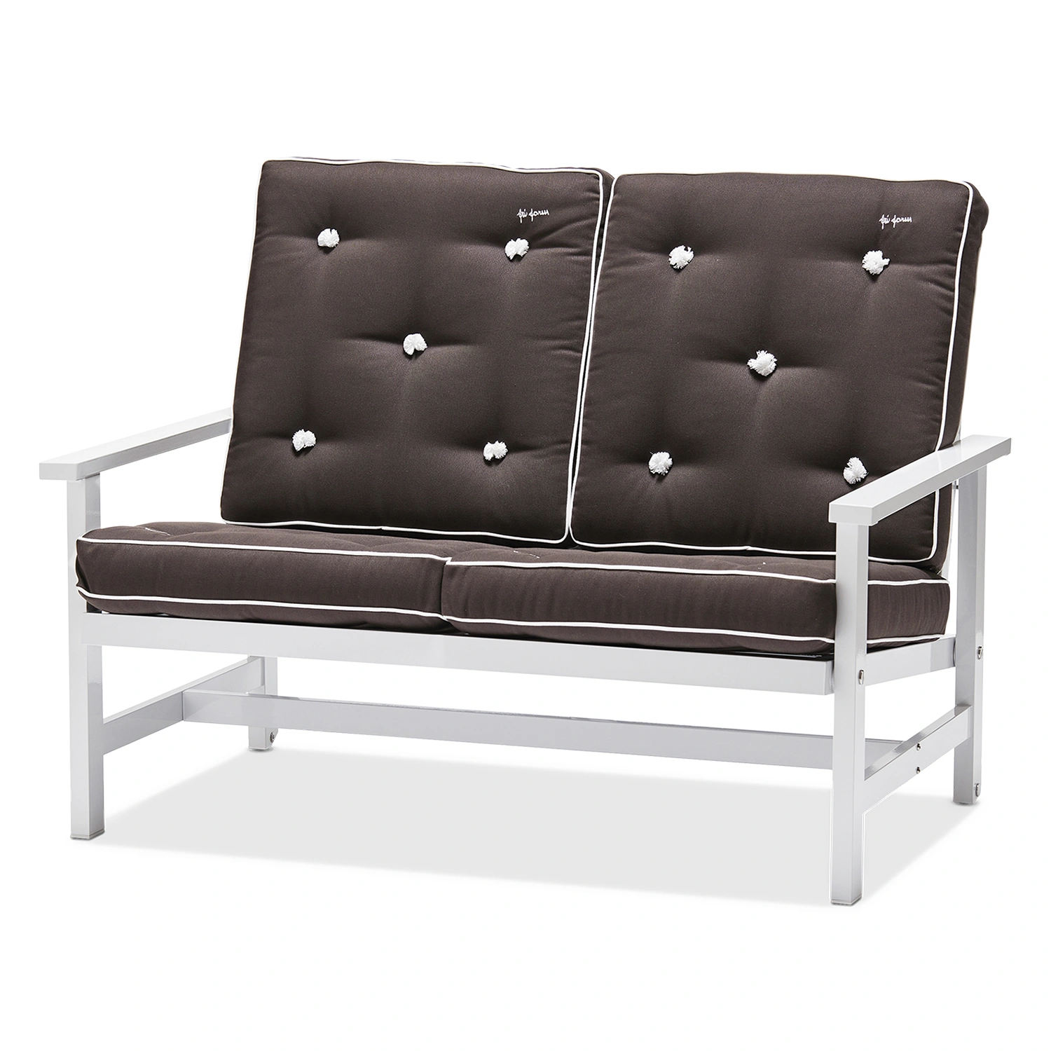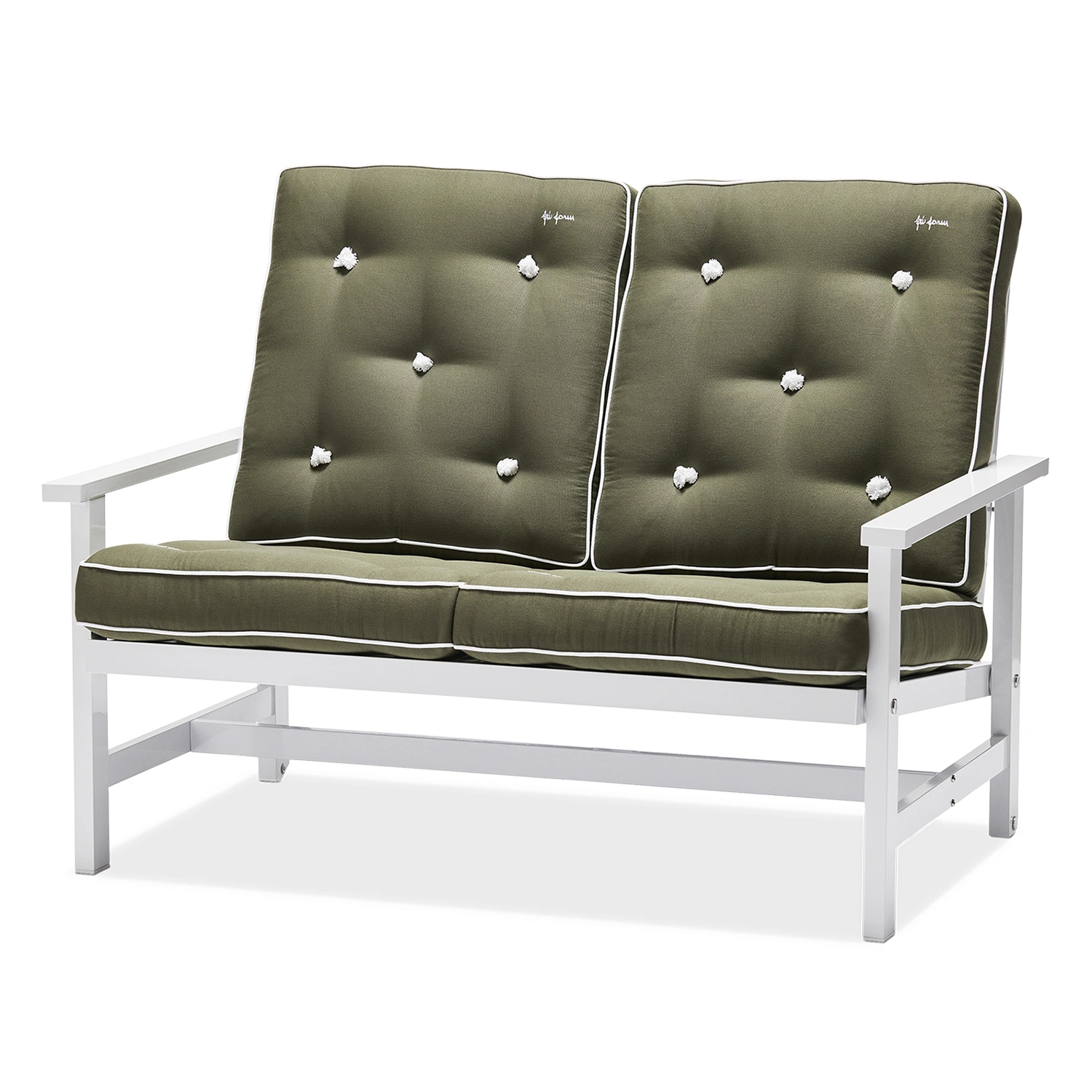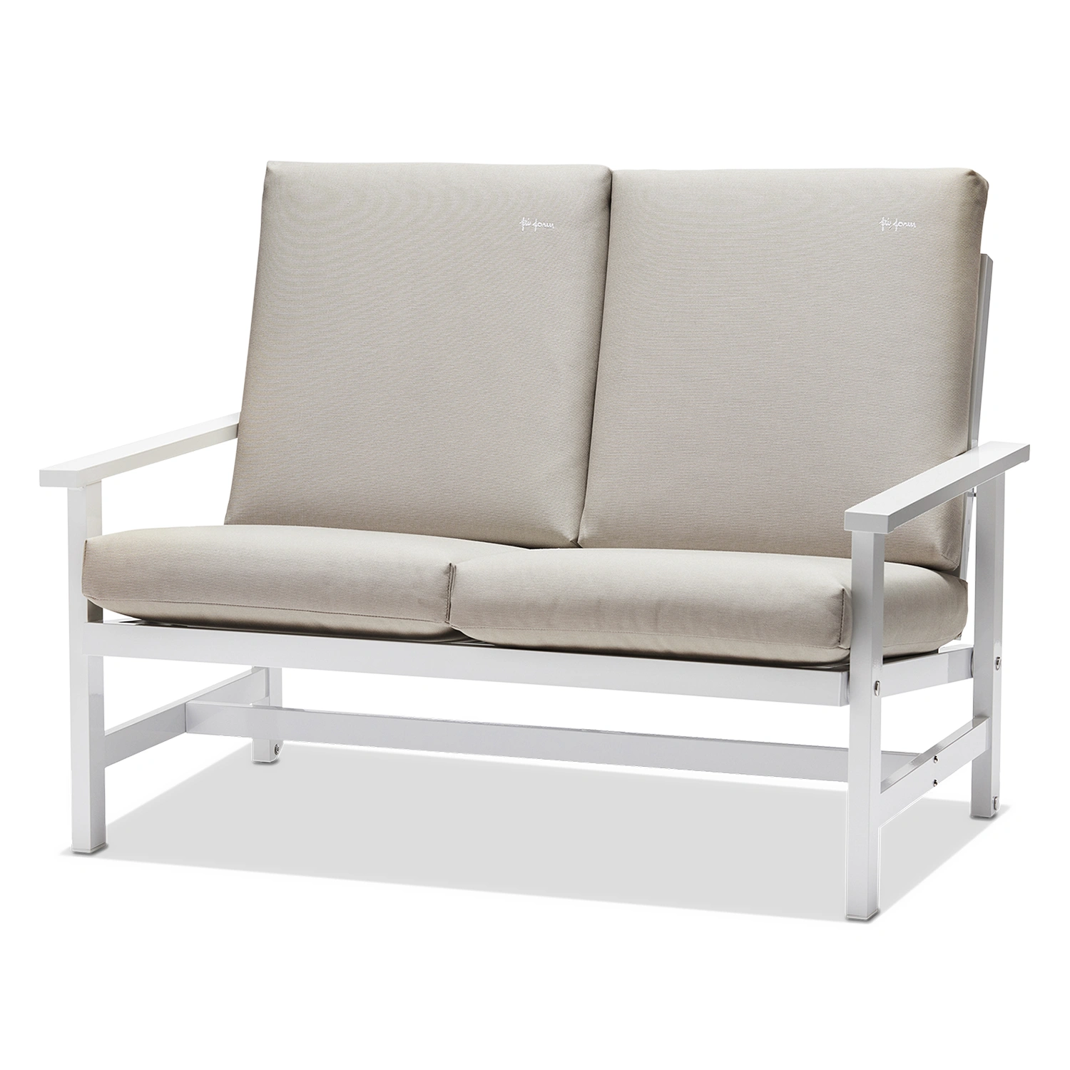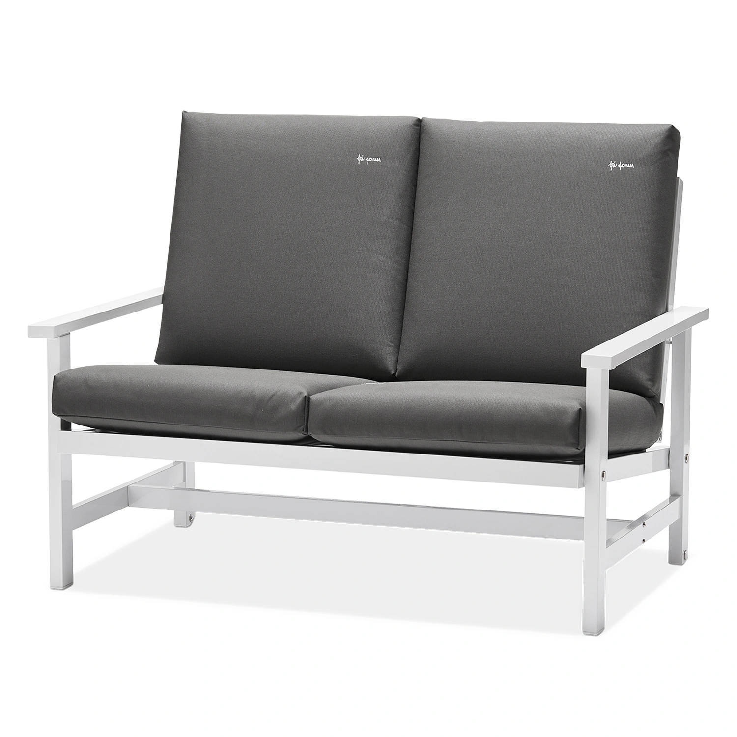 Soffa 08 från Fri Form är en stilren 2-sitssoffa här i vitlackerad aluminium som förenar klassisk design med praktisk hållbarhet. Den robusta stommen är tillverkad i aluminium och epoxylackerad i en elegant vit finish som gör soffan helt underhållsfri och mycket väderbeständig. Aluminiumets naturliga egenskaper gör möbeln lätt, rostfri och enkel att flytta, vilket gör den idealisk för det nordiska klimatet. Soffan behåller sin form och färg år efter år, oavsett om den placeras på altanen, vid havet eller i en skyddad trädgårdsmiljö.