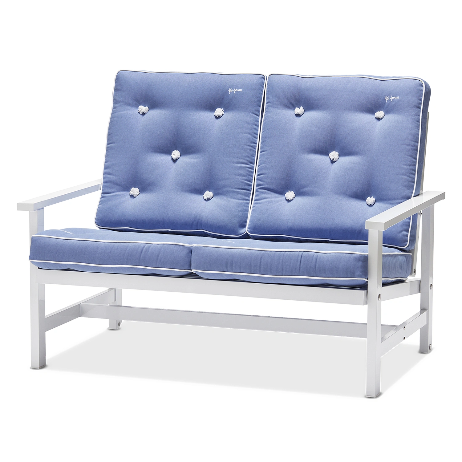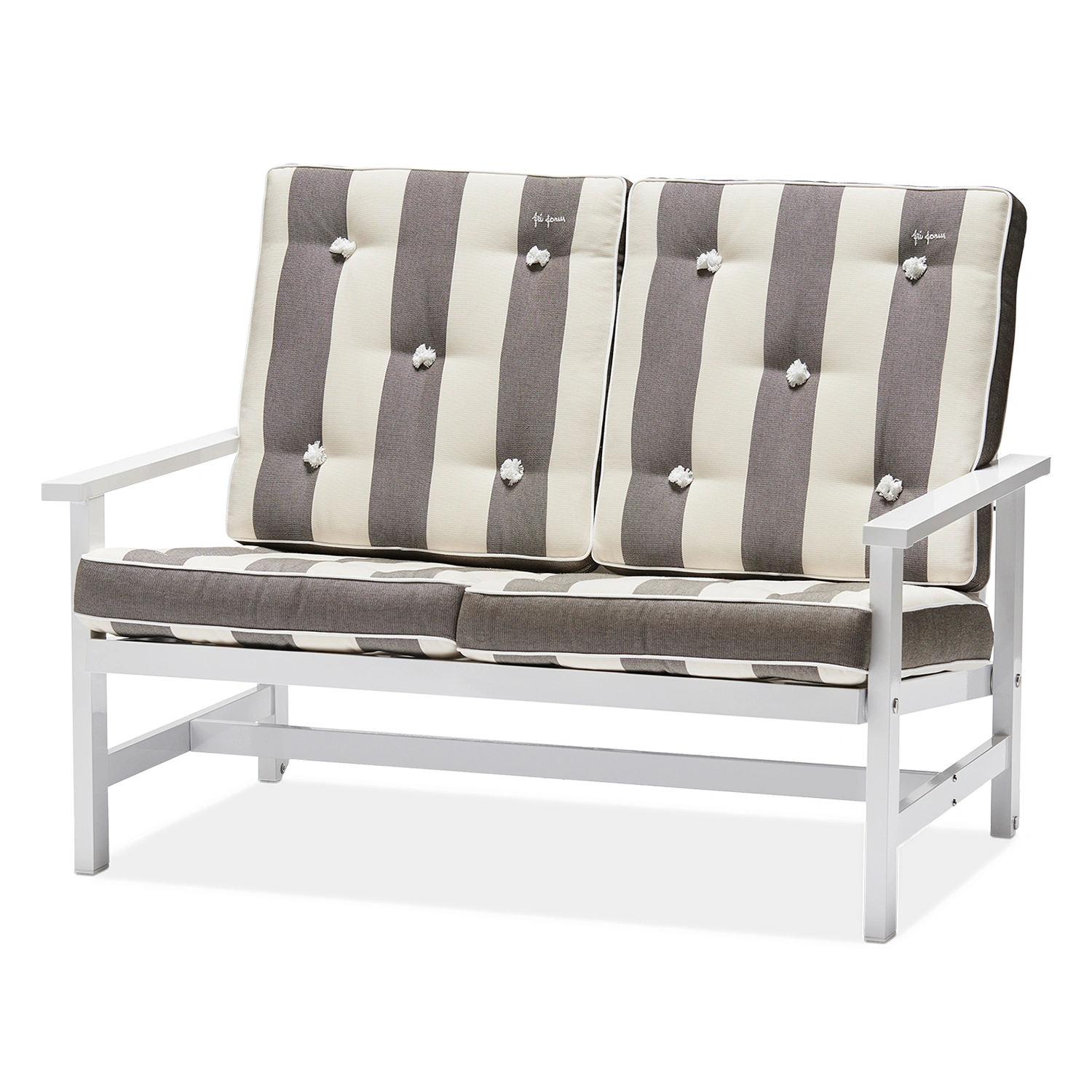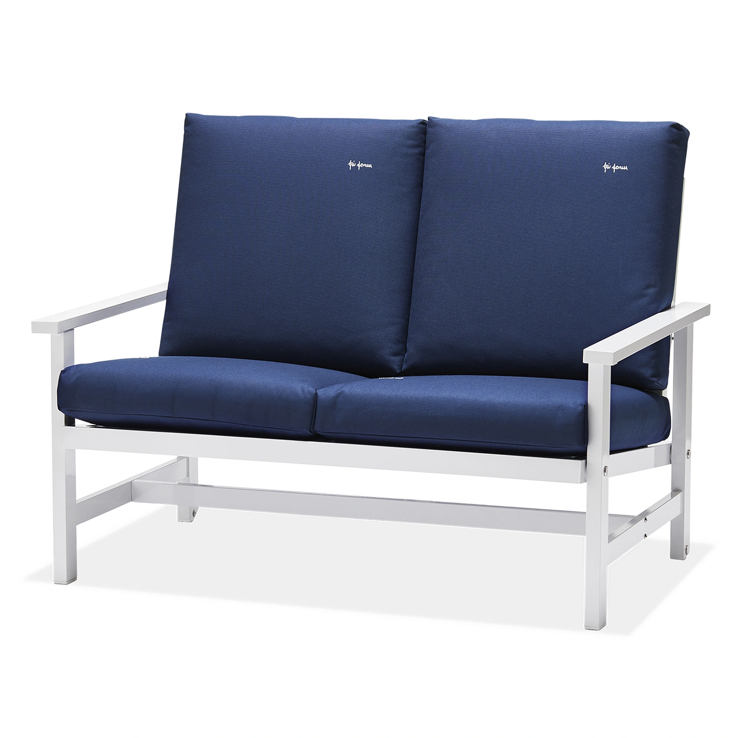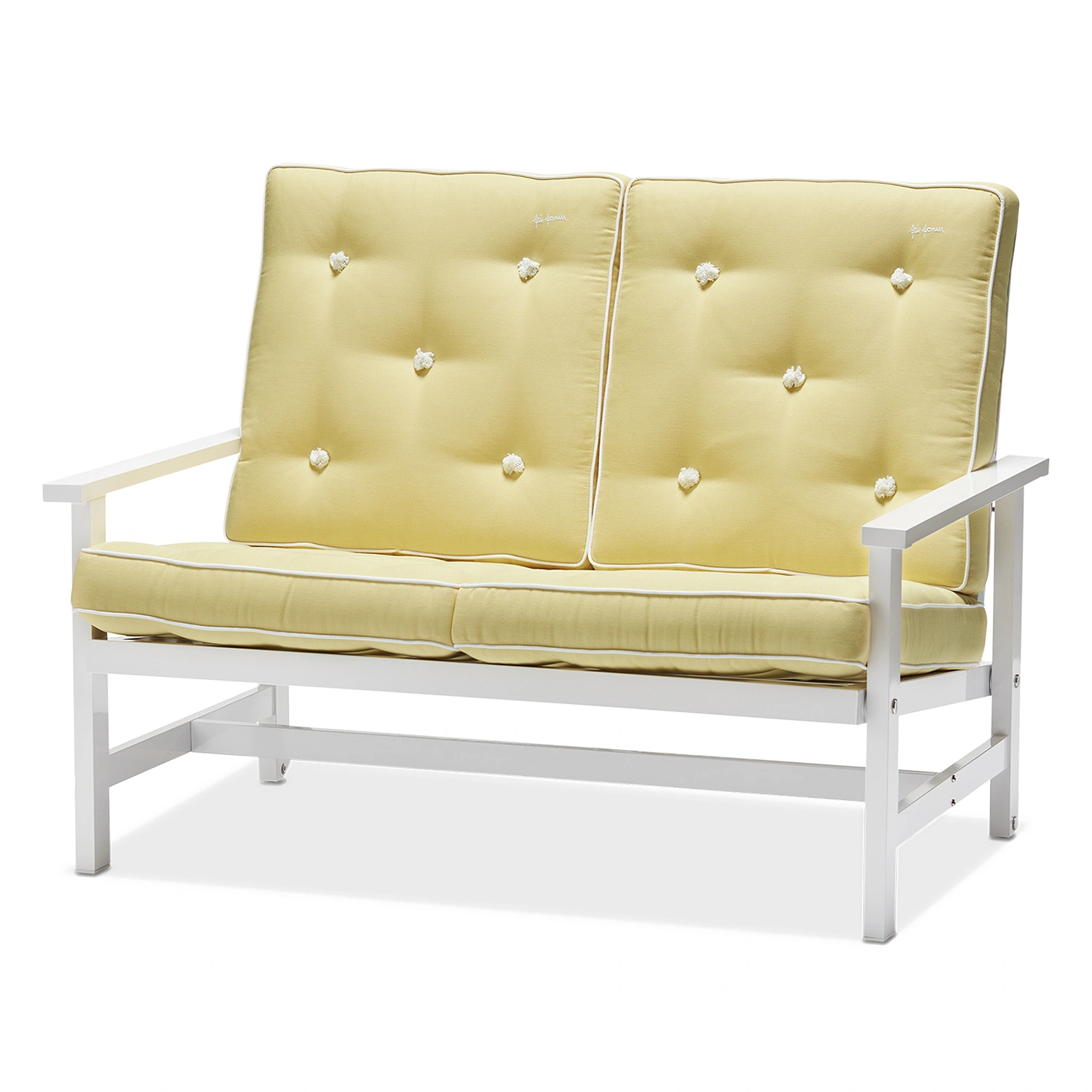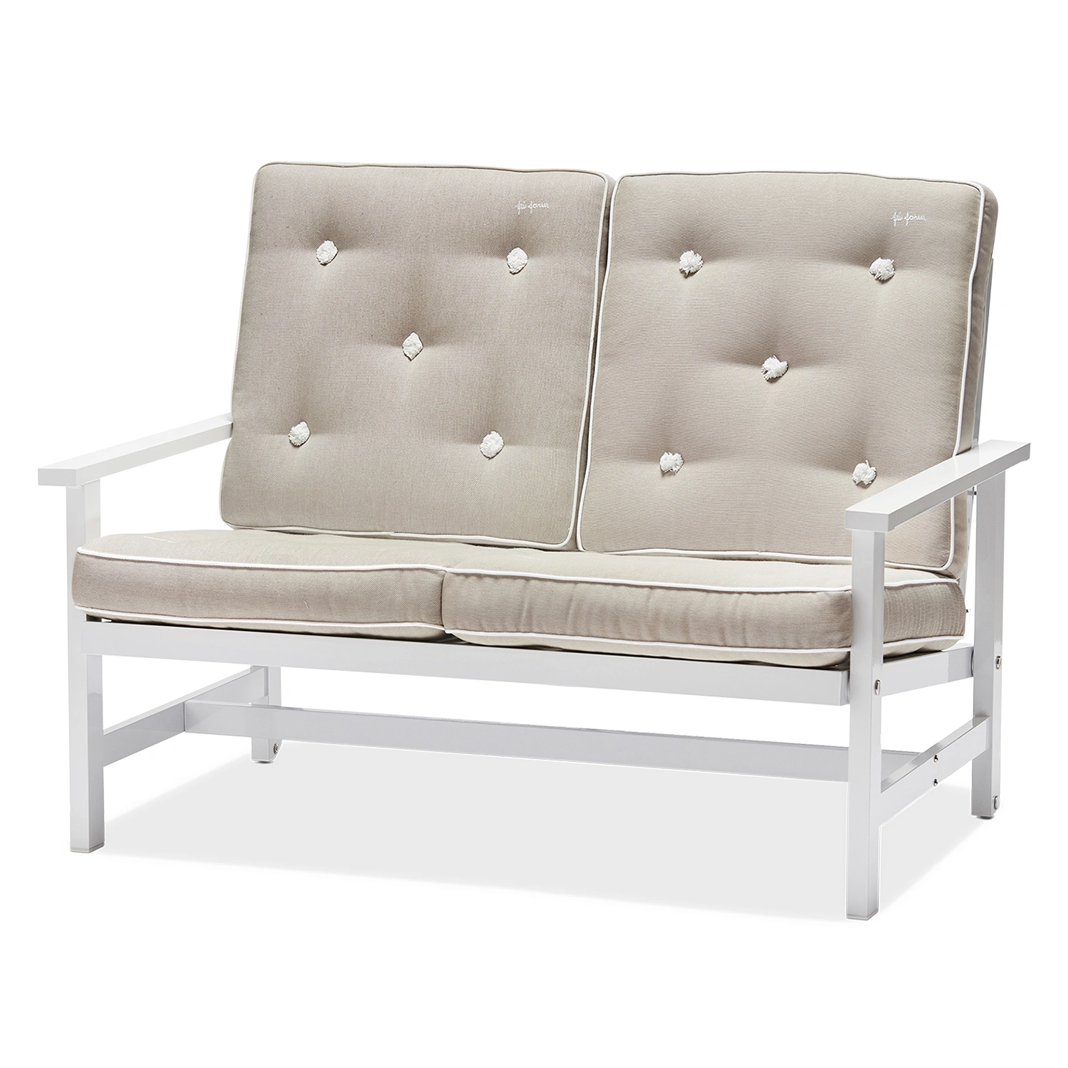 Soffa 08 från Fri Form är en stilren 2-sitssoffa här i vitlackerad aluminium som förenar klassisk design med praktisk hållbarhet. Den robusta stommen är tillverkad i aluminium och epoxylackerad i en elegant vit finish som gör soffan helt underhållsfri och mycket väderbeständig. Aluminiumets naturliga egenskaper gör möbeln lätt, rostfri och enkel att flytta, vilket gör den idealisk för det nordiska klimatet. Soffan behåller sin form och färg år efter år, oavsett om den placeras på altanen, vid havet eller i en skyddad trädgårdsmiljö.