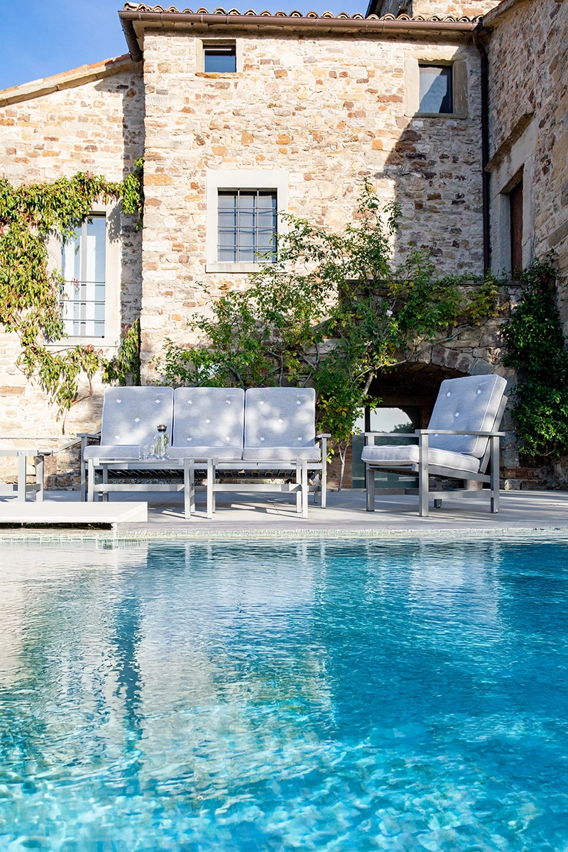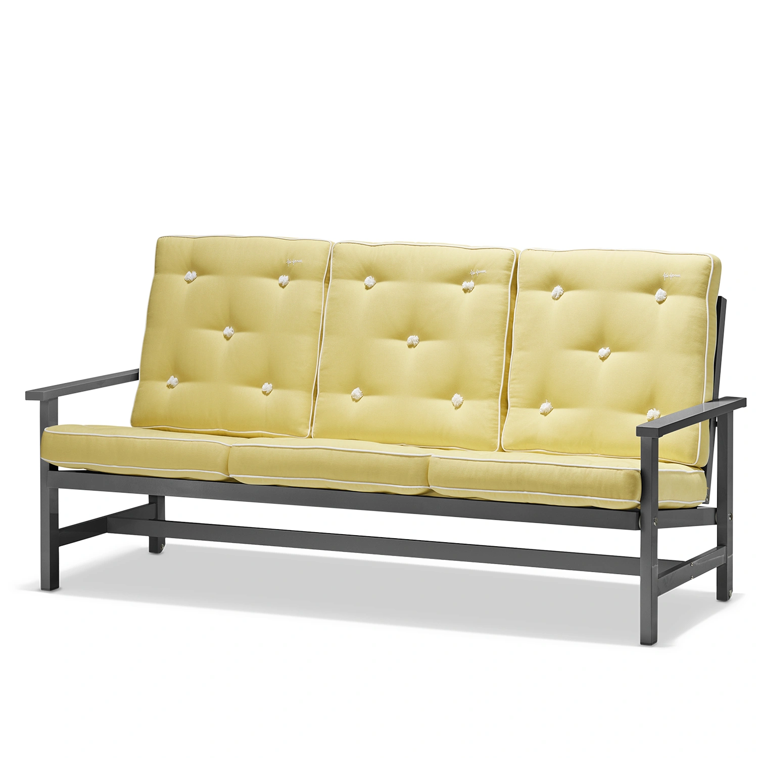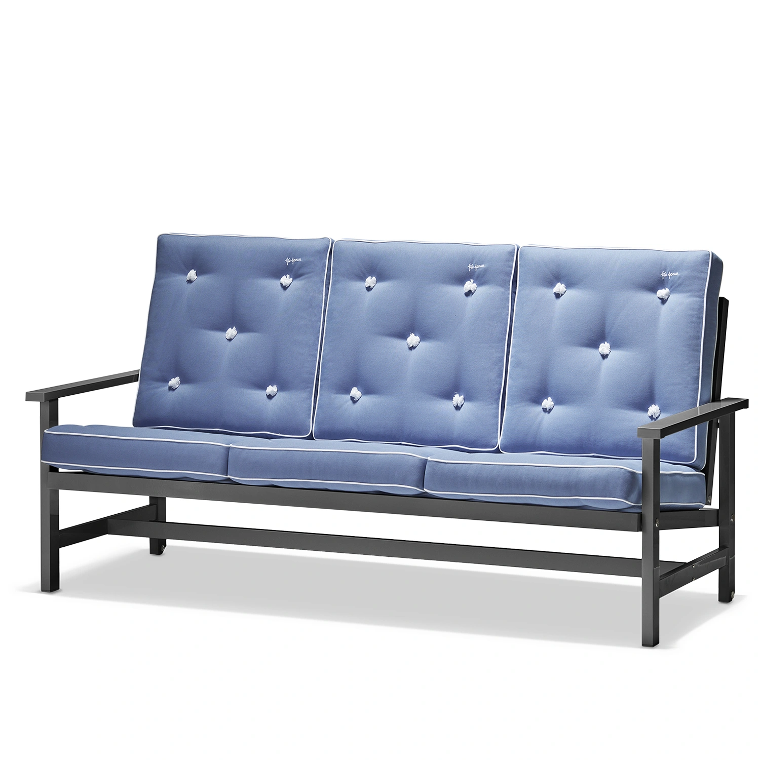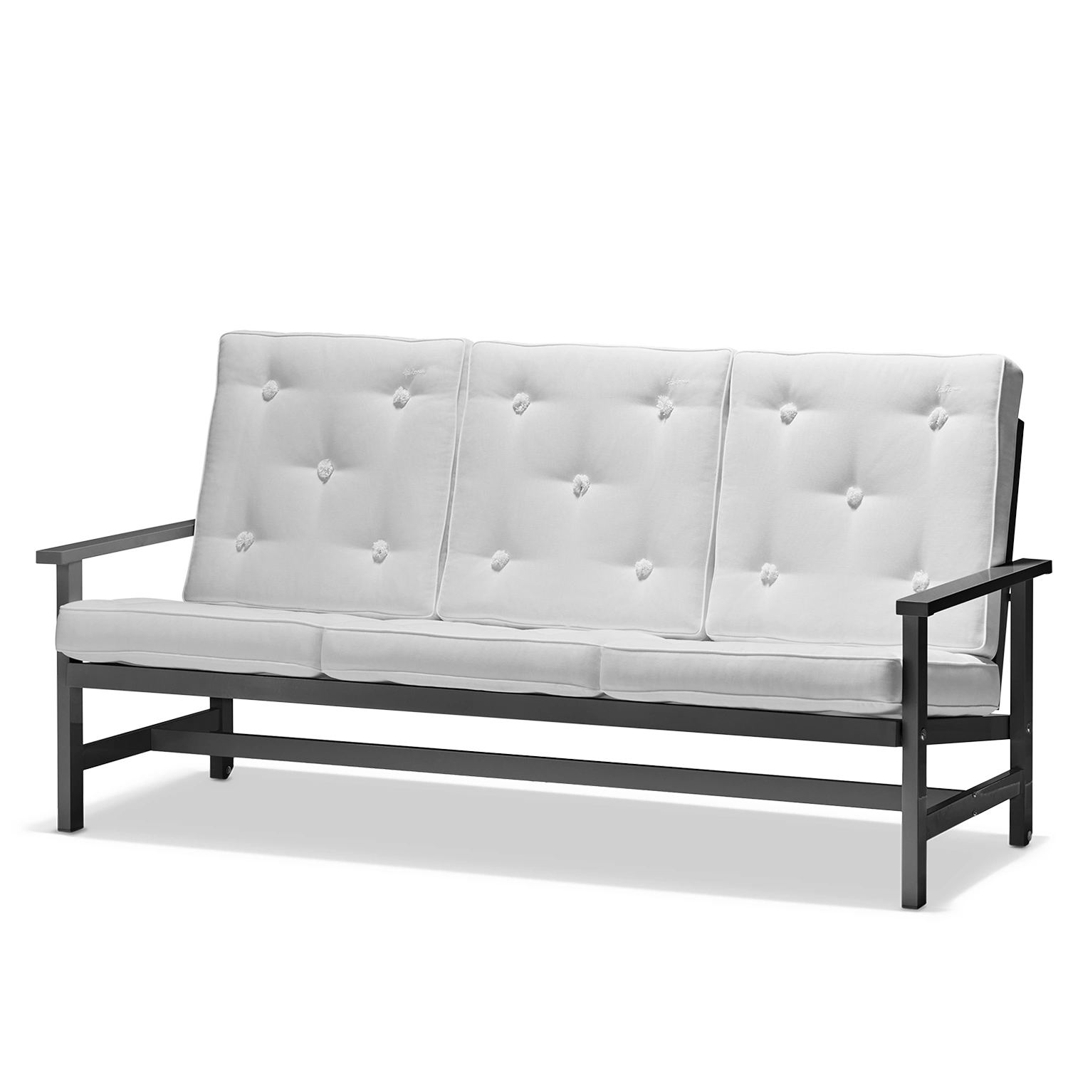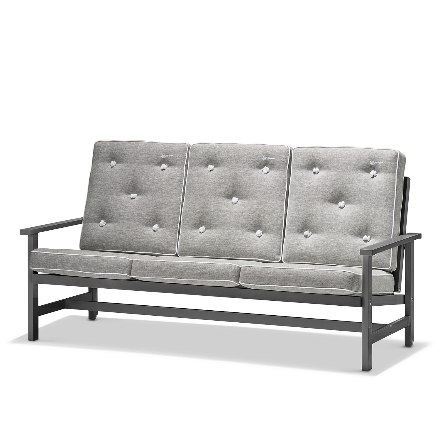 Soffan är tillverkad i aluminium med epoxylackerad yta som skyddar mot rost och slitage. Rengör enkelt med mild tvållösning och mjuk trasa. Undvik starka kemikalier och slipande material för att bevara den eleganta finishen. Möbeln kräver ingen ytterligare behandling och kan stå ute året runt, men vi rekommenderar möbelskydd vid längre perioder utan användning för bästa livslängd.