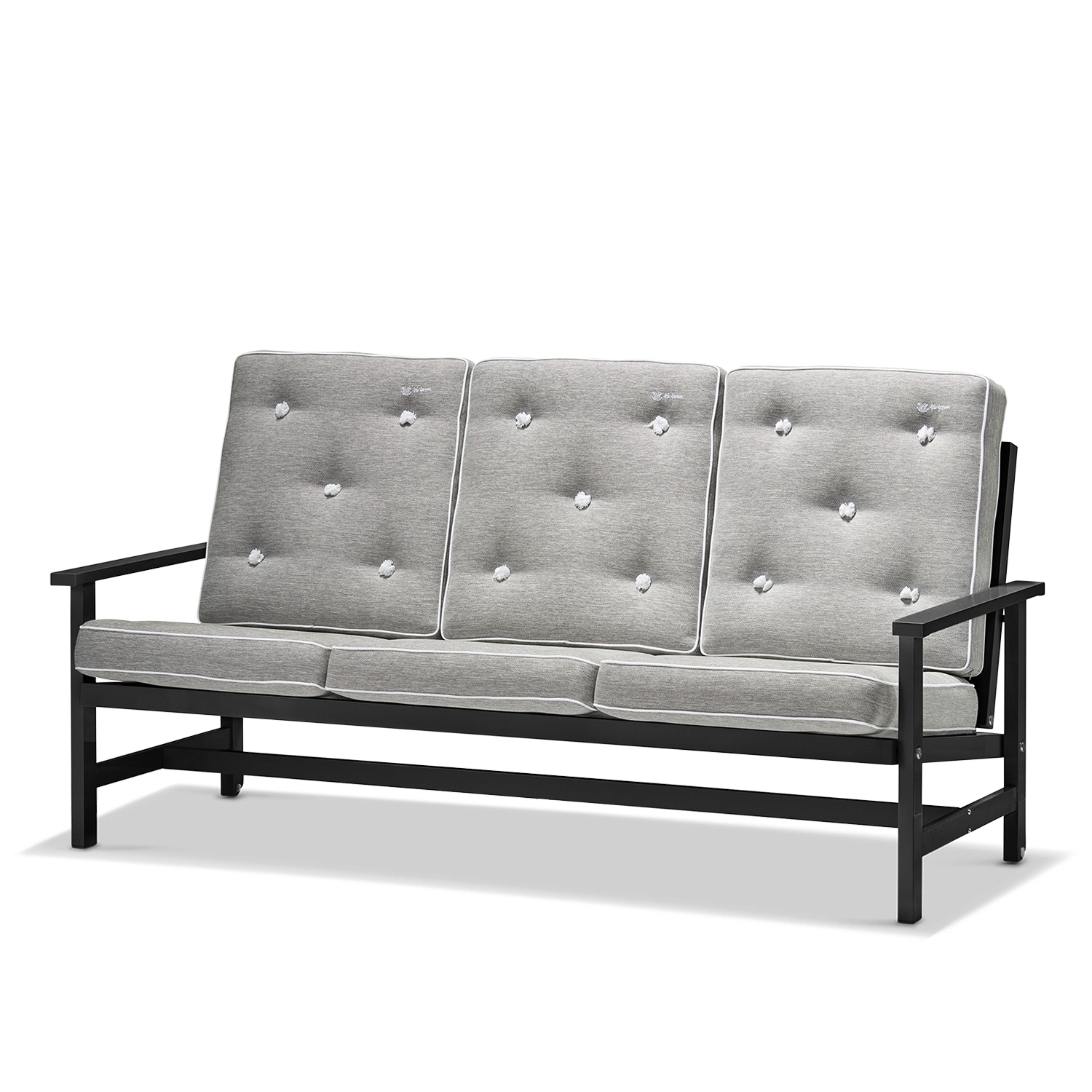 Soffa 09 från Fri Form är en elegant 3-sitssoffa i svartlackerad aluminium som kombinerar tidlös design med hög funktionalitet. Den robusta stommen är tillverkad i aluminium och epoxylackerad i en stilren svart finish som gör soffan helt underhållsfri och extremt väderbeständig. Tack vare aluminiumets naturliga egenskaper är möbeln både lätt och rostfri, vilket gör den enkel att flytta och perfekt anpassad för det nordiska klimatet. Soffan behåller sin form och färg år efter år, oavsett om den står på en solig altan, vid havet eller i en skyddad trädgårdsmiljö.