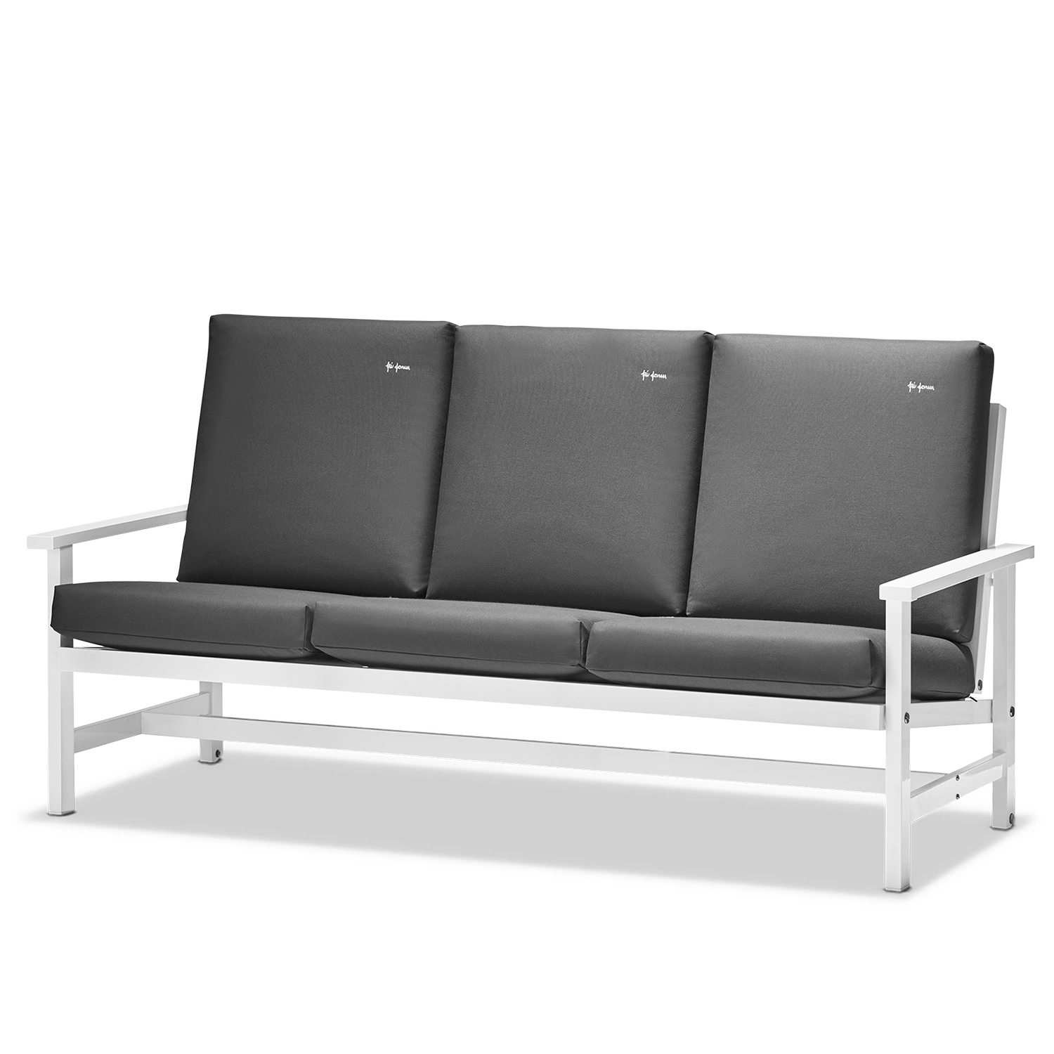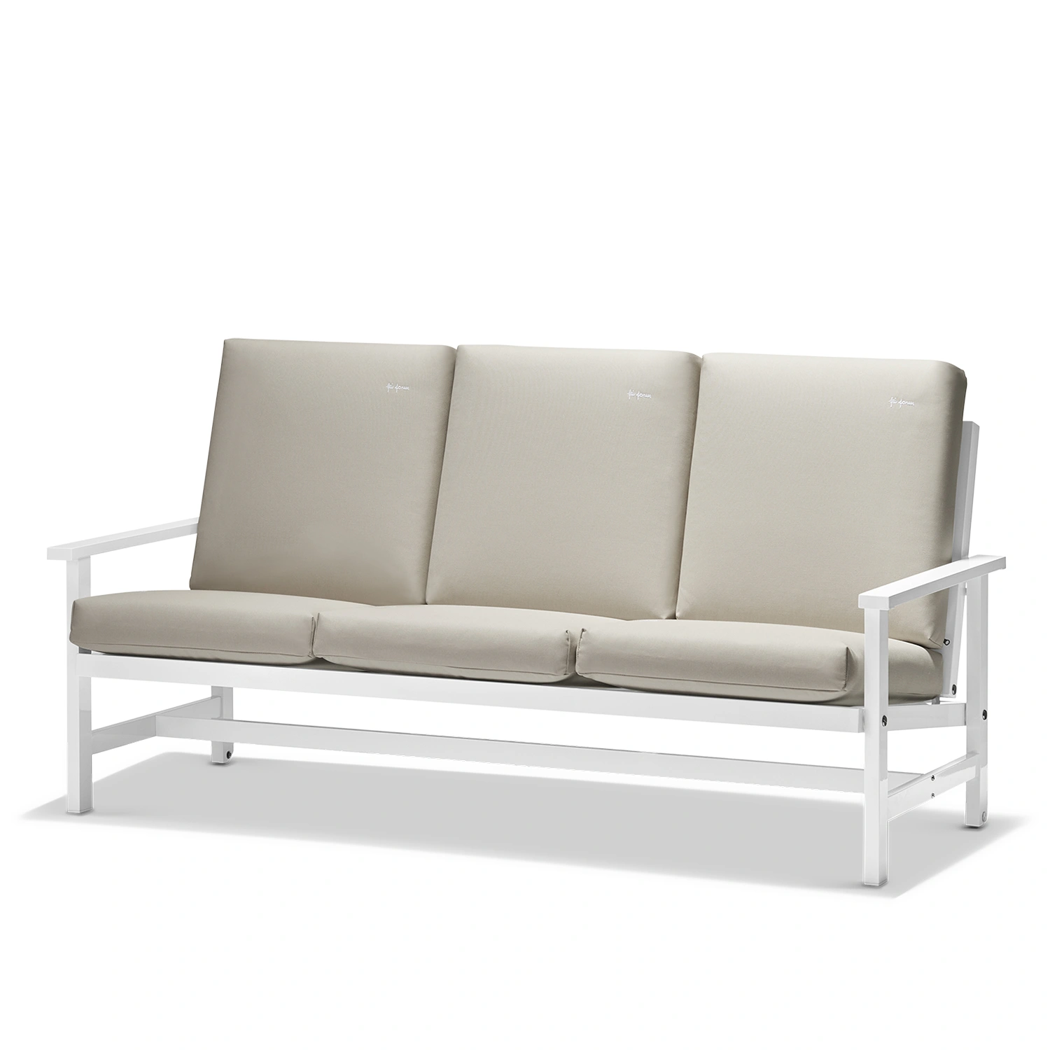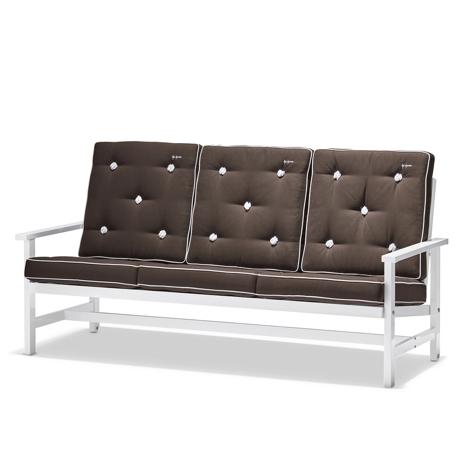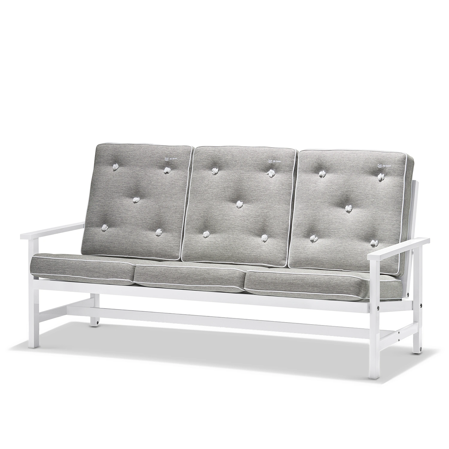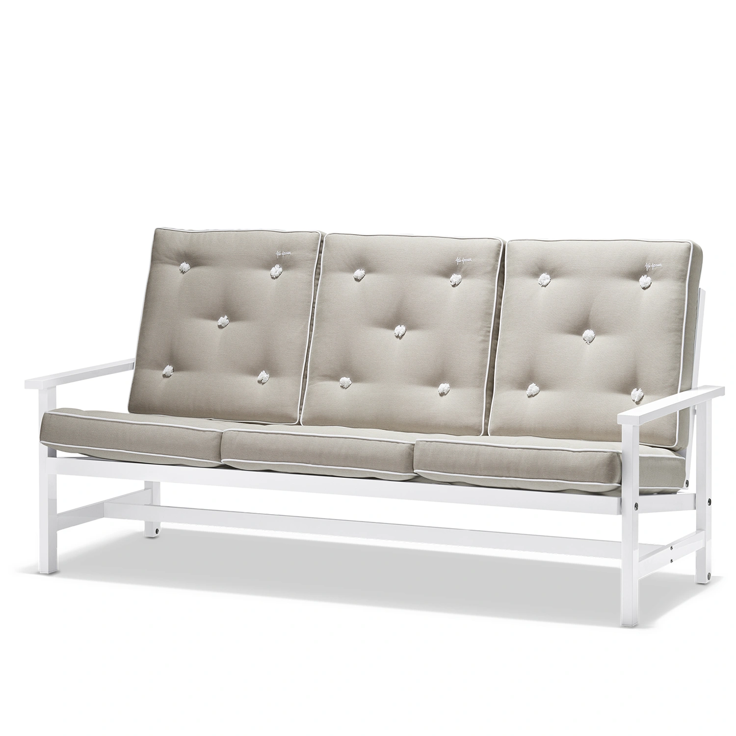 Soffa 09 från Fri Form är en elegant 3-sitssoffa i vitlackerad aluminium som kombinerar tidlös design med hög funktionalitet. Den robusta stommen är tillverkad i aluminium och lackerad i en stilren vit finish som gör soffan helt underhållsfri och extremt väderbeständig. Tack vare aluminiumets naturliga egenskaper är möbeln både lätt och rostfri, vilket gör den enkel att flytta och perfekt anpassad för det nordiska klimatet. Soffan behåller sin form och färg år efter år, oavsett om den står på en solig altan, vid havet eller i en skyddad trädgårdsmiljö.