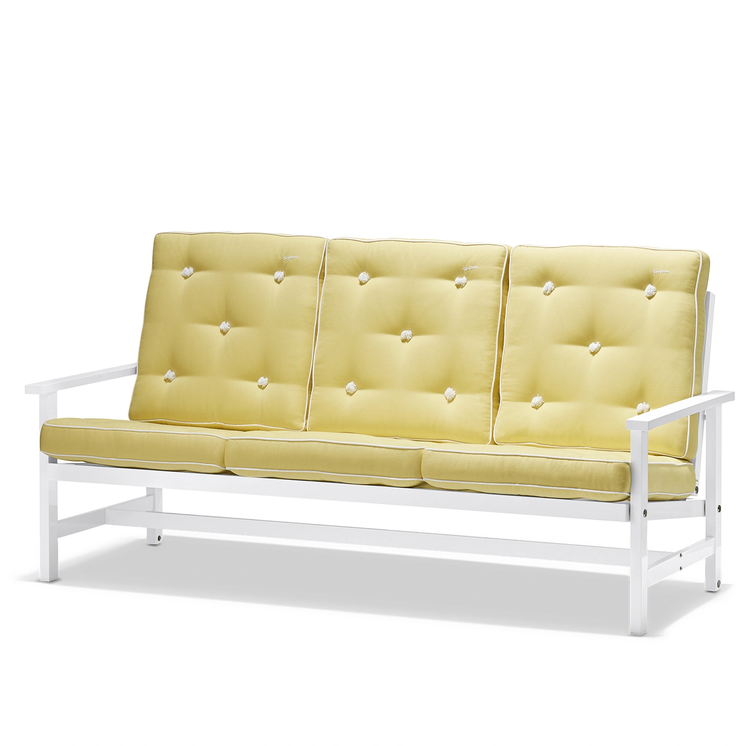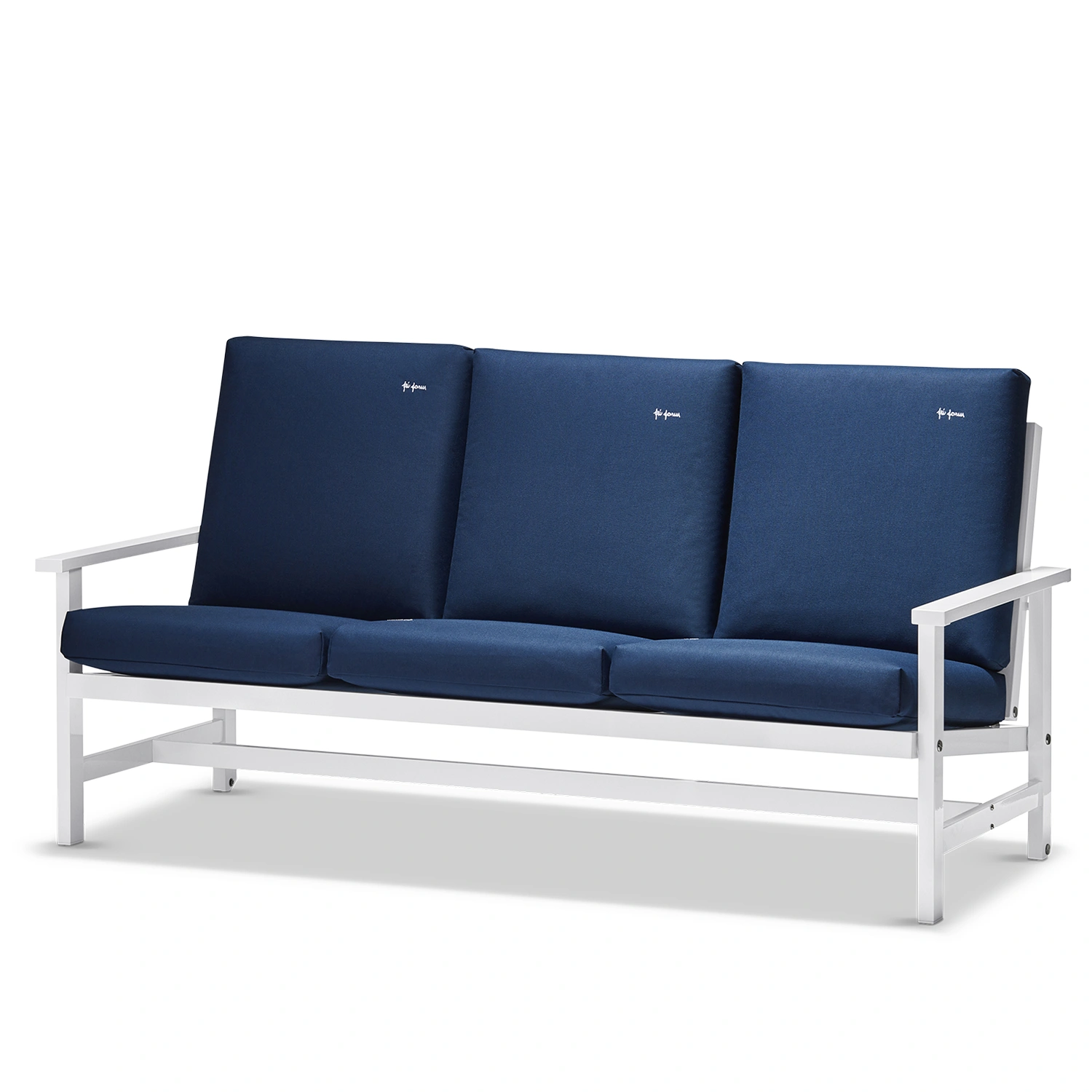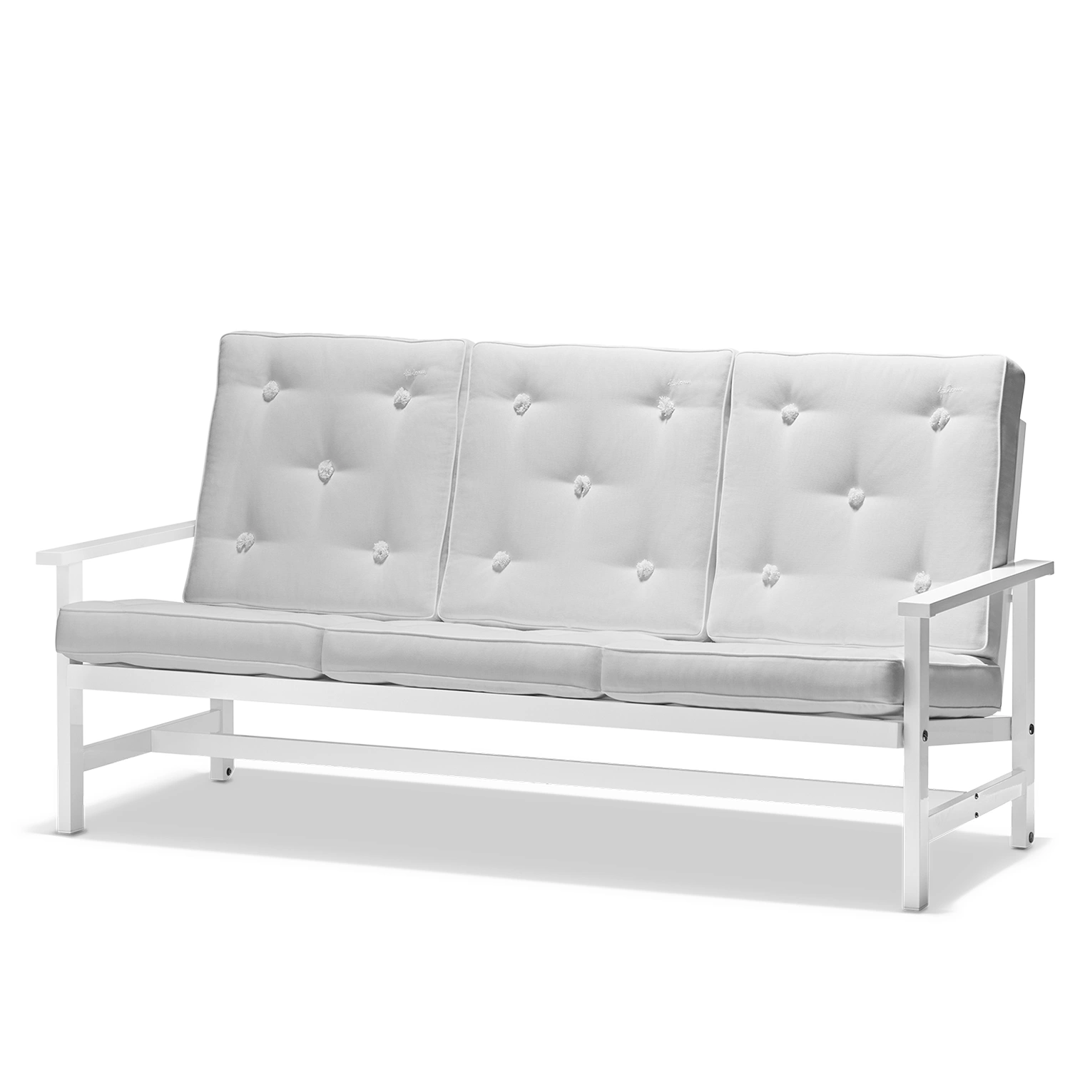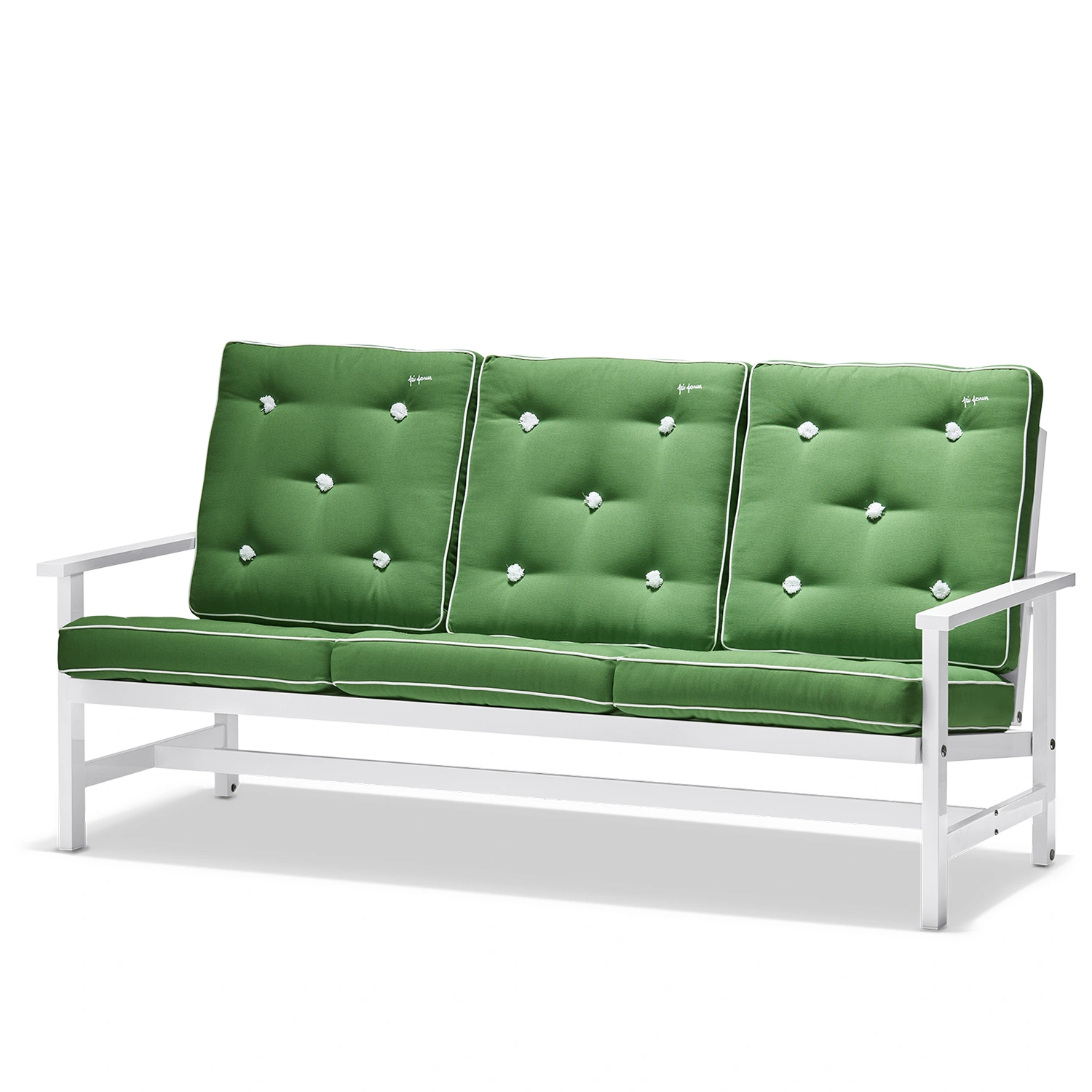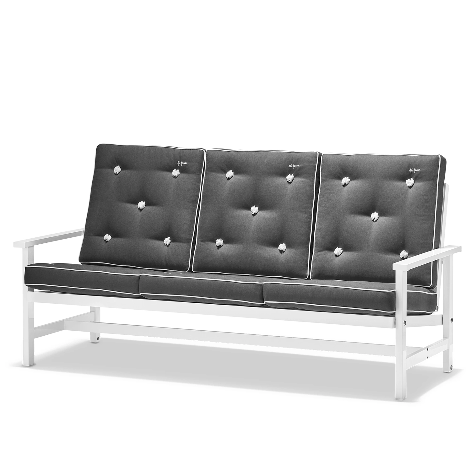 Soffa 09 från Fri Form är en elegant 3-sitssoffa i vitlackerad aluminium som kombinerar tidlös design med hög funktionalitet. Den robusta stommen är tillverkad i aluminium och lackerad i en stilren vit finish som gör soffan helt underhållsfri och extremt väderbeständig. Tack vare aluminiumets naturliga egenskaper är möbeln både lätt och rostfri, vilket gör den enkel att flytta och perfekt anpassad för det nordiska klimatet. Soffan behåller sin form och färg år efter år, oavsett om den står på en solig altan, vid havet eller i en skyddad trädgårdsmiljö.