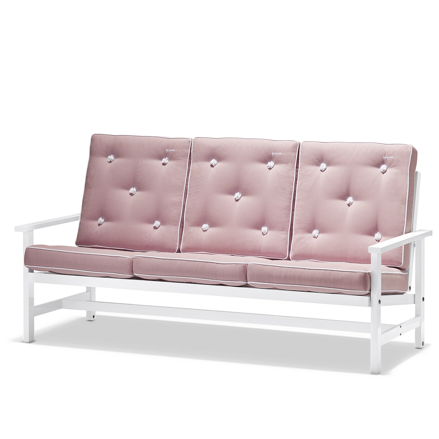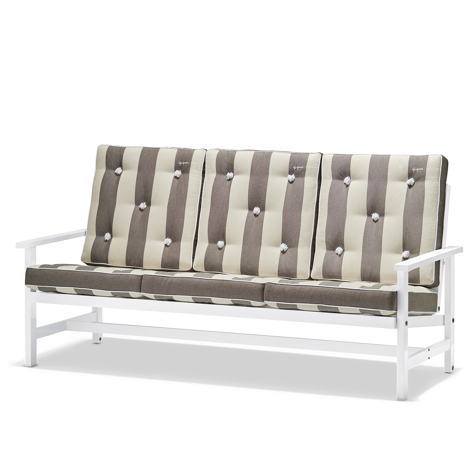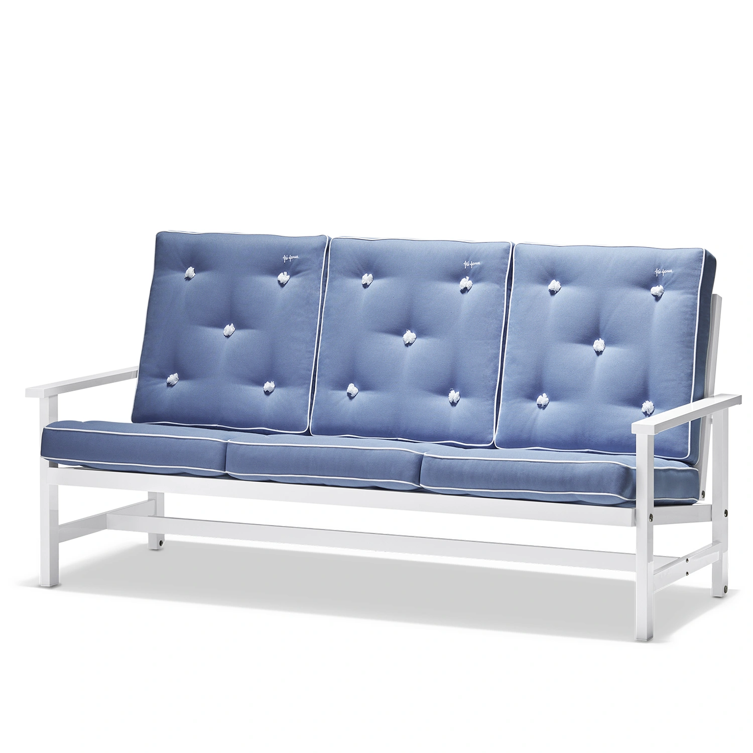 Soffan är tillverkad i aluminium med epoxylackerad yta som skyddar mot rost och slitage. Rengör enkelt med mild tvållösning och mjuk trasa. Undvik starka kemikalier och slipande material för att bevara den eleganta finishen. Möbeln kräver ingen ytterligare behandling och kan stå ute året runt, men vi rekommenderar möbelskydd vid längre perioder utan användning för bästa livslängd.