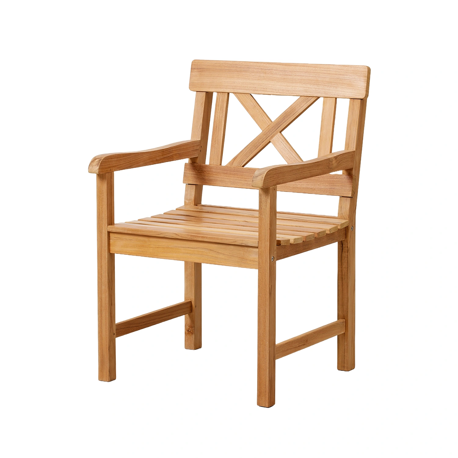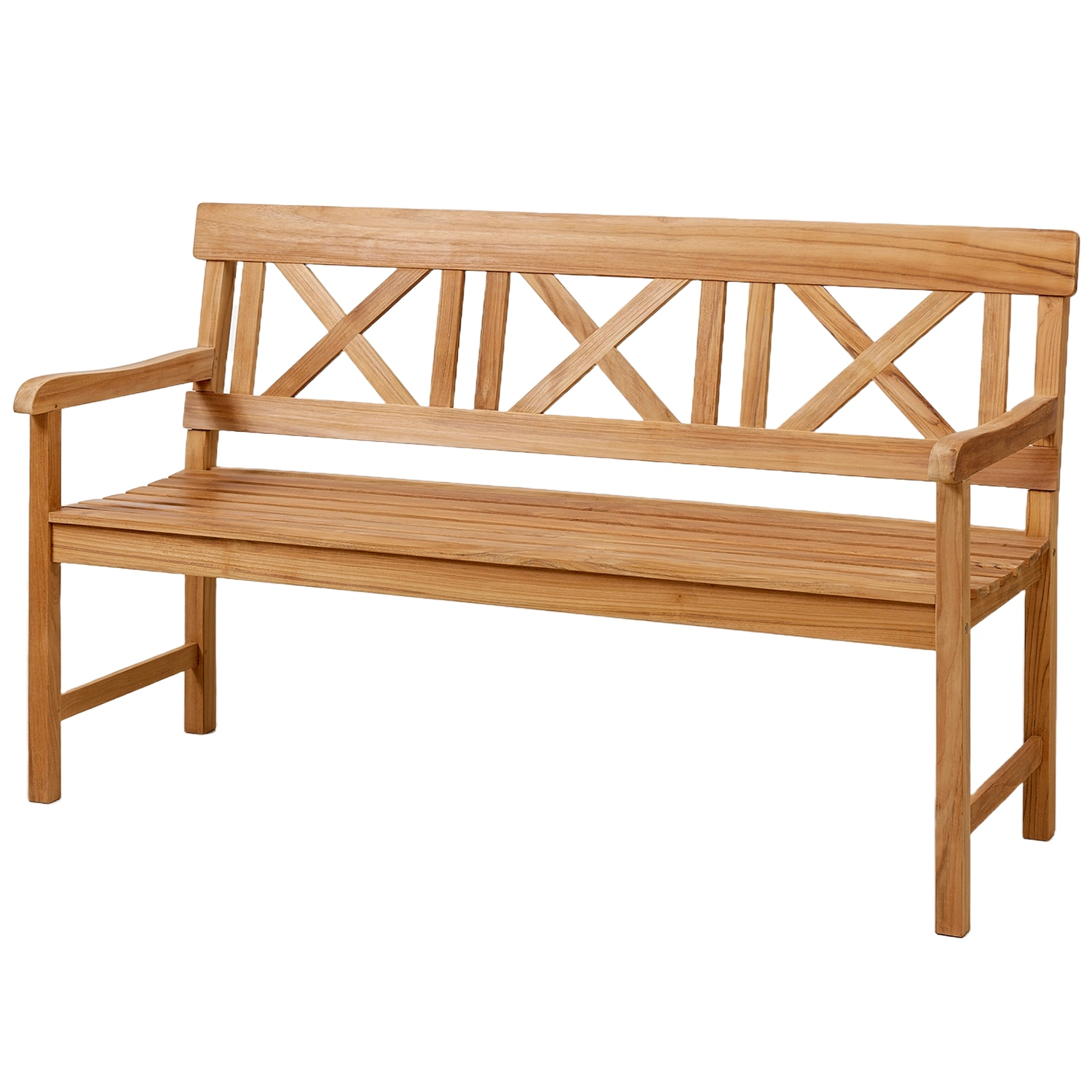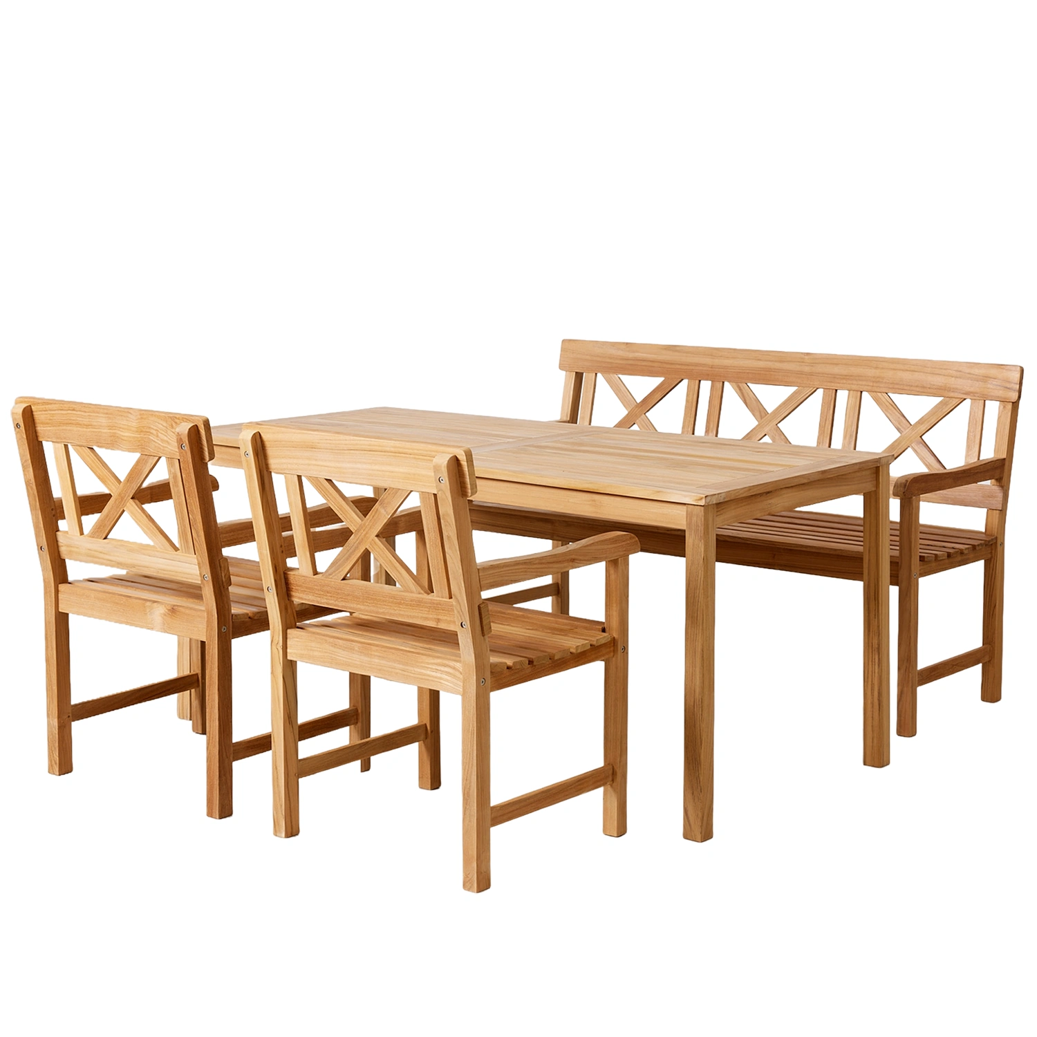Sofiero trädgårdsmöbelset i klassisk, skandinavisk obehandlad look i ljus massiv teak. Setet består av en bänk, två stolar och ett trädgårdsbord. Perfekt för långa sommarkvällar på terrassen eller i trädgården. Kuddar kan köpas separat.