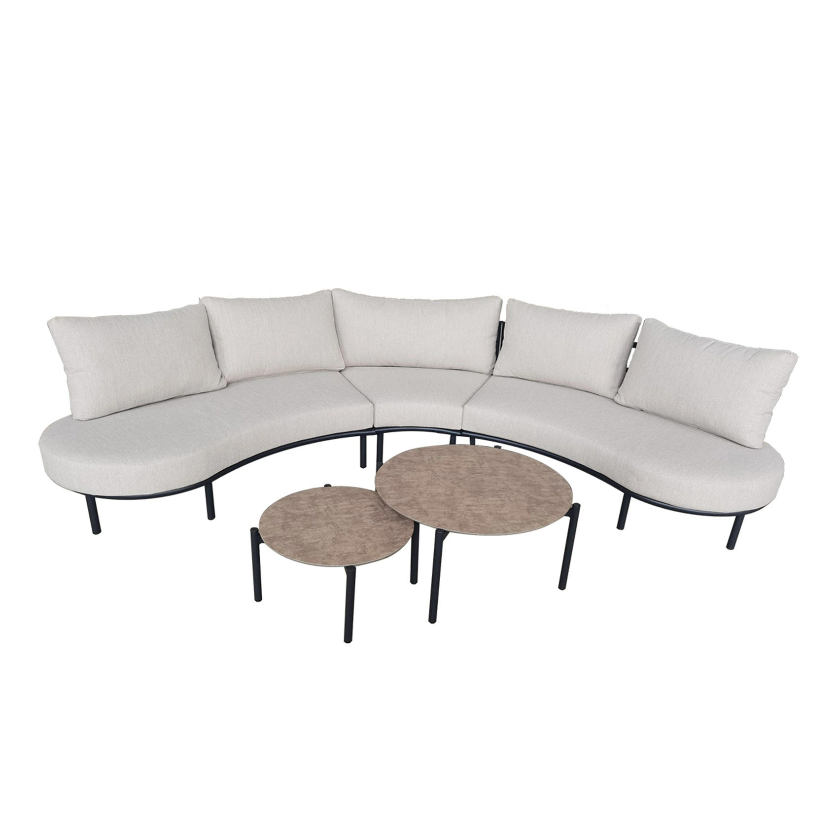 Solnäs bjuder på en mjuk och inbjudande sittupplevelse med sina organiska, lekfulla former som skapar en unik balans mellan komfort och modern estetik. Den lätta aluminiumramen kombineras med beigea dynor i olefin, som både är bekväma och tåliga.