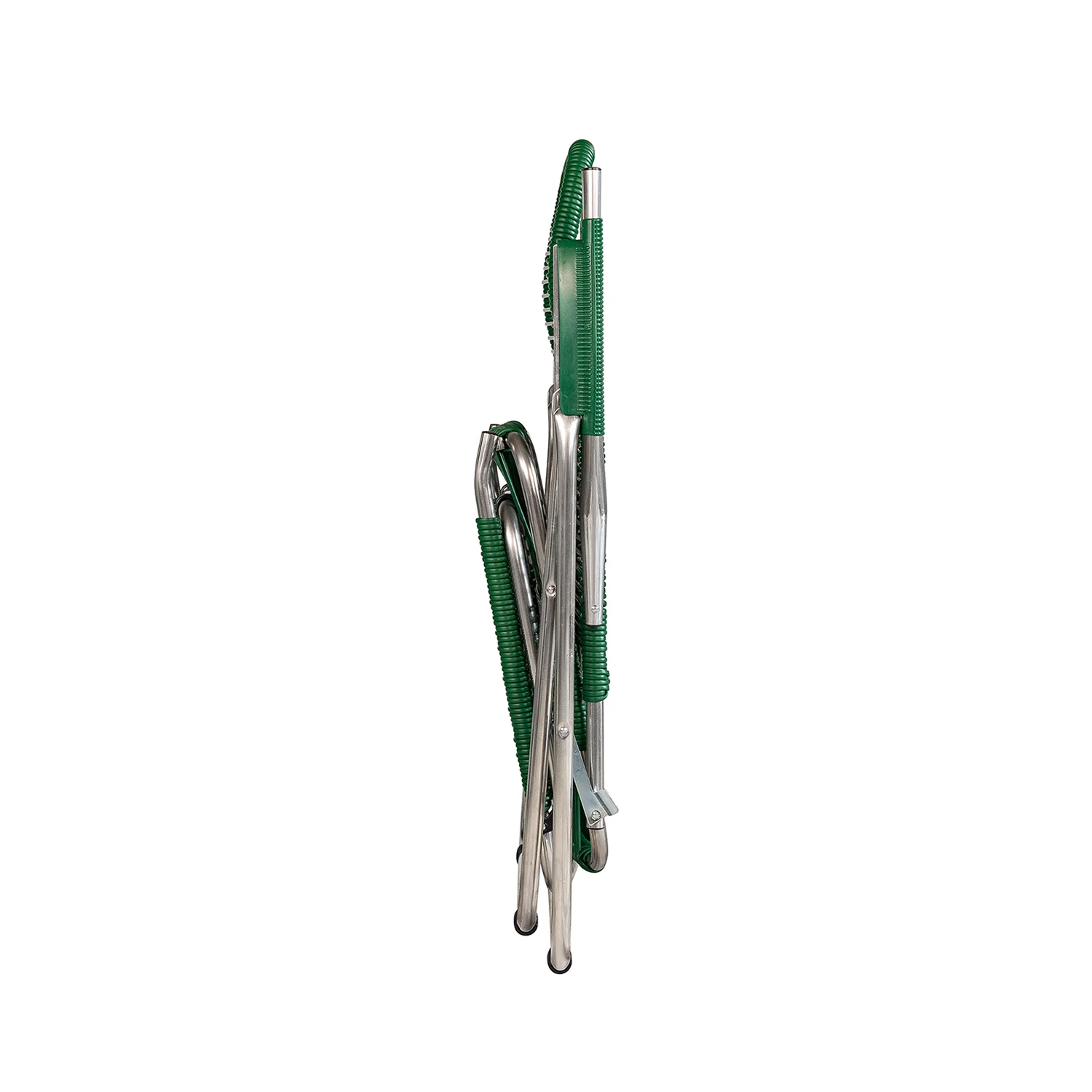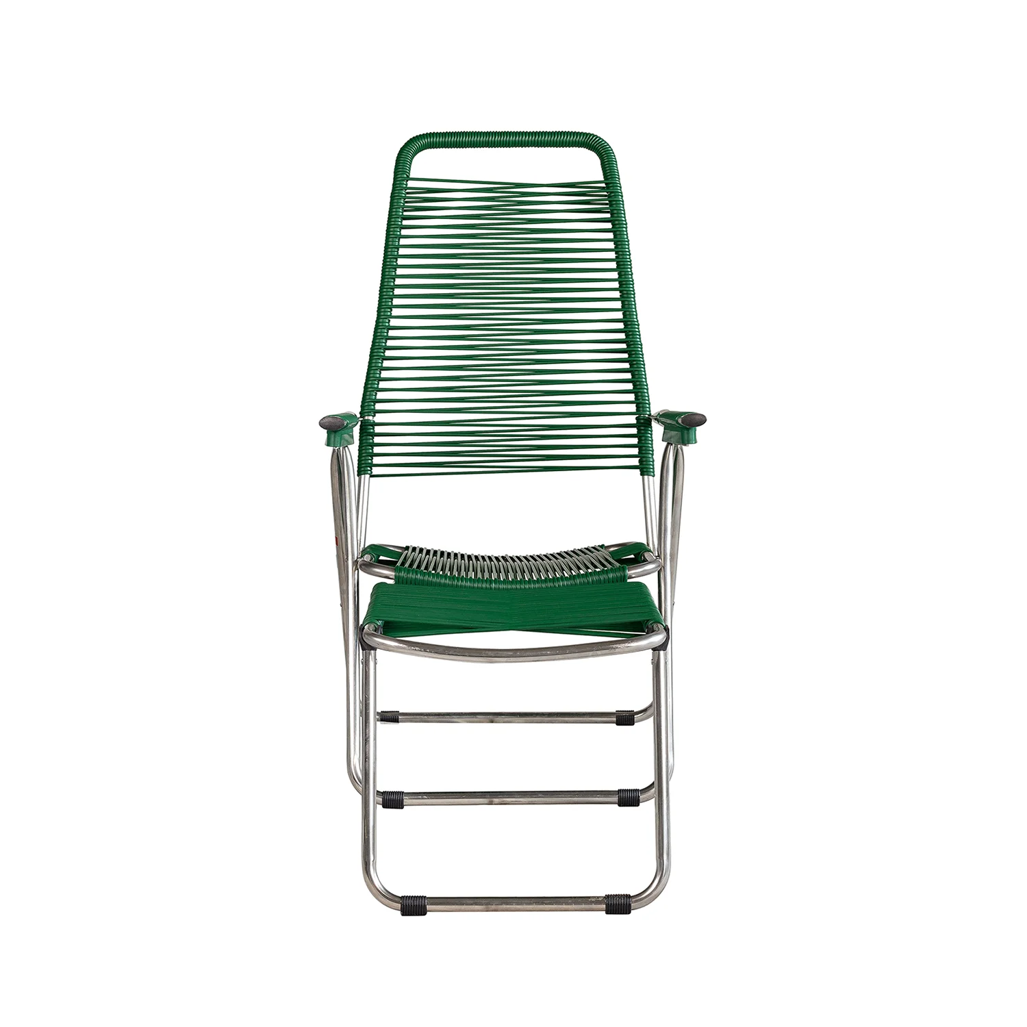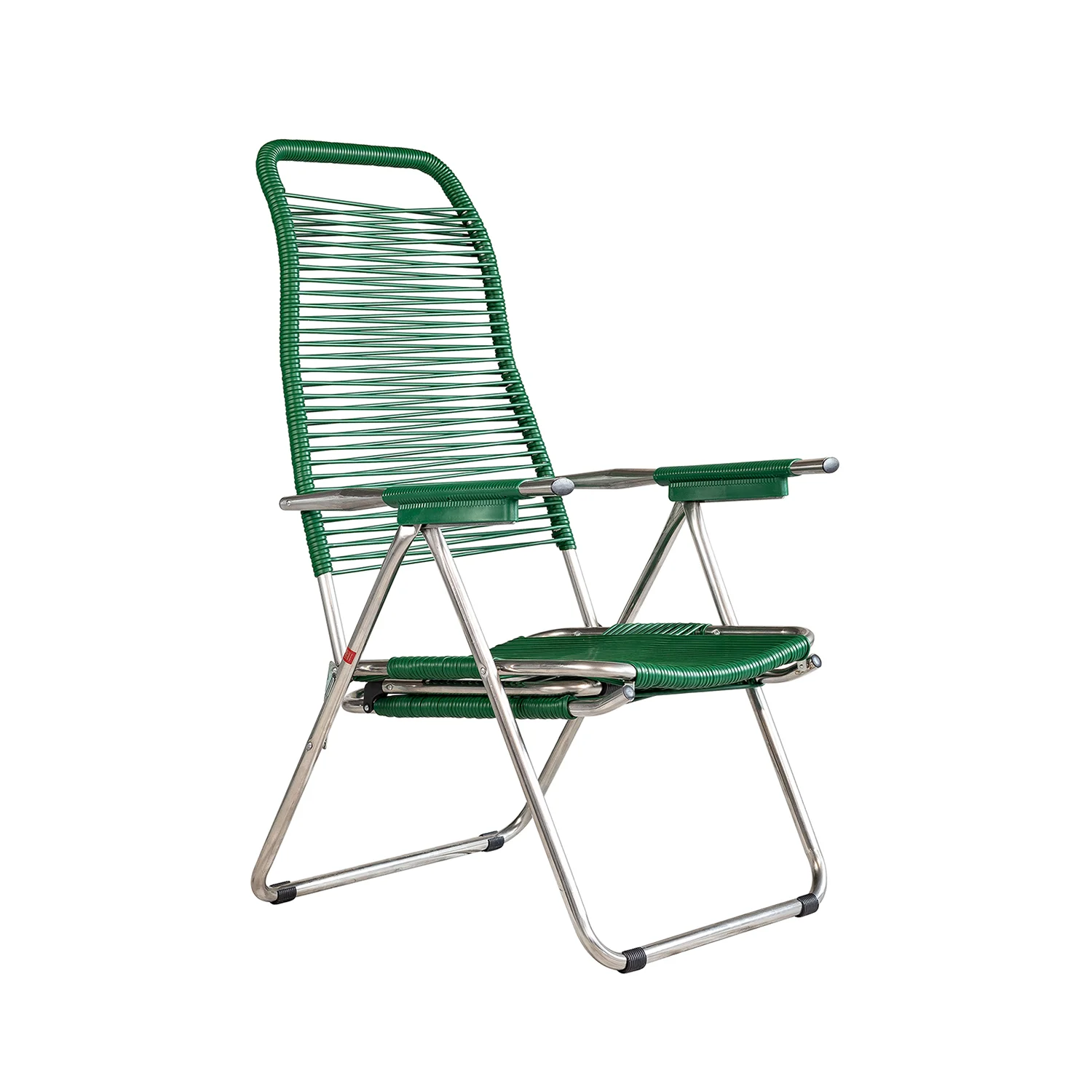 Stolen är tillverkad i aluminium och snören i PVC-plast vilket gör den underhållsfri och tålig för väder och vind. Stolsryggen går att ställa i fyra olika lägen, fotstödet går att ställa i två lägen samt fällas upp under stolen. Spagettistolen går lätt att fälla ihop för förvaring. Finns i flera olika färger och visas här i en matt mörk grön färg på plastbanden med aluminiumstativ.
