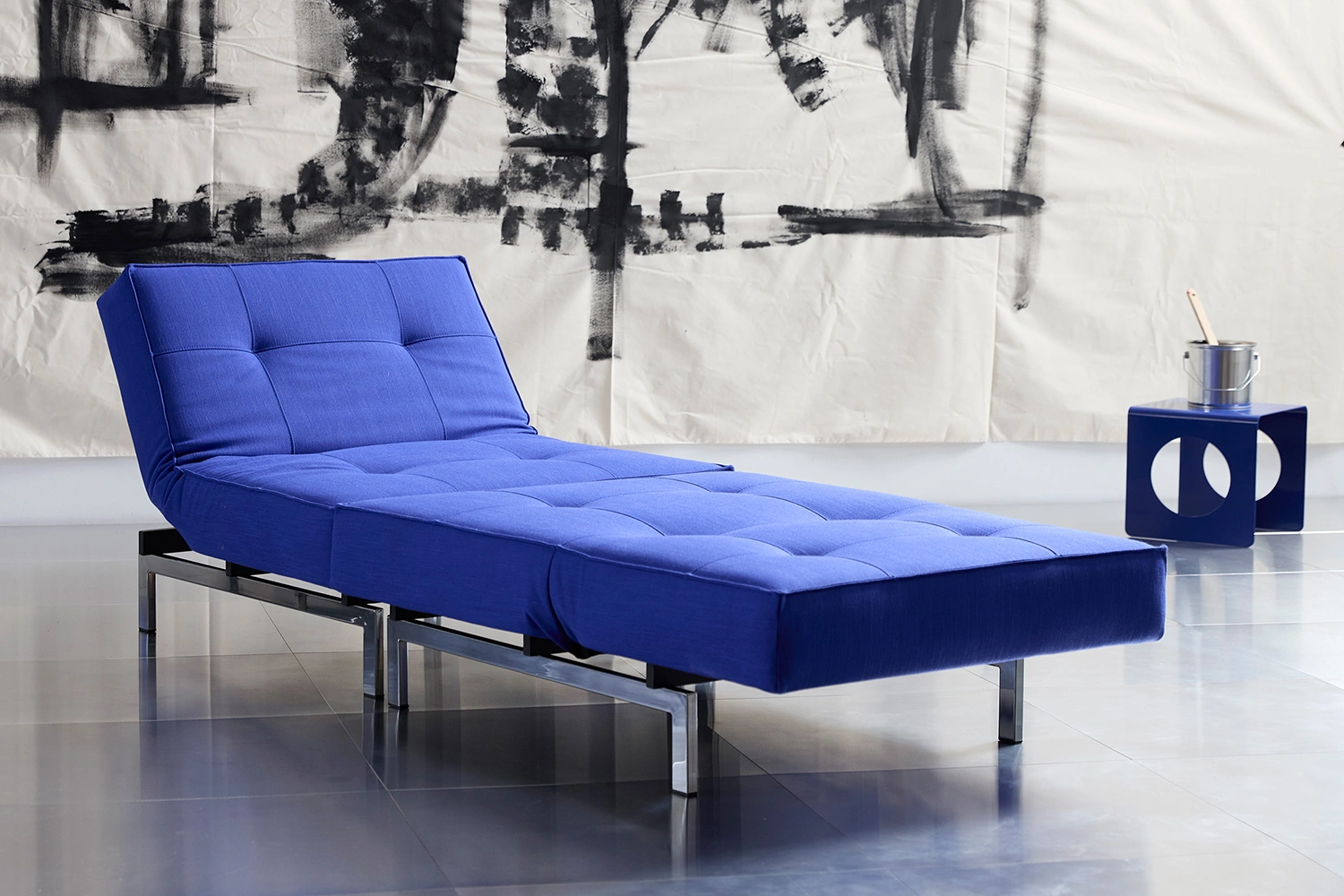 Fåtölj i serien Splitback från Innovation Living. Fåtöljen visas här som modellen Chrome med kromade ben. Den fällbara ryggen på fåtöljen gör Splitback till en mycket flexibel möbel.
