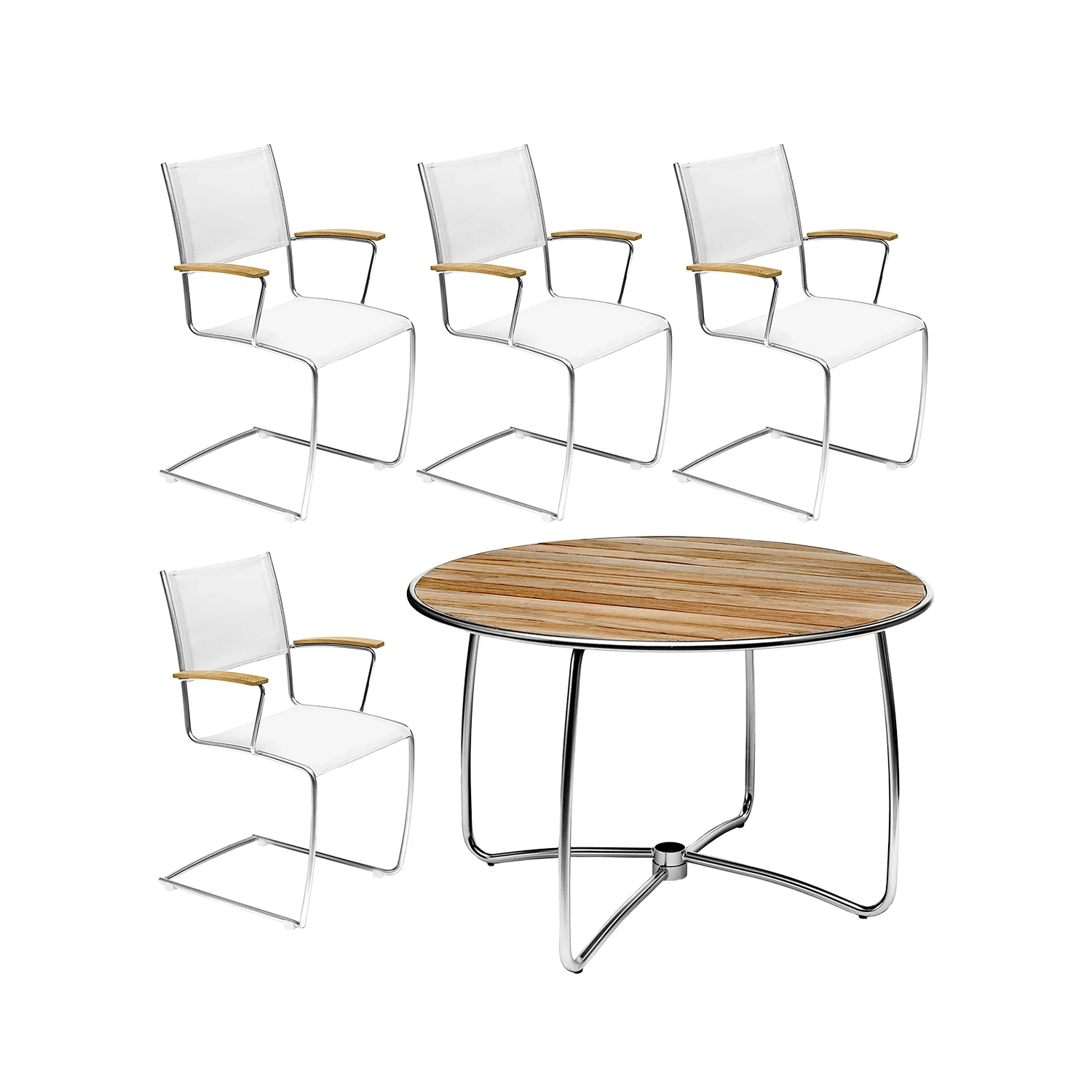 Kvaliteten har också uppgraderats i förhållande till tidigare varianter. Alla trädetaljer tillverkas av teak som är det överlägset bästa träslaget för möbler utomhus. Listerna är formade för att ge maximal sittkomfort och ett mjukt inbjudande utseende. Varje list har sina egna, rejält tilltagna fästöron för att inget ska synas i mellanrummen och störa de sköna linjerna. I trädetaljerna sitter insatsmuttrar och de fästs vid stativet med gängad maskinskruv som försänks på baksidan för att inget störande ska sticka ut. Genom att använda denna typ av infästning istället för den billigare vanliga träskruven sitter listerna stadigt fast och tål höga belastningar även i ett så pass mjukt trä som teak. Bordet har inte hål för parasoll som standard men kan göras utan kostnad om man uppger detta vid en eventuell beställning.