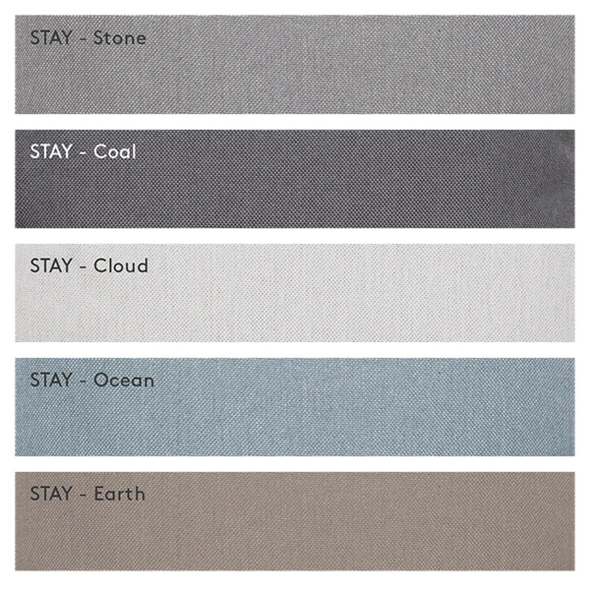 Stay är tillverkad i syntetiska material och är vattenavvisande och vädertålig. Om möbeln är blöt kan man torka av den och sedan låta den lufttorka. För bästa skydd mot smuts under säsong kan man använda ett passande möbelskydd. Det är då av vikt att möbeln inte är fuktig eller blöt när man sätter på skyddet.
