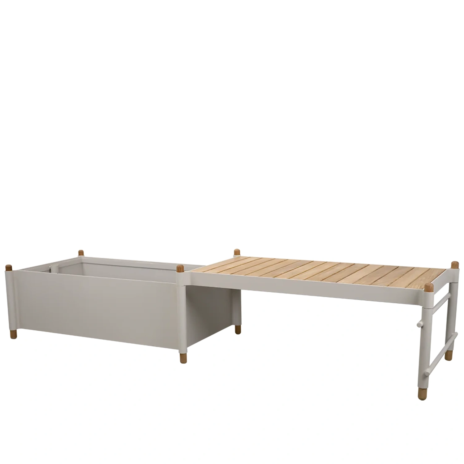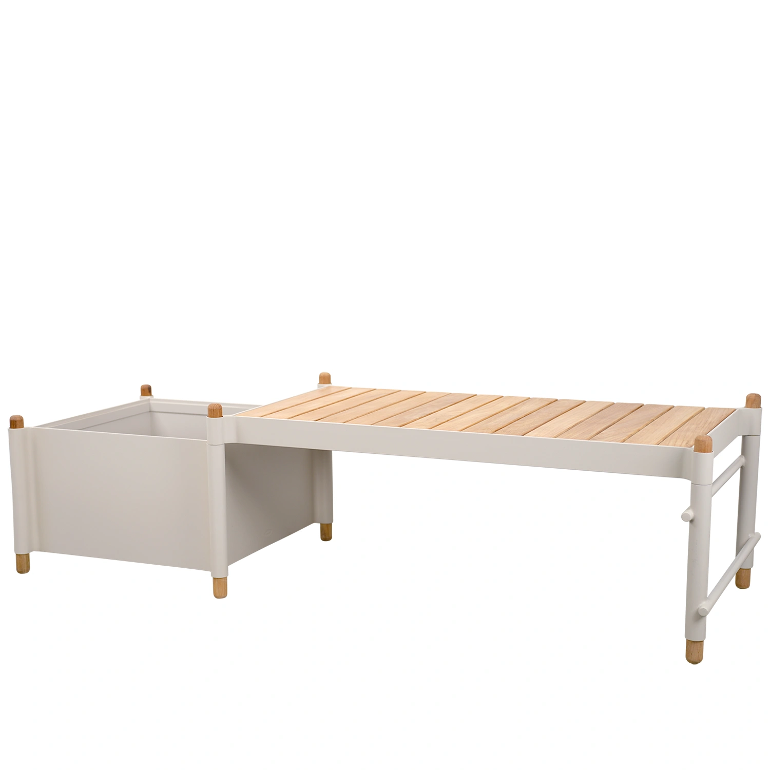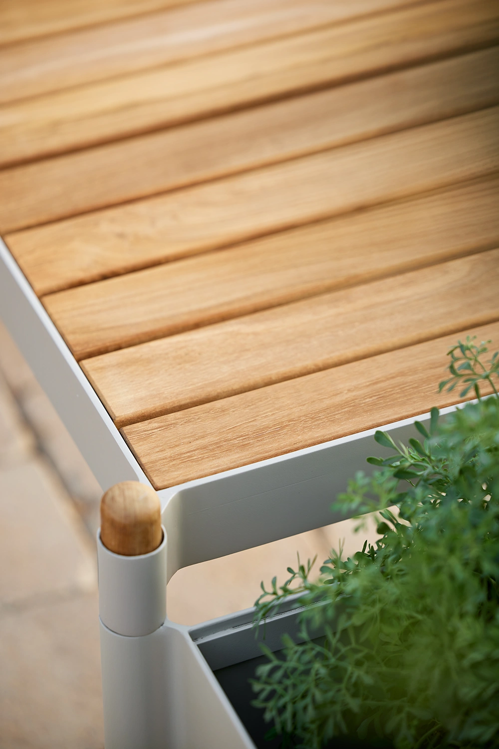 Sticks bänk med blomlåda kombinerar funktionalitet med elegant design inspirerat av en pinnekonstruktion. Designet har en naturlig och modern estetik, och den rymliga blomlådan i aluminium är robust och väderbeständig, vilket gör den idealisk för utomhusbruk. Bänken i förstklassig teak tillför både värme och komfort.