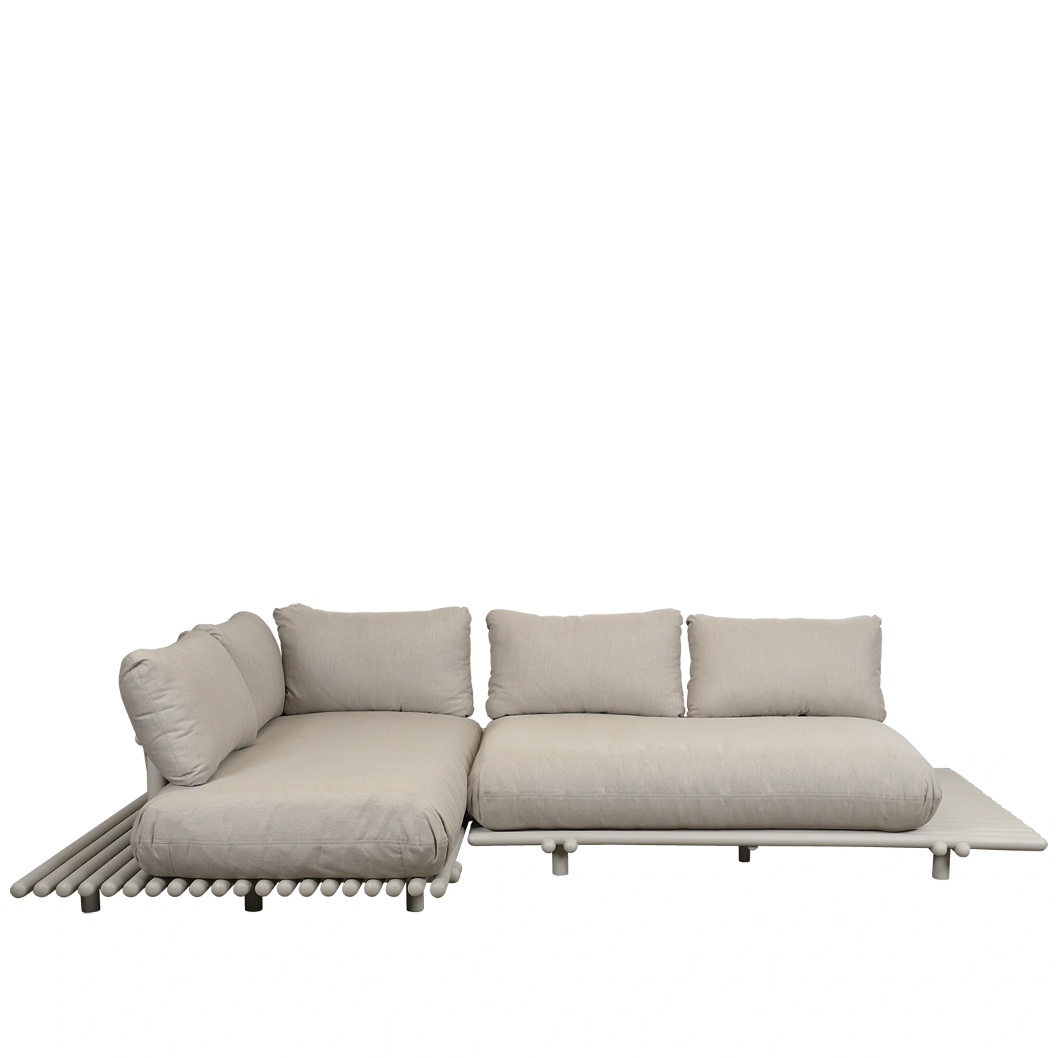 Soffan består av två Sticks Platform-moduler som skapar en avslappnad och inbjudande atmosfär. Placera en bordsskiva på Sticks Platform för att skapa plats för drycker, snacks eller dekorationer – ett stilfullt sätt att mixa material och skapa en personlig och elegant utomhusmiljö.