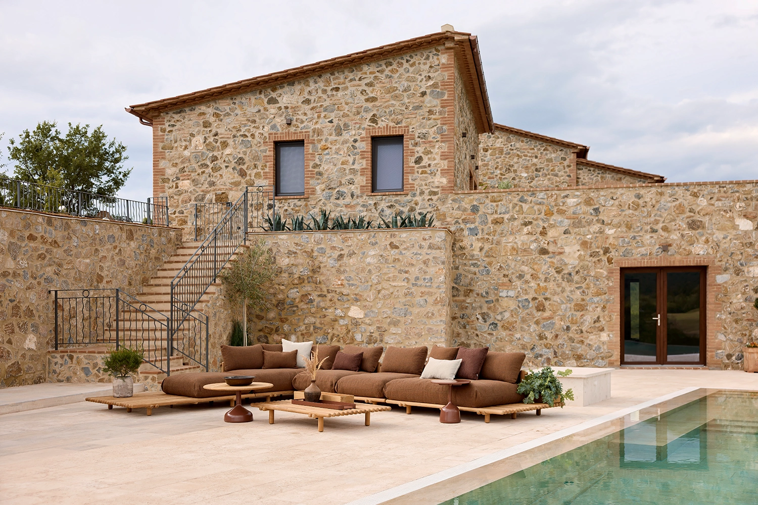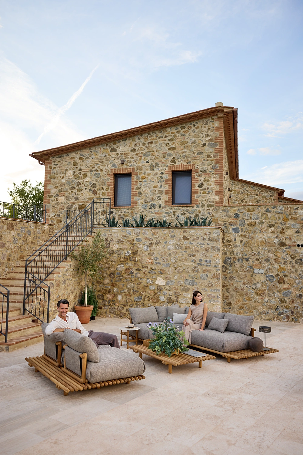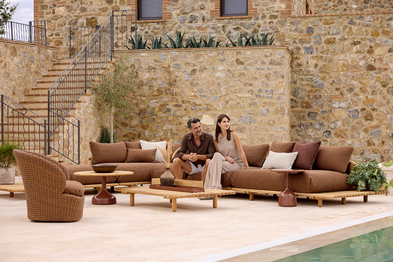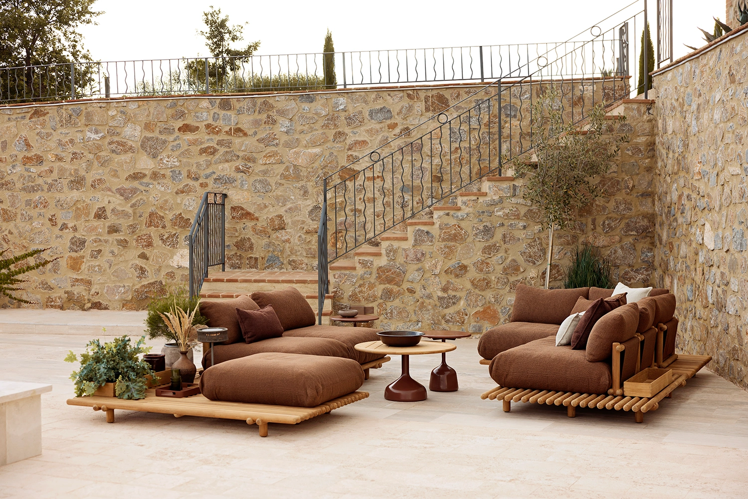 Med sitt modulära design skapar soffan en avslappnad och inbjudande utomhusatmosfär. Förbättra upplevelsen genom att placera en bordsskiva på Sticks Platform för att skapa plats för drycker, snacks eller dekorativa detaljer – ett elegant sätt att mixa material och tillföra en personlig och stilfull touch.