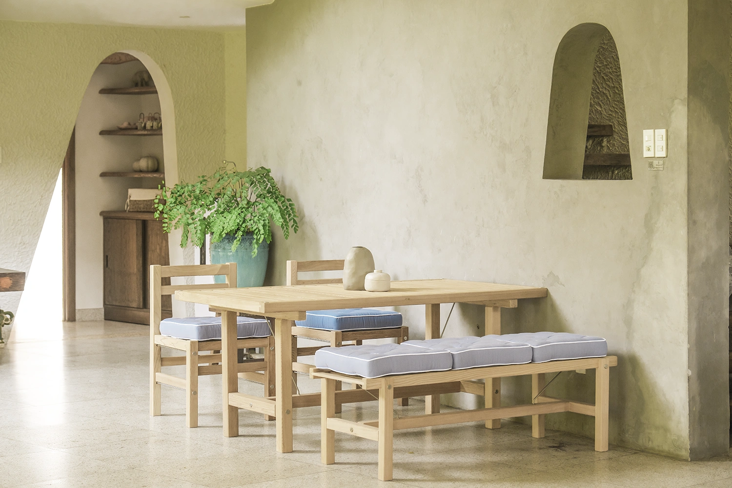 Materialet är inte bara estetiskt tilltalande – det är också naturligt motståndskraftigt mot väder och vind tack vare sina oljor och hartser. Kombinera med Fri Forms klassiska dynor i harmoniska färger för att skapa en personlig och stilfull uteplats.