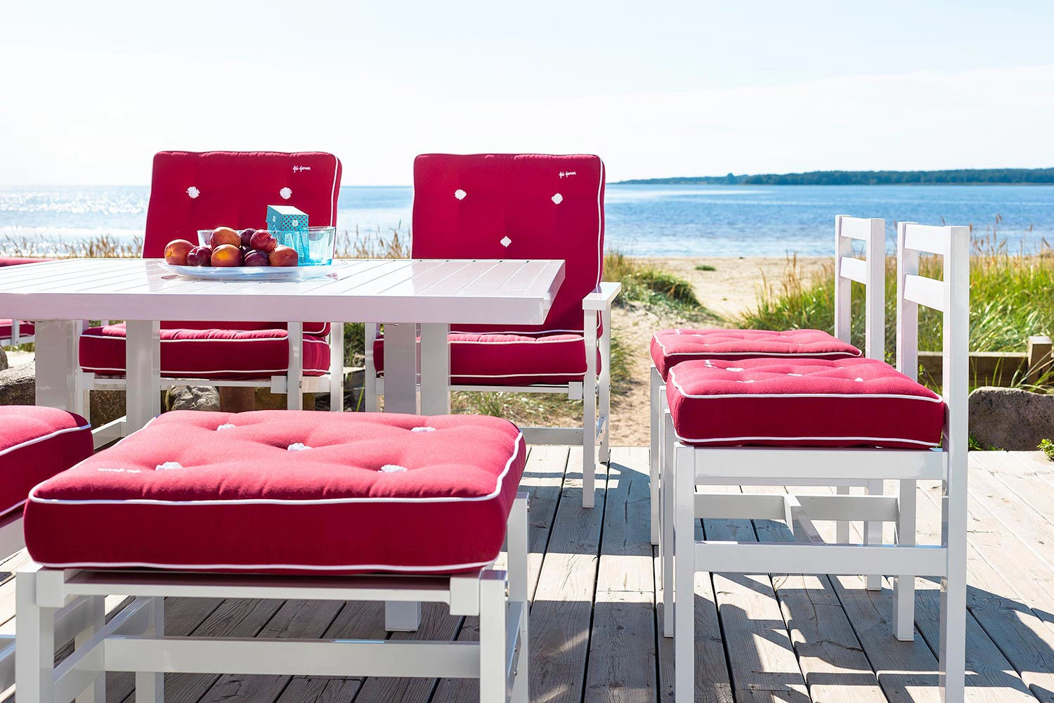 Fri Forms dynor är ett rent hantverk och tillverkas för hand från första sömmen till den sista knappen. Sömmerskor med många års erfarenhet gör all sömnad och en person stoppar varje dyna, vilket ger en unik kvalitet och känsla. Dynorna är både utsökta och bekväma, hållbara och vändbara. De tillverkas i tyg anpassat för utomhusbruk och är vatten- och smutsavvisande. Detaljer som passpoaler, vita kantband, tygklädda knappar och Fri Forms broderi kännetecknar serien. Dynorna finns i flera klassiska färger och kompletterar Fri Forms fåtölj.