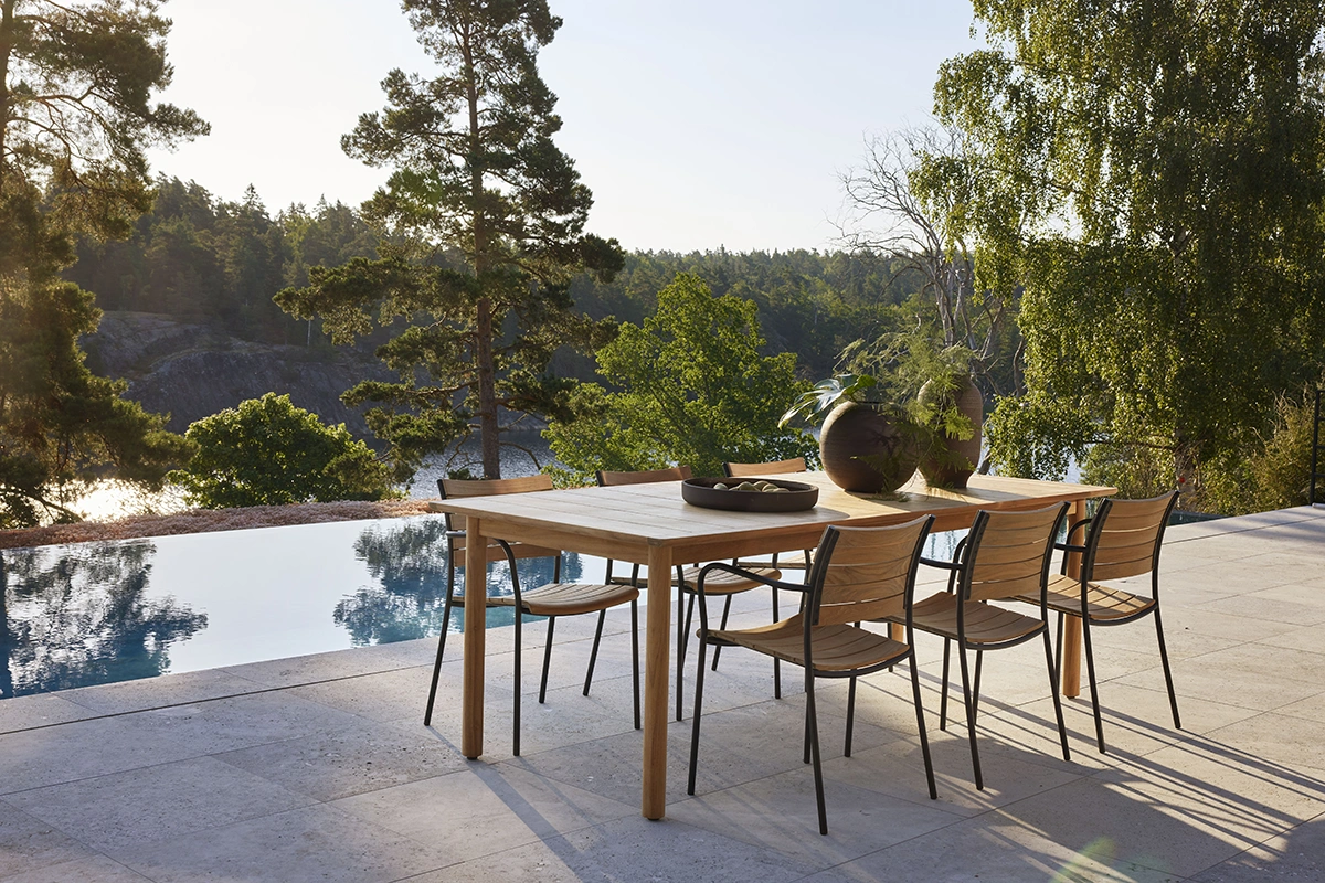 Sundal stol är skapad för livet utomhus – från uteserveringar och kaféer till privata uteplatser och balkonger. Den är tillverkad i teak med en ram i rostfritt stål som är pulverlackerad i svart, vilket ger en kombination av naturlig värme och industriell styrka. Konstruktionen är robust och anpassad för att klara alla tänkbara väder, året runt, utan att kompromissa med komfort eller estetik. Teaken kan oljas för att behålla sin gyllene ton eller lämnas obehandlad för att utveckla en vacker silvergrå patina över tid.