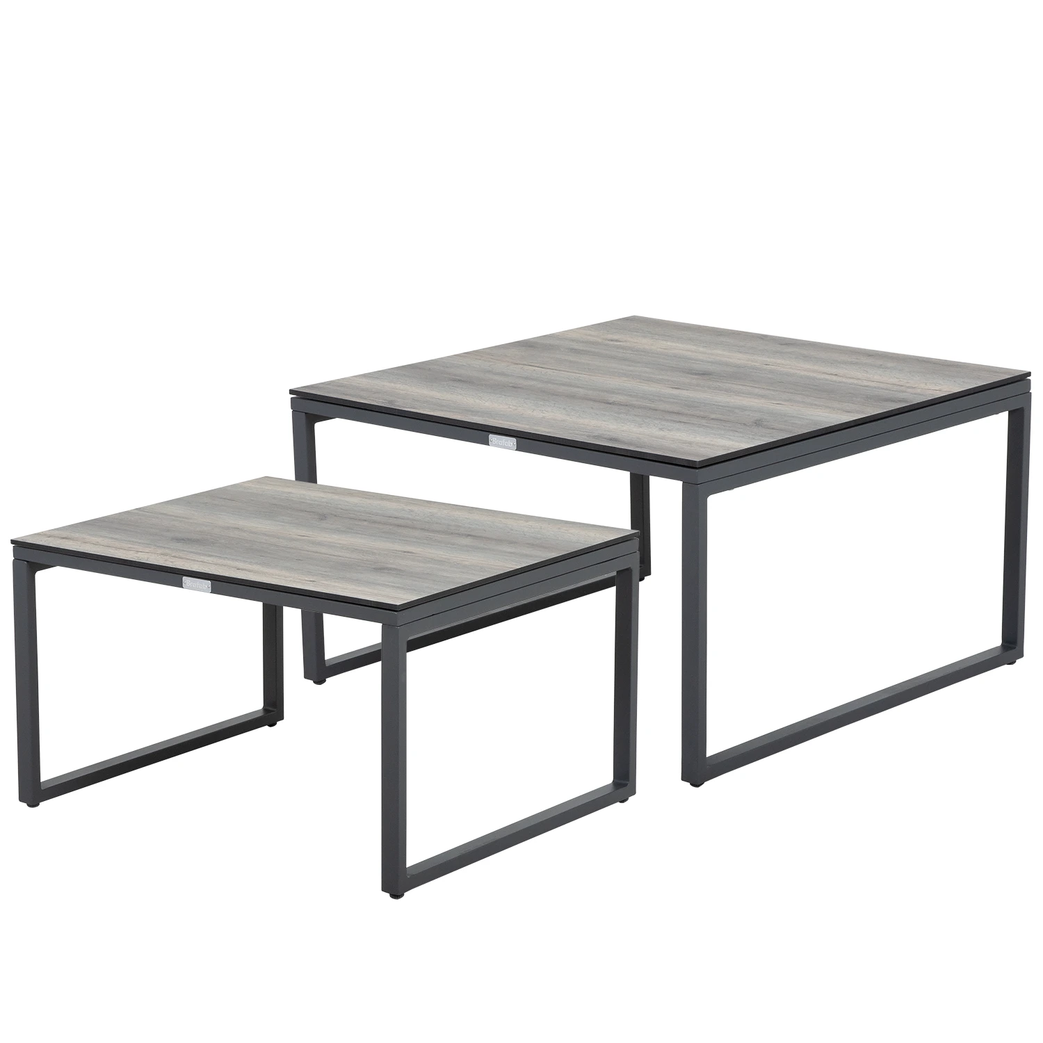 Bordsstativen är tillverkade i robust aluminium och designade för att användas i par. Det mindre bordet kan enkelt skjutas in under det större, vilket ger flexibilitet och sparar utrymme när det behövs. Denna funktion gör Talance soffbord perfekt för både stora och små uteplatser.