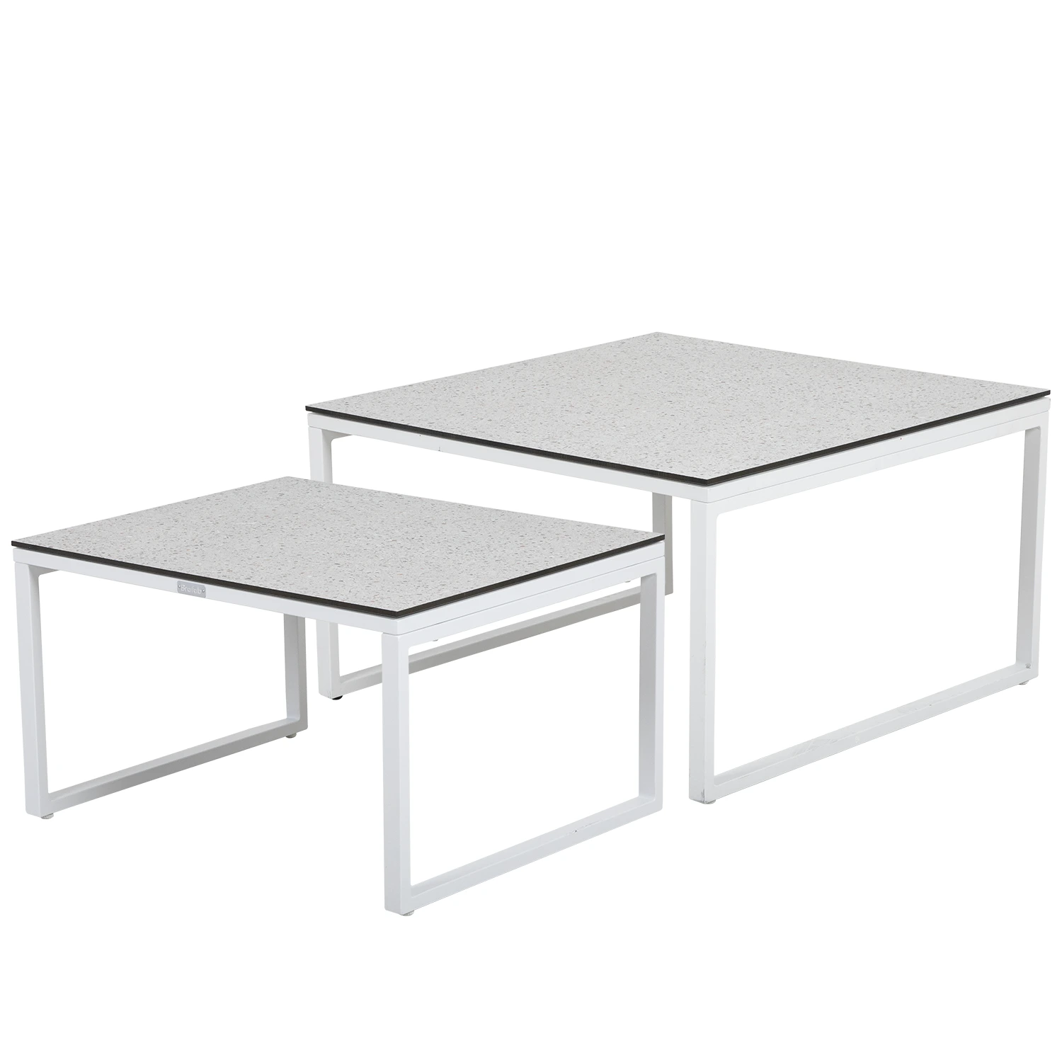 Bordsstativen är tillverkade i robust aluminium och designade för att användas i par. Det mindre bordet kan enkelt skjutas in under det större, vilket ger flexibilitet och sparar utrymme när det behövs. Denna funktion gör Talance soffbord perfekt för både stora och små uteplatser.