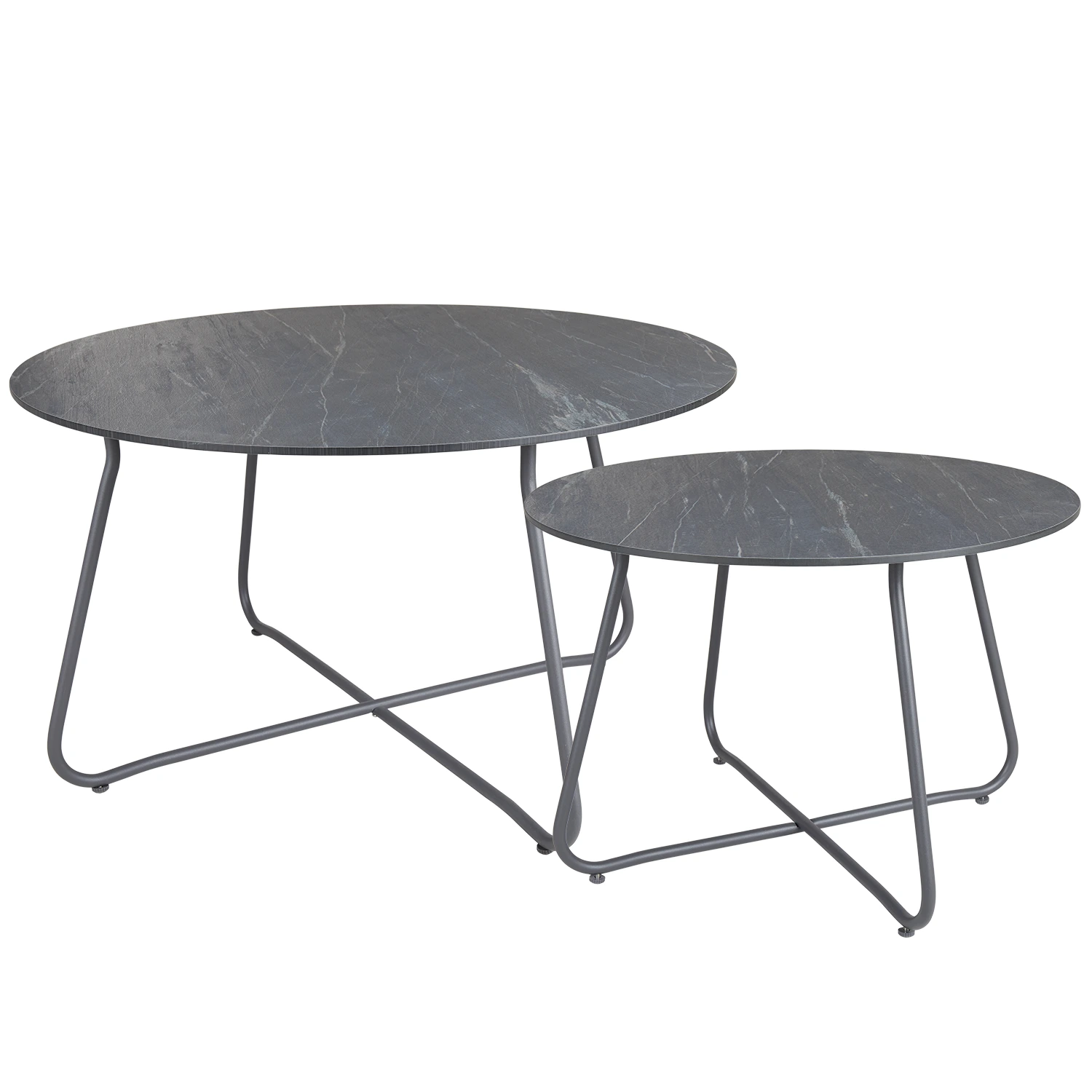 Taverny satsbord med två runda, tåliga bord i aluminium. Detta satsbord har robusta stålstativ med bordsskiva i antingen aluminium eller laminat, båda material som är utformade för att tåla väder och vind. Visas här med laminatskivor med mörkgrå, melerad stenlook som standardval.