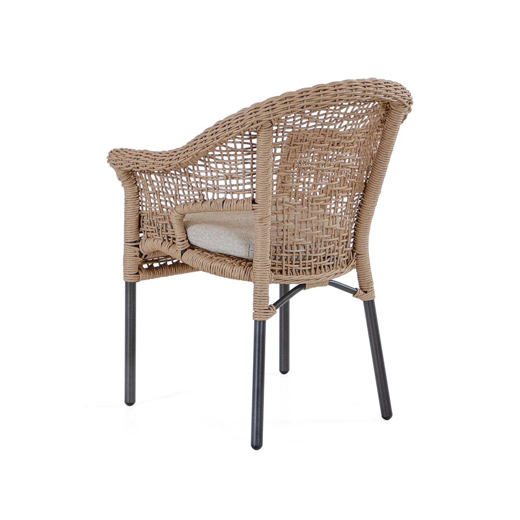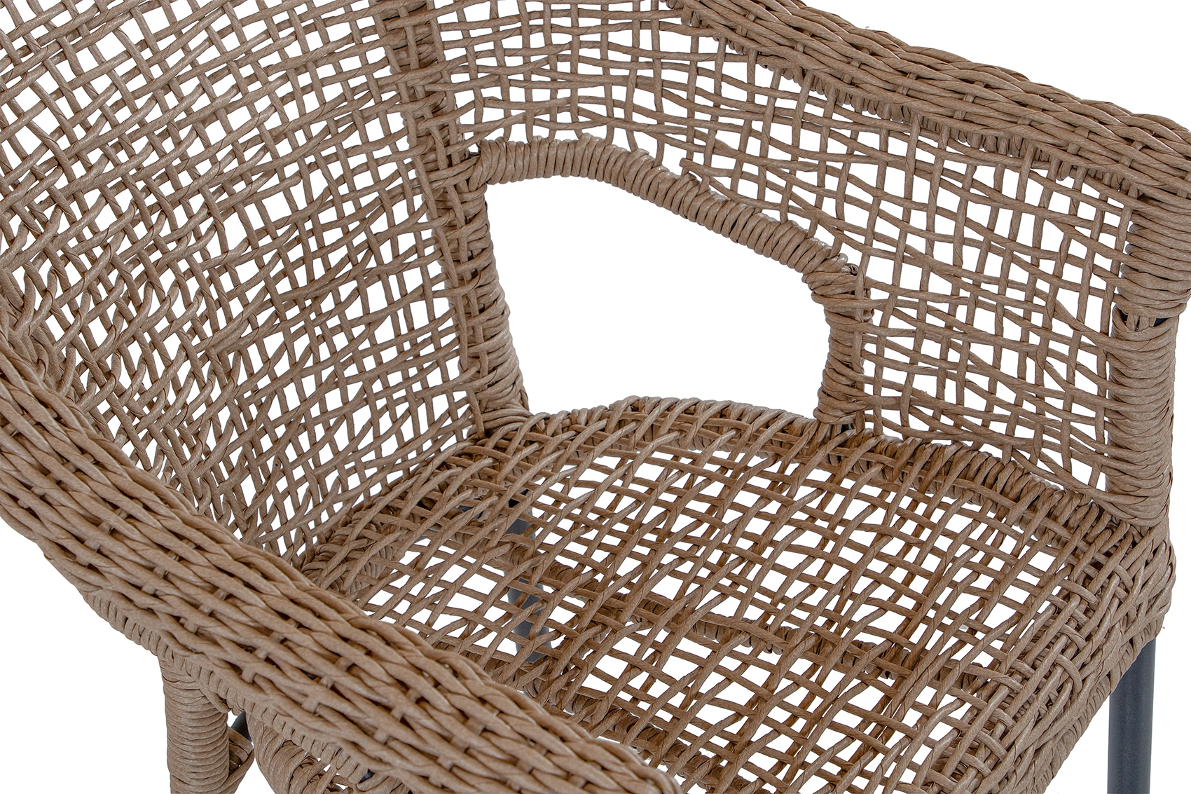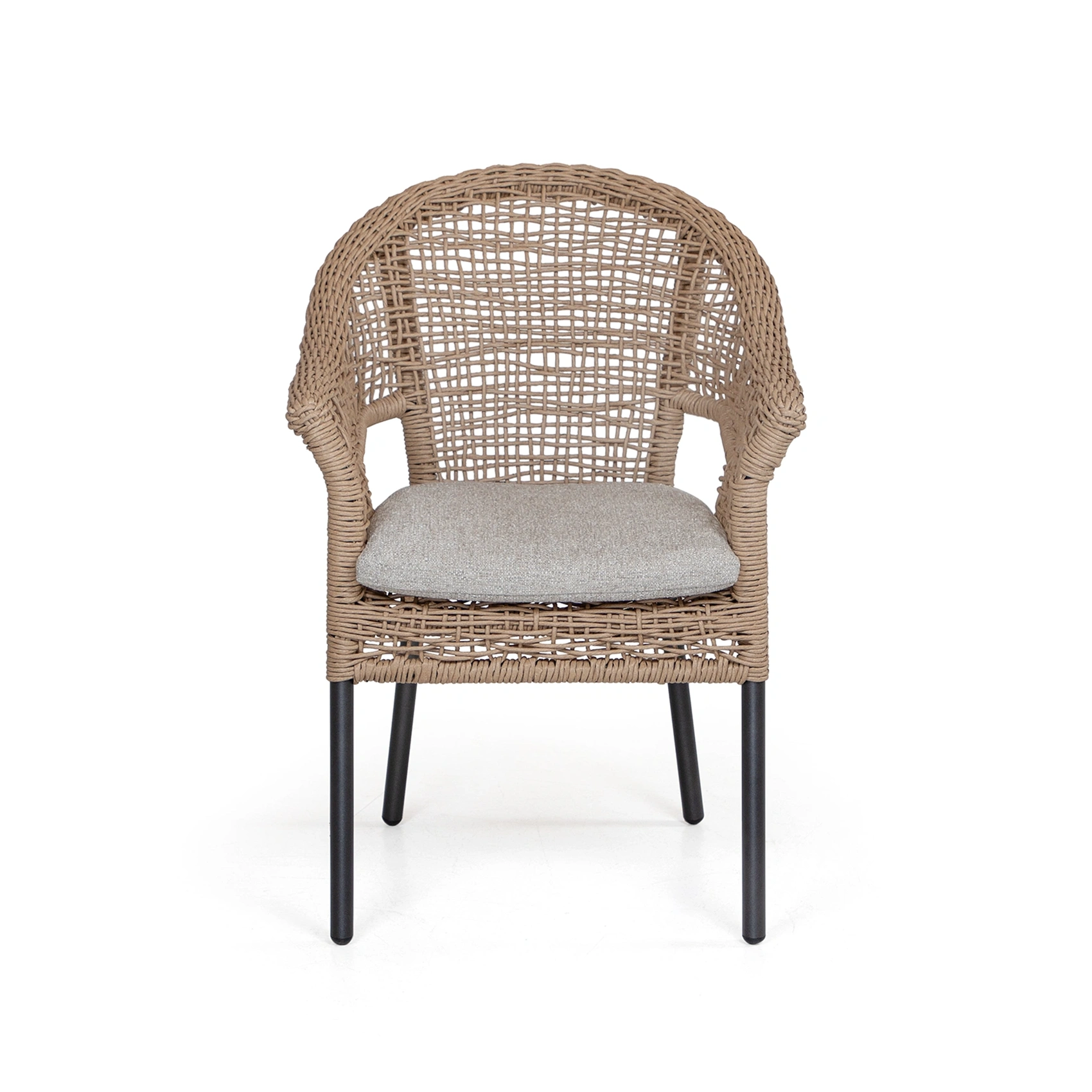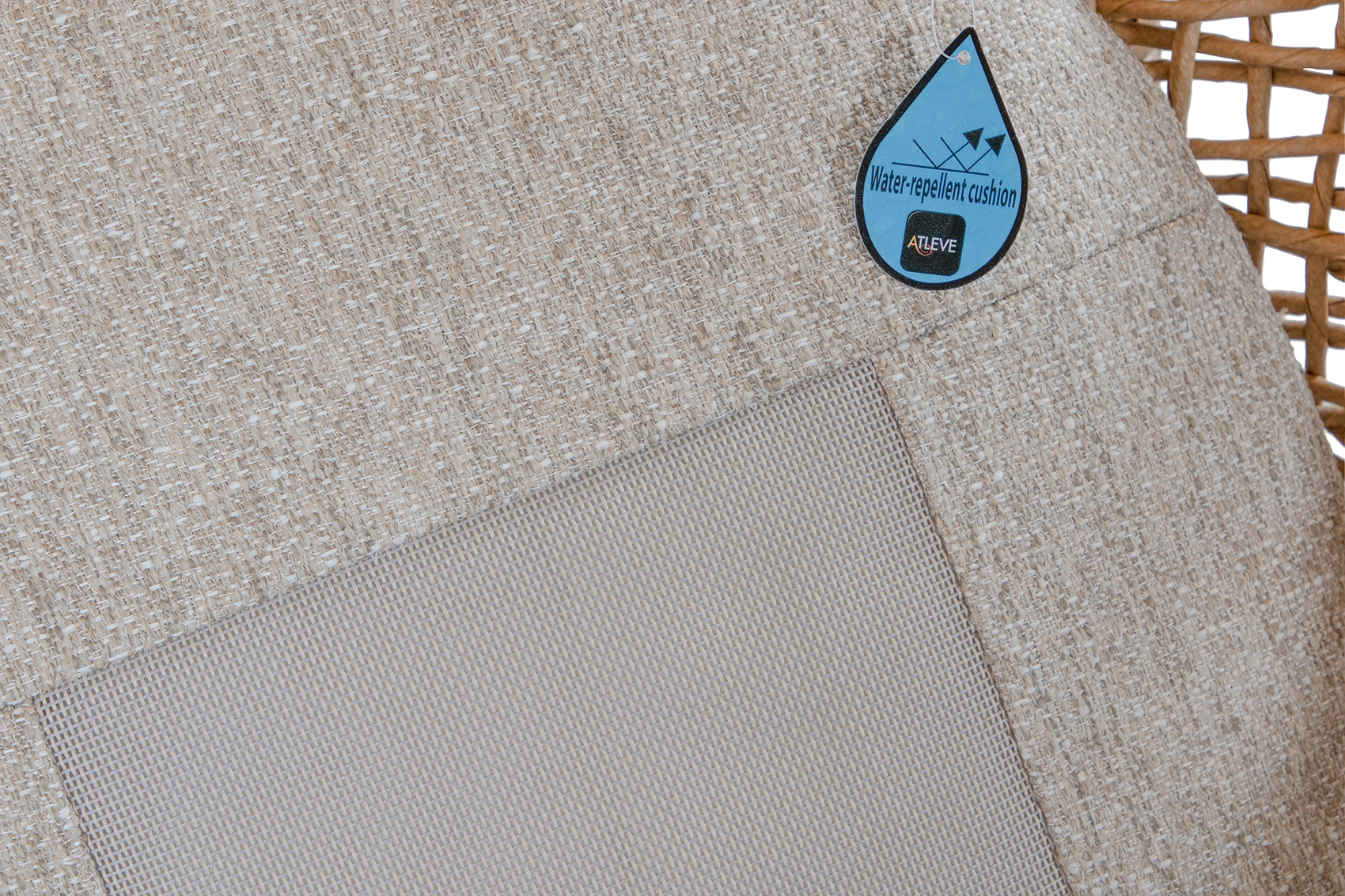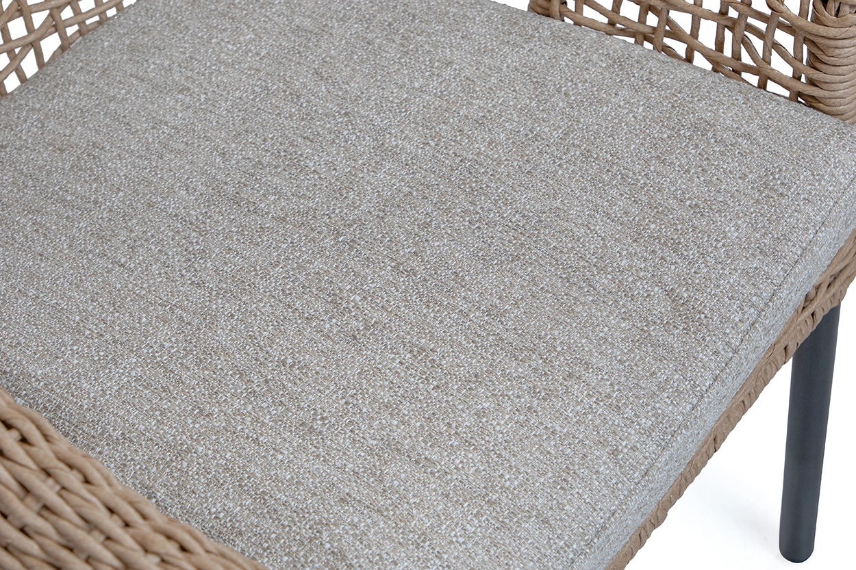 Tea Time karmstol är en prisvärd stol där dynan ingår. Stomme av aluminium och flätning av naturfärgad twist-flätad konstrotting som ger möbeln en levande struktur med variation i både riktning och täthet. Klädseln på sittdynan är i ett vattenavvisande bouclétyg för utomhusbruk och är dessutom avtagbart.