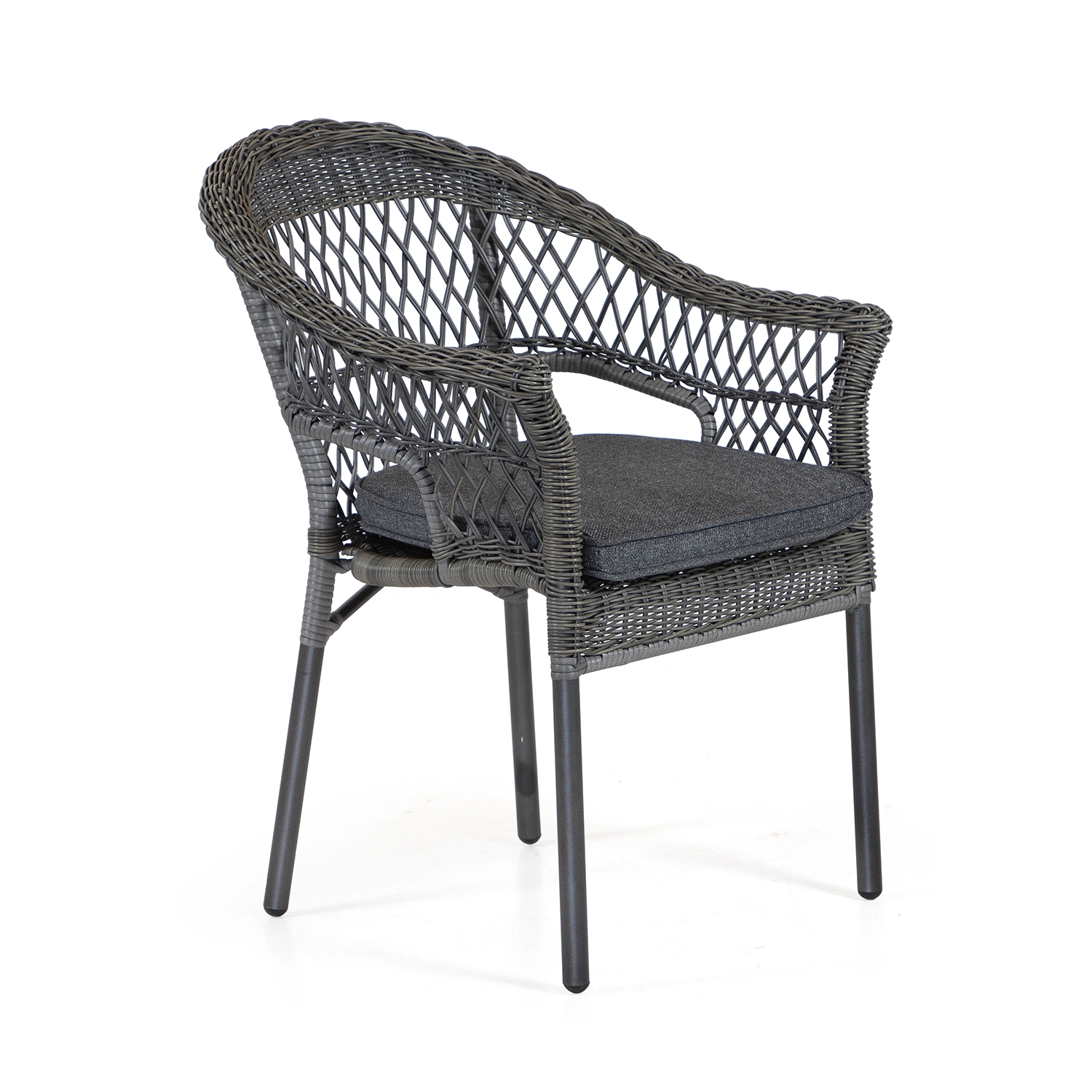 Tea Time karmstol i antracitgrå konstrotting tillsammans med Windsor cafébord i storlek Ø70 cm. Sittdyna i tåligt olefintyg till stolarna ingår. Både bordet och stolarna har en rund, antracitgrå tråd.