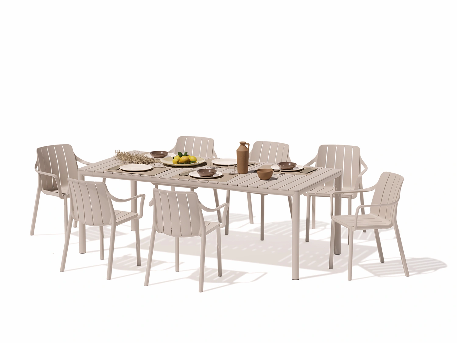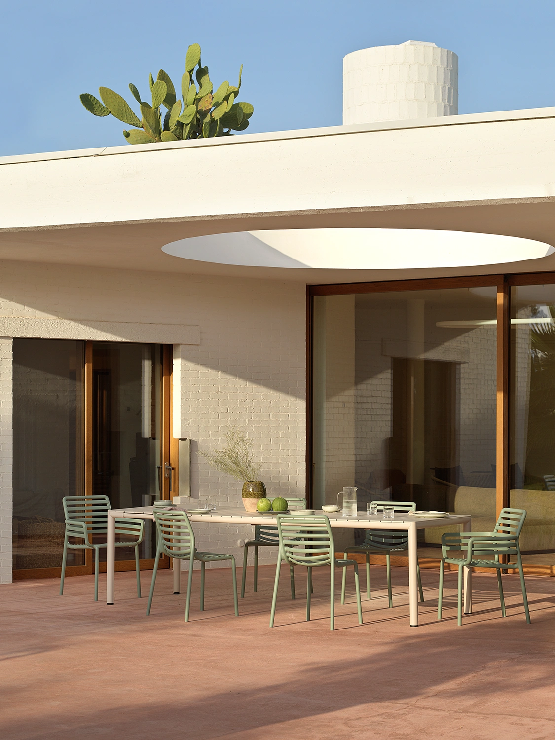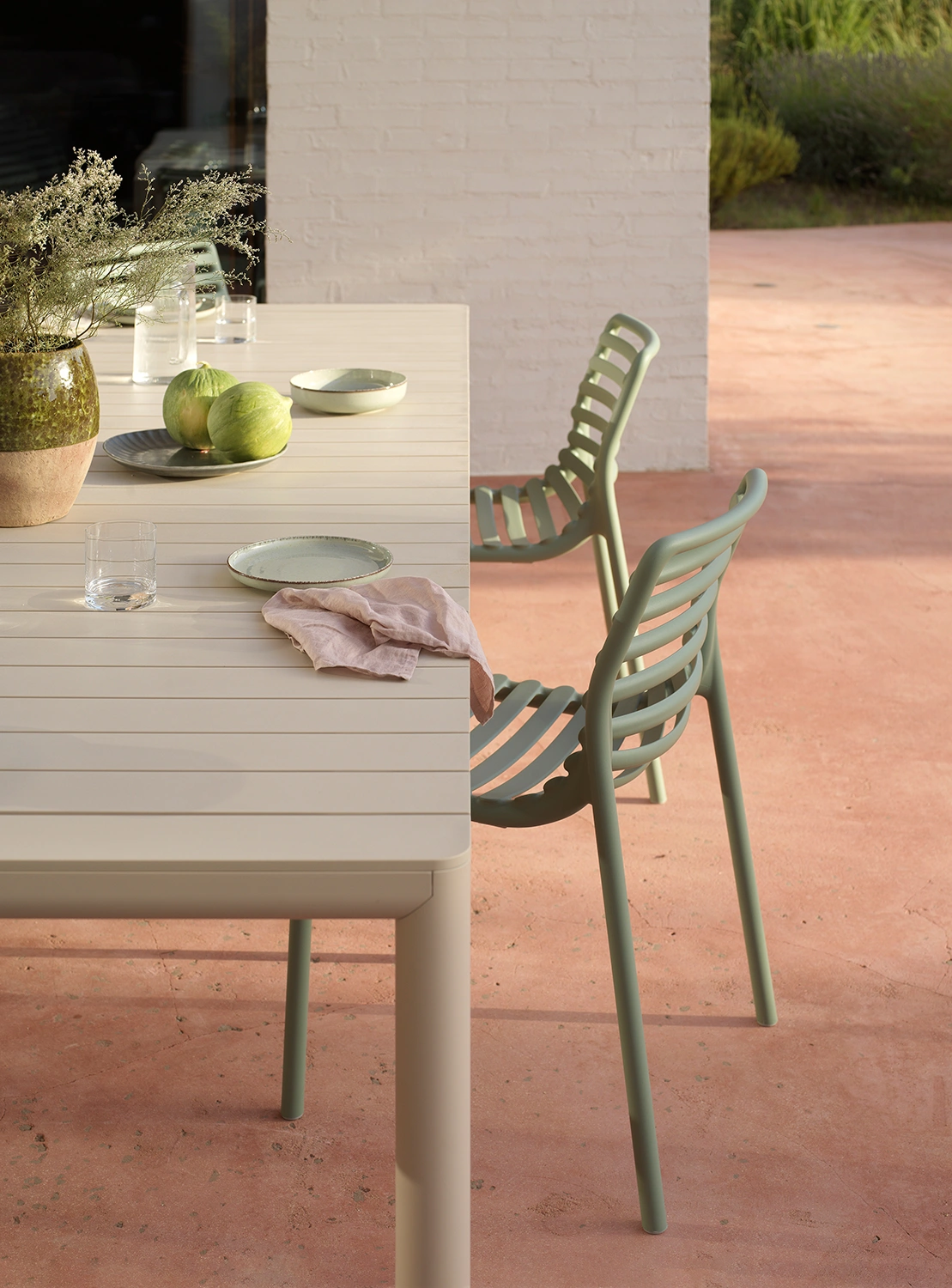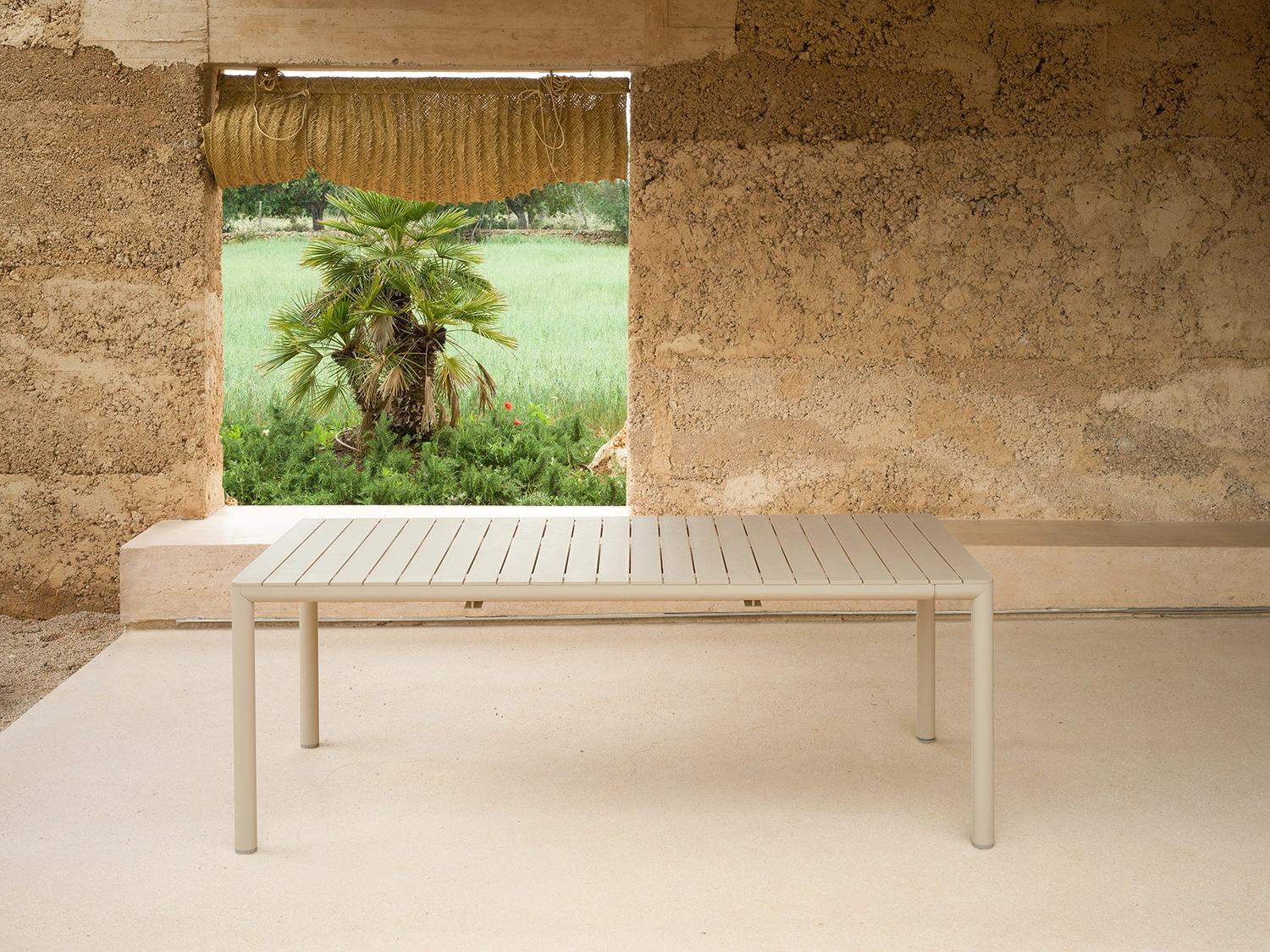 Designen på det miljövänliga Tevere utdragbara utomhusbordet har mjuka linjer, centrerade på frånvaron av skarpa kanter och de rundade formerna på benen.